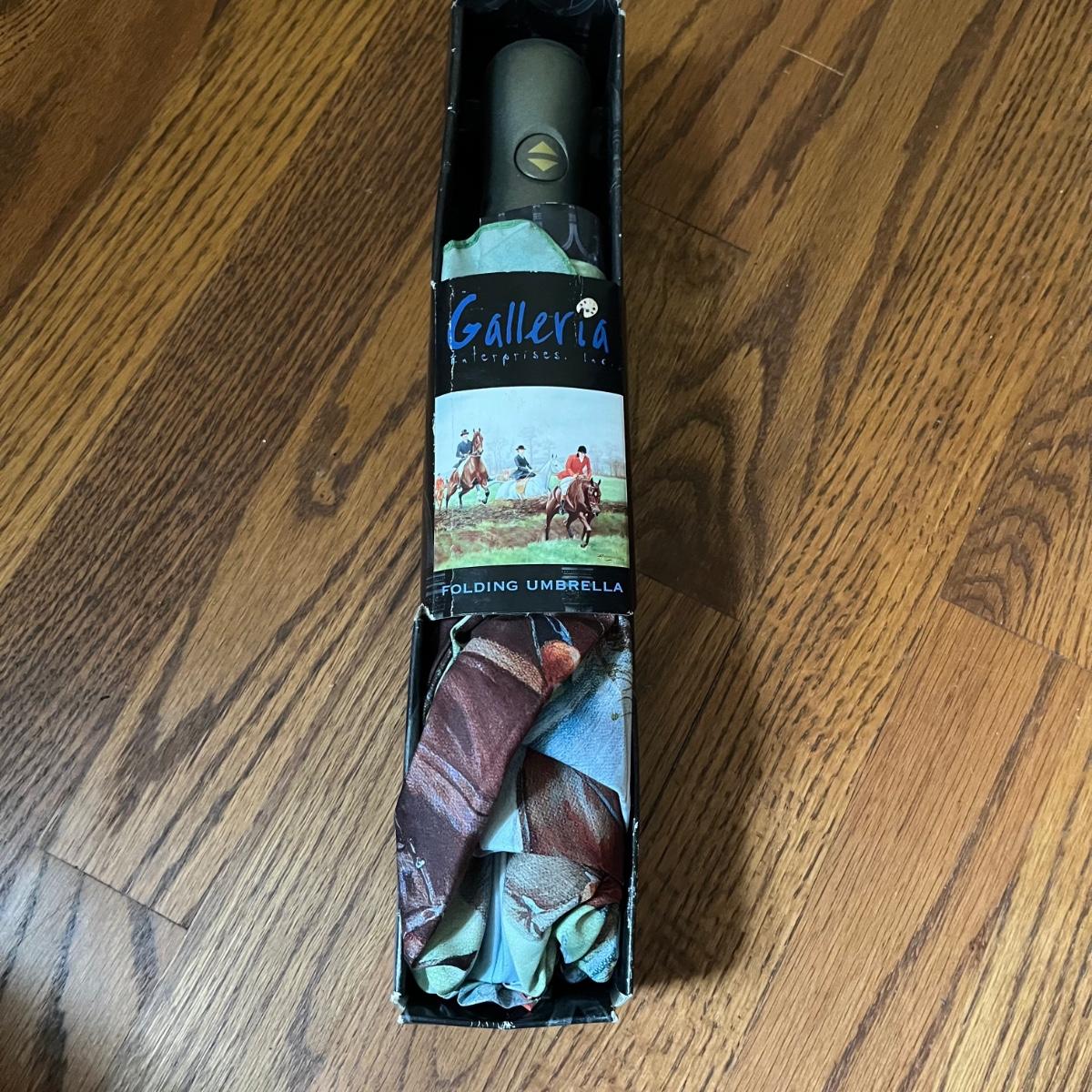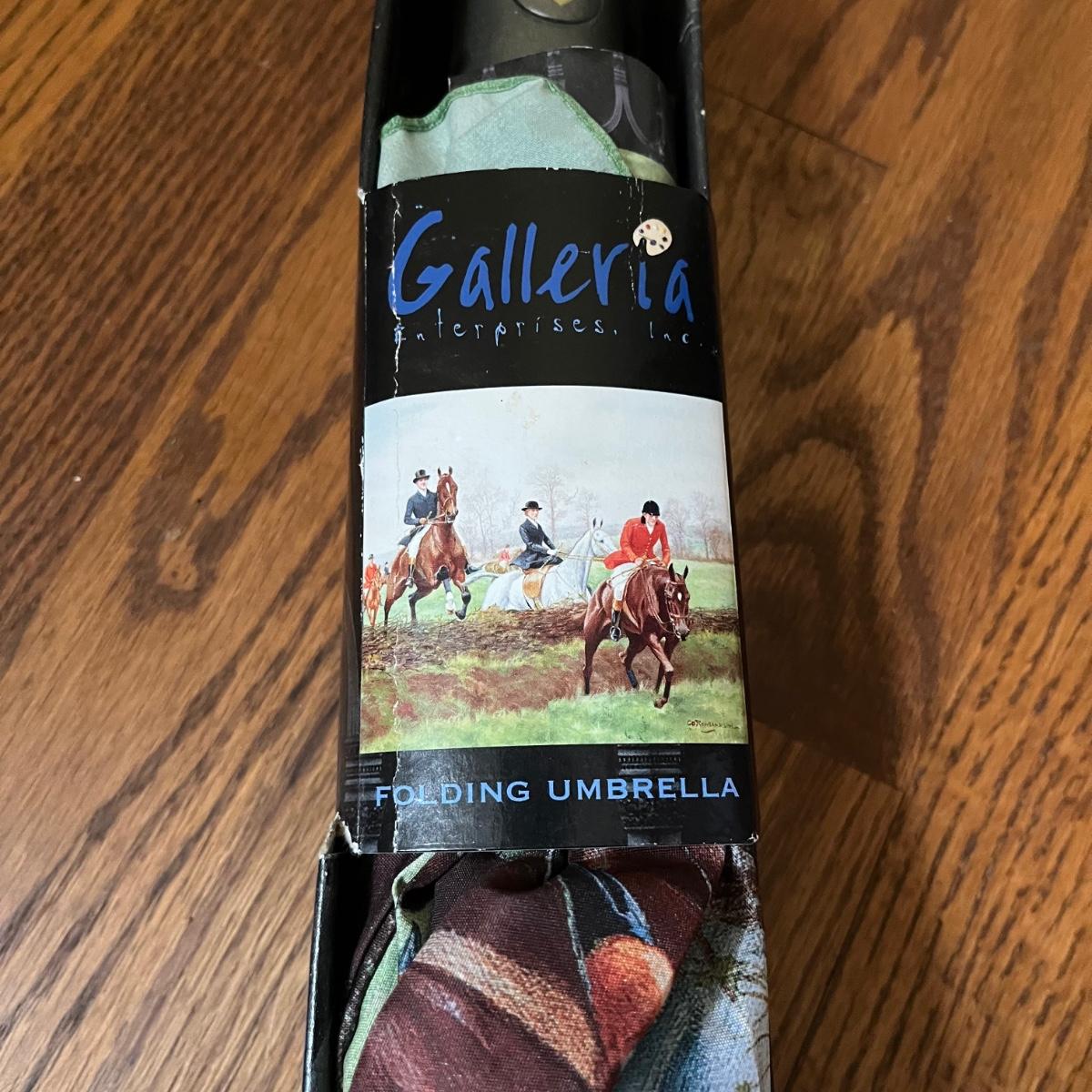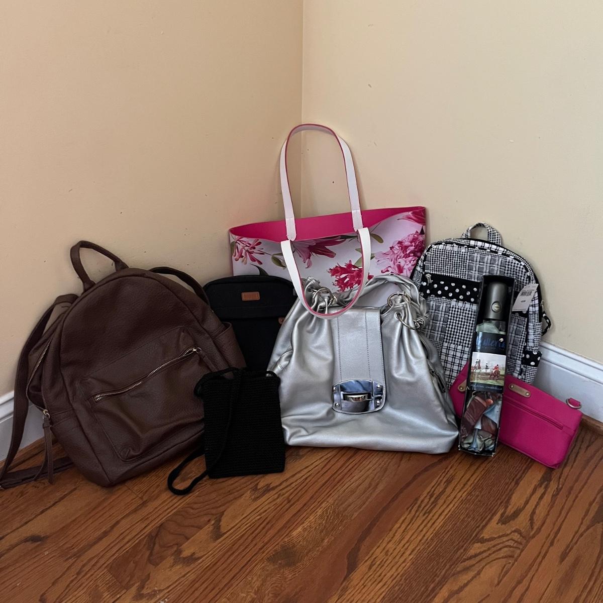 Lot includes a MaggiB backpack purse and clutch, Lily Waters backpack purse, Charming Charlie Faux leather purse, Estée Lauder tote, Galleria equestrian themed umbrella and more. Tote measures 6” x 14” x 17”not including handles.