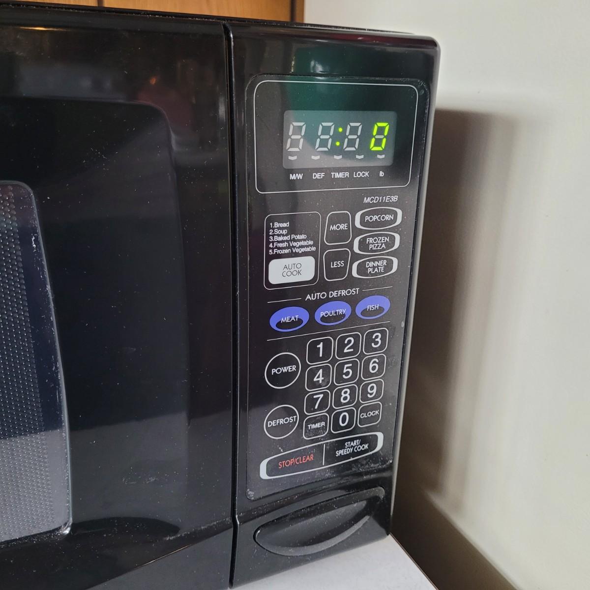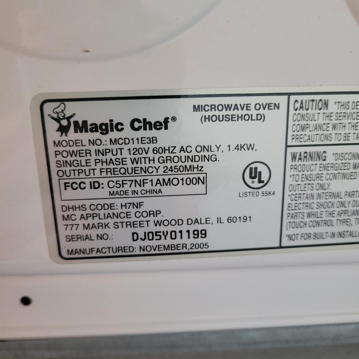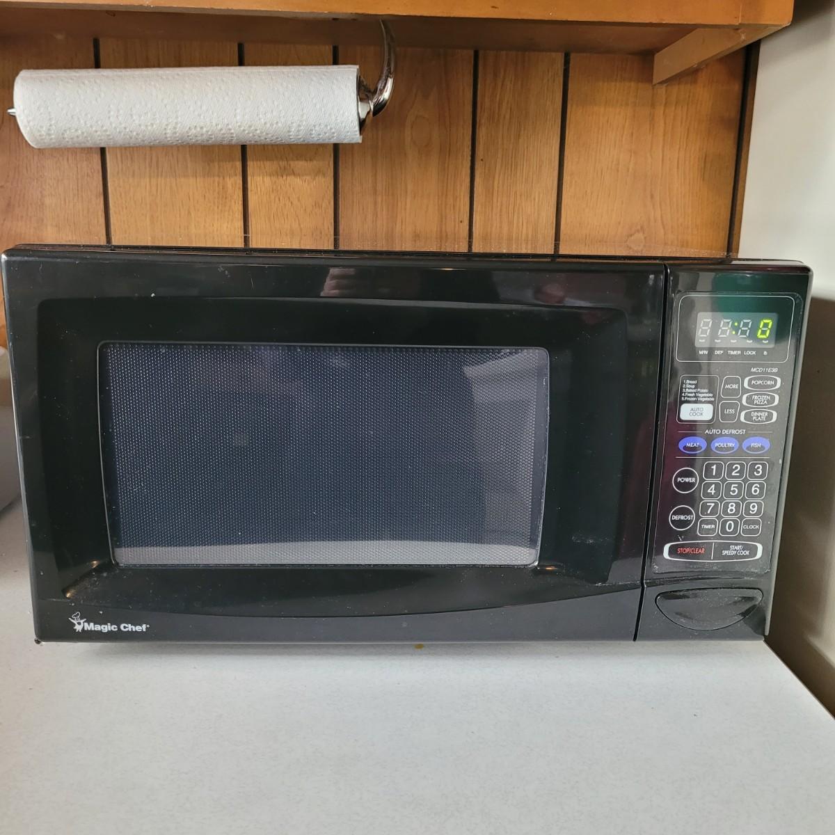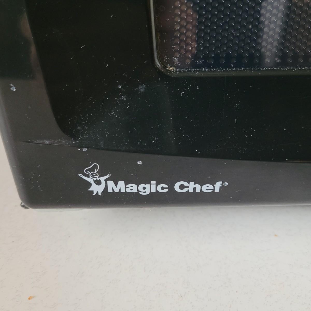 This Magic Chef 120V 60HZ countertop microwave has five autocook settings and three autodefrost settings. Powers on when plugged in. Measures approximately 21" x 14.5" x 12"H. Local pickup only.