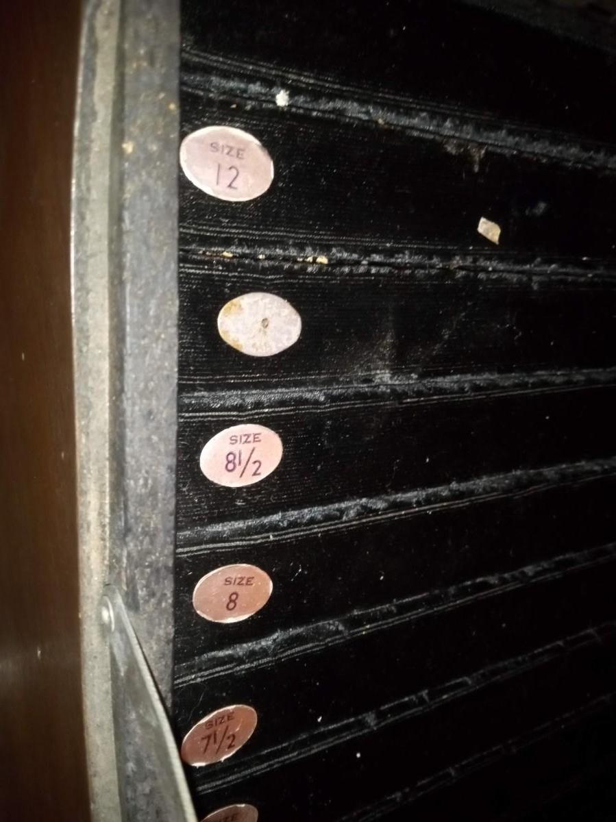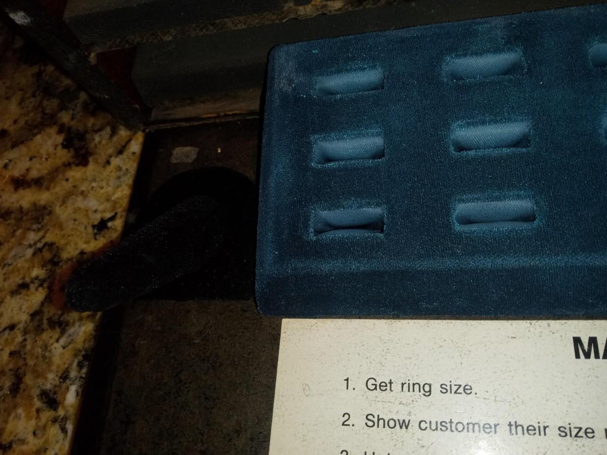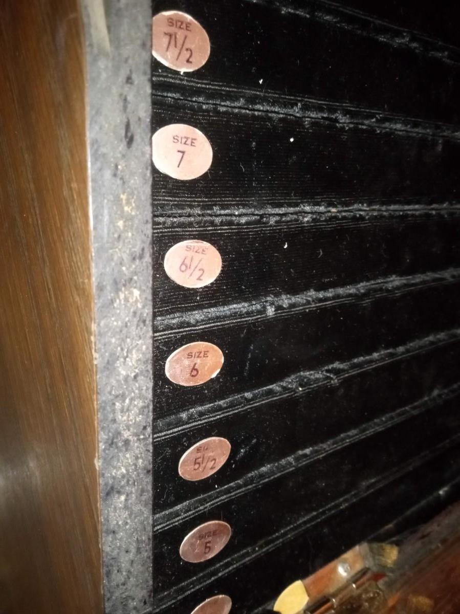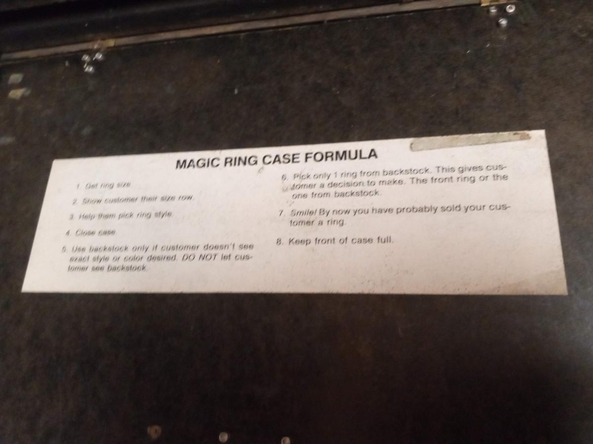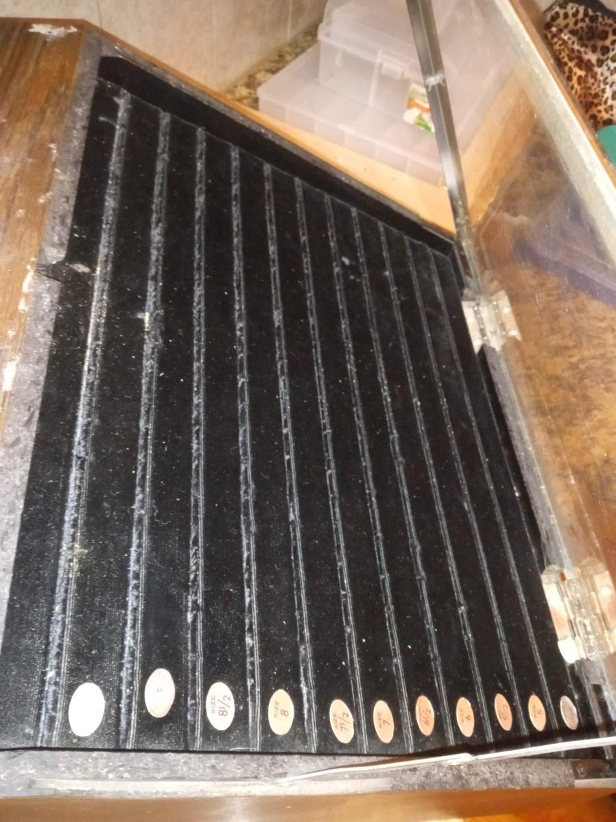 THIS IS A PRETTY NEAT DISPLAY CASE THAT HAS ROWS AND STICKERS FOR EACH SIZE RING, THE BACK OPENS TO REVEAL 4 BOARDS TO STORE MORE RINGS. THERE IS A RING SIZER MOUNTED ON THE SIDE OF THE CASE THAT IS ON A RETRACTABLE CHAIN. IT CAN BE SECURED WITH A PADLOCK. IT MEASURES 18" X 16" X 12"