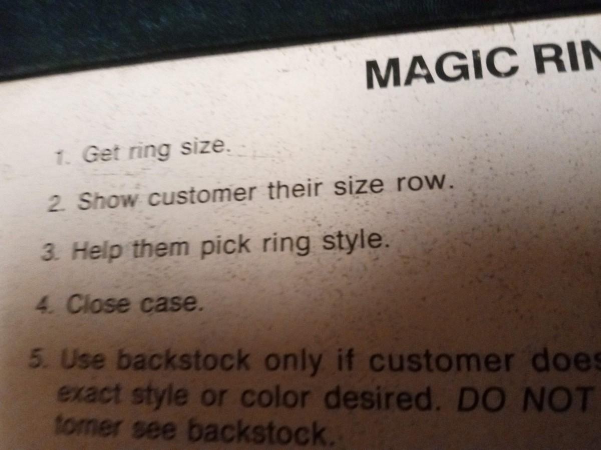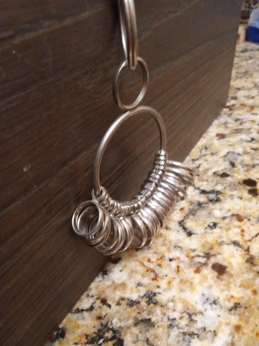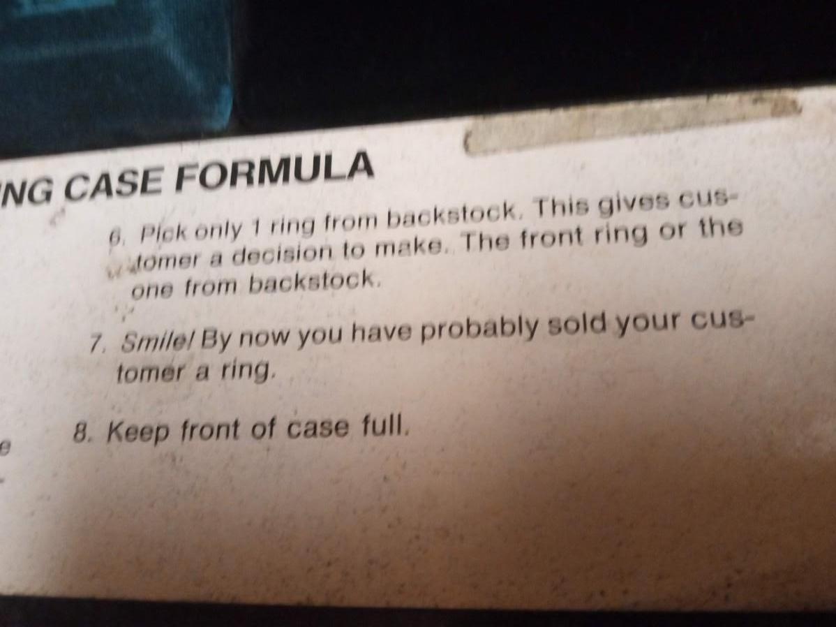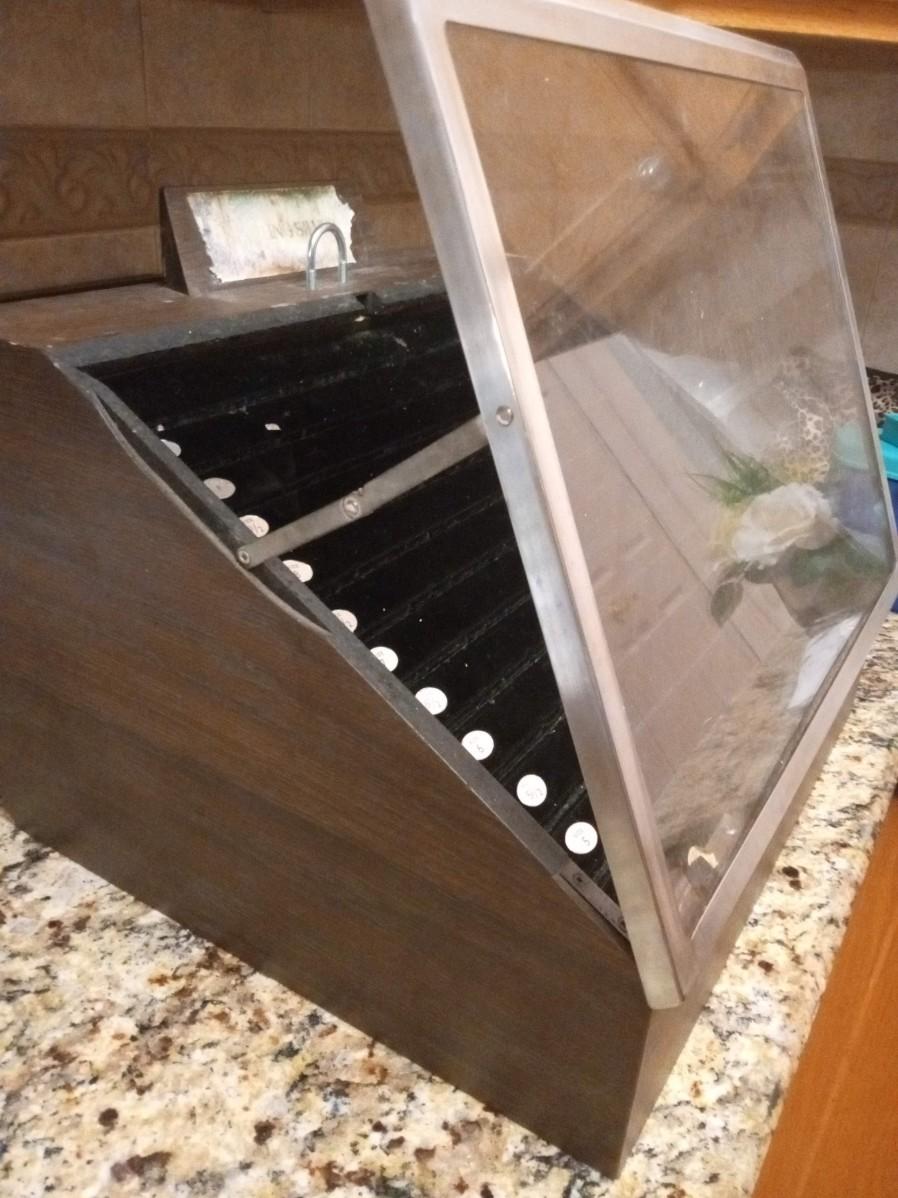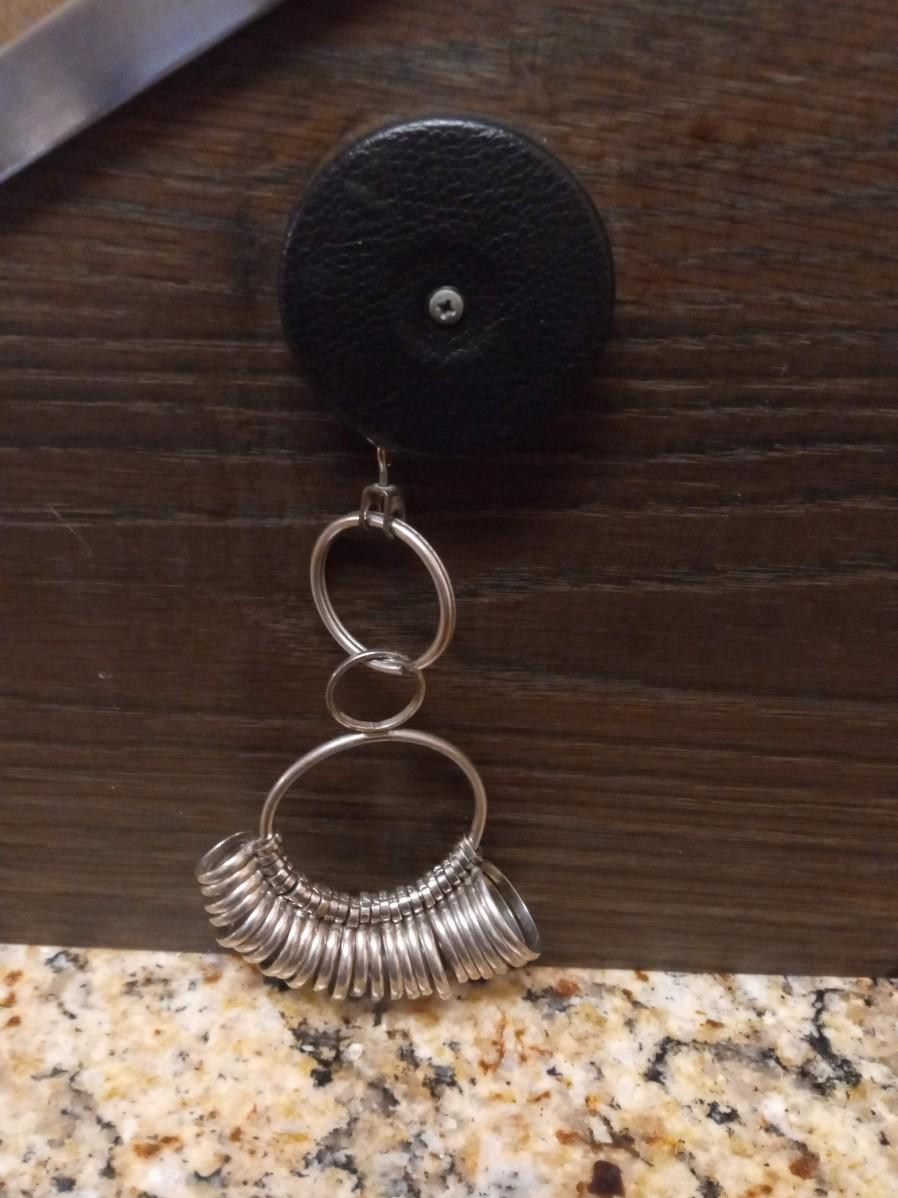 THIS IS A PRETTY NEAT DISPLAY CASE THAT HAS ROWS AND STICKERS FOR EACH SIZE RING, THE BACK OPENS TO REVEAL 4 BOARDS TO STORE MORE RINGS. THERE IS A RING SIZER MOUNTED ON THE SIDE OF THE CASE THAT IS ON A RETRACTABLE CHAIN. IT CAN BE SECURED WITH A PADLOCK. IT MEASURES 18" X 16" X 12"