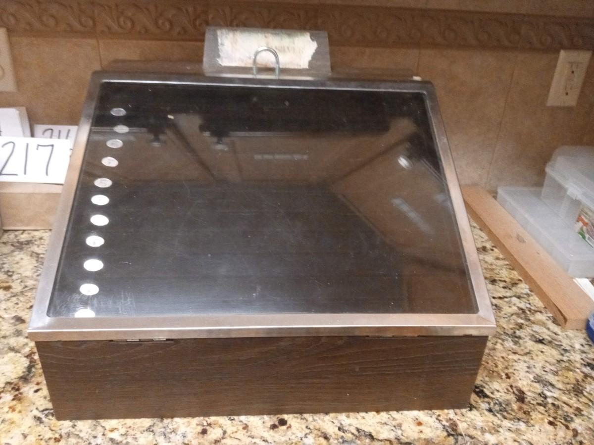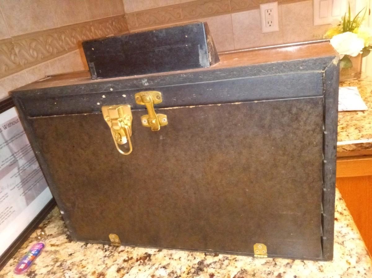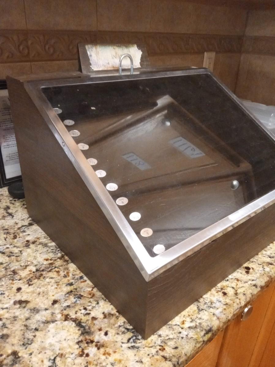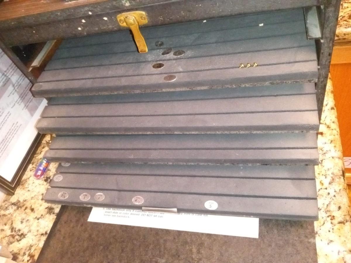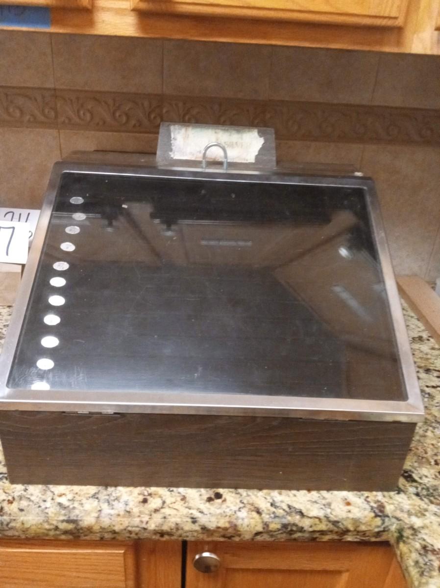 THIS IS A PRETTY NEAT DISPLAY CASE THAT HAS ROWS AND STICKERS FOR EACH SIZE RING, THE BACK OPENS TO REVEAL 4 BOARDS TO STORE MORE RINGS. THERE IS A RING SIZER MOUNTED ON THE SIDE OF THE CASE THAT IS ON A RETRACTABLE CHAIN. IT CAN BE SECURED WITH A PADLOCK. IT MEASURES 18" X 16" X 12"