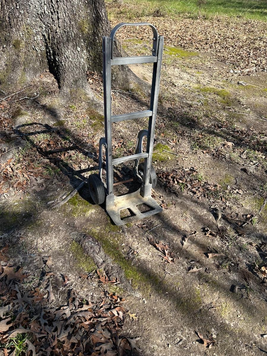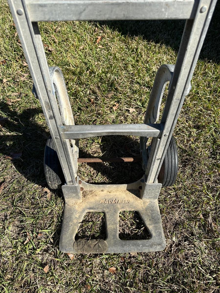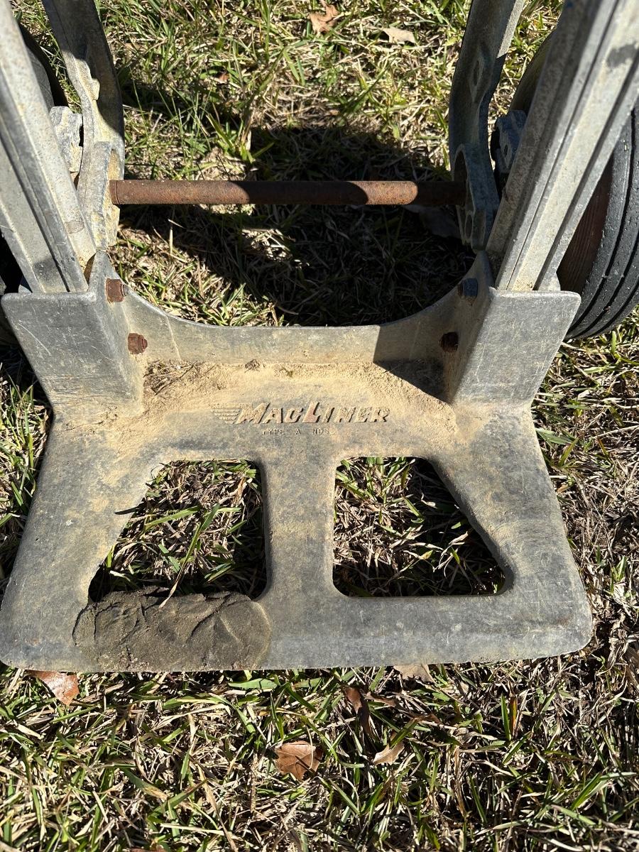 Original Magliner aluminum hand truck featuring a solid cast base plate and dual wheels. This is a commercial-grade dolly, well known for durability and balance. Constructed primarily of aluminum with steel hardware.