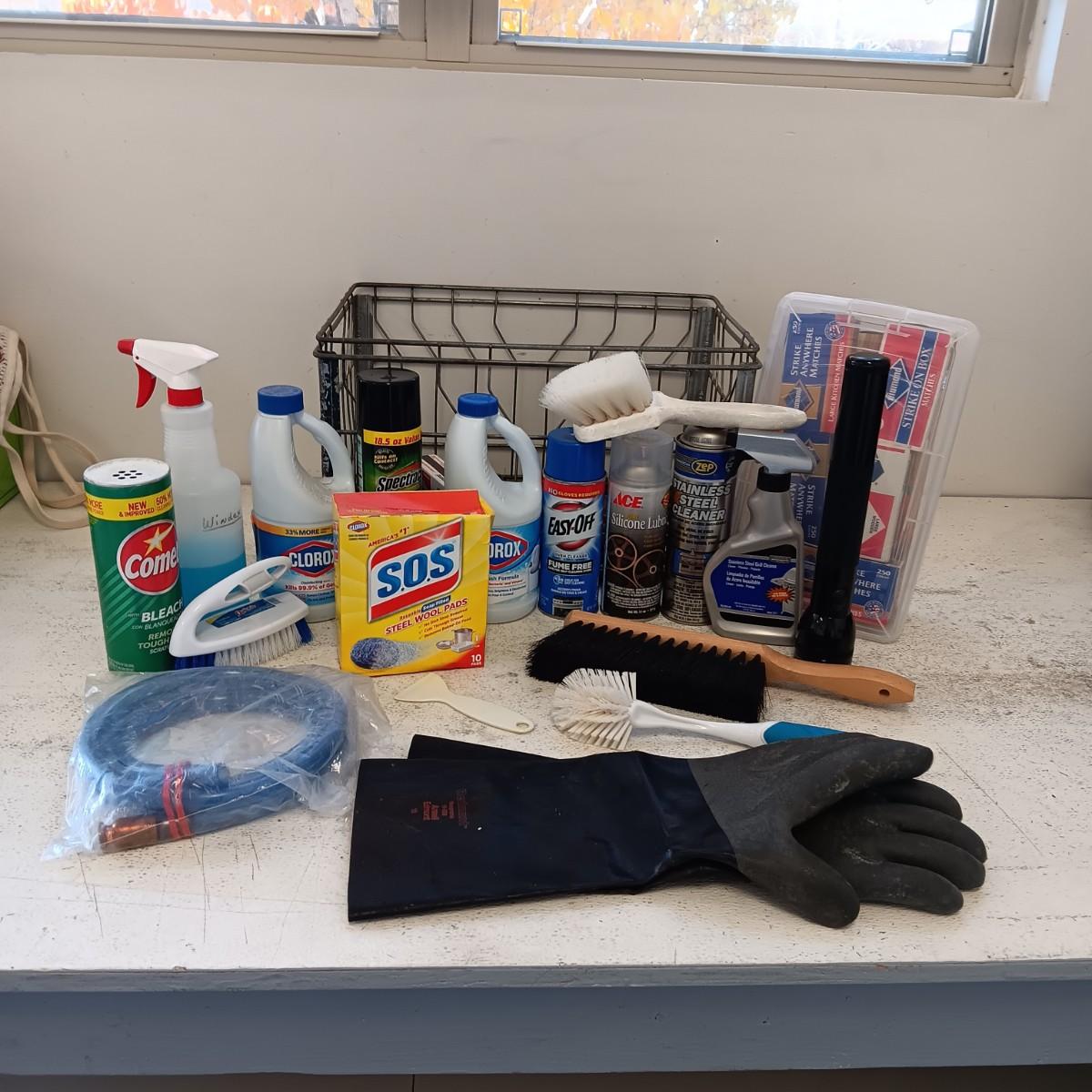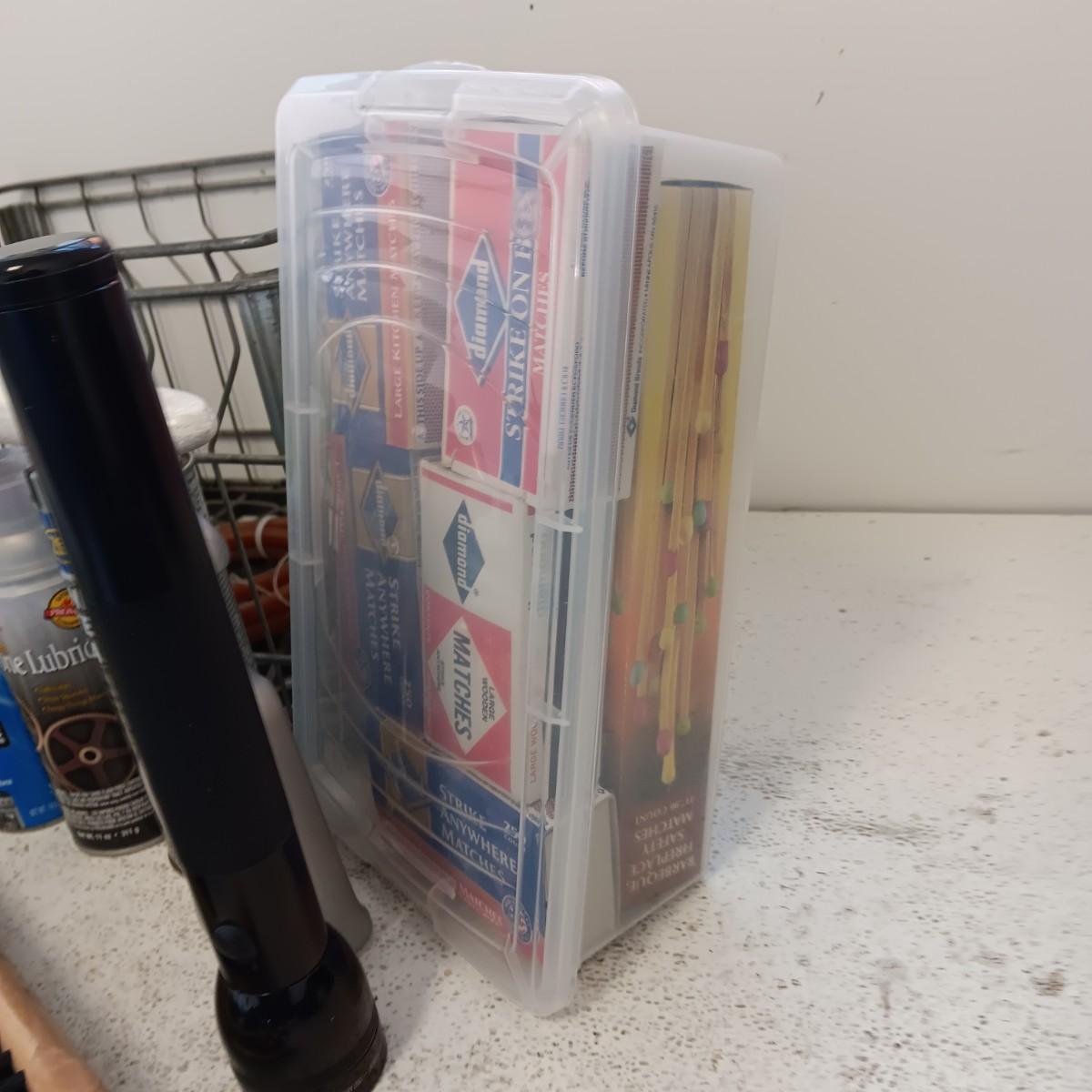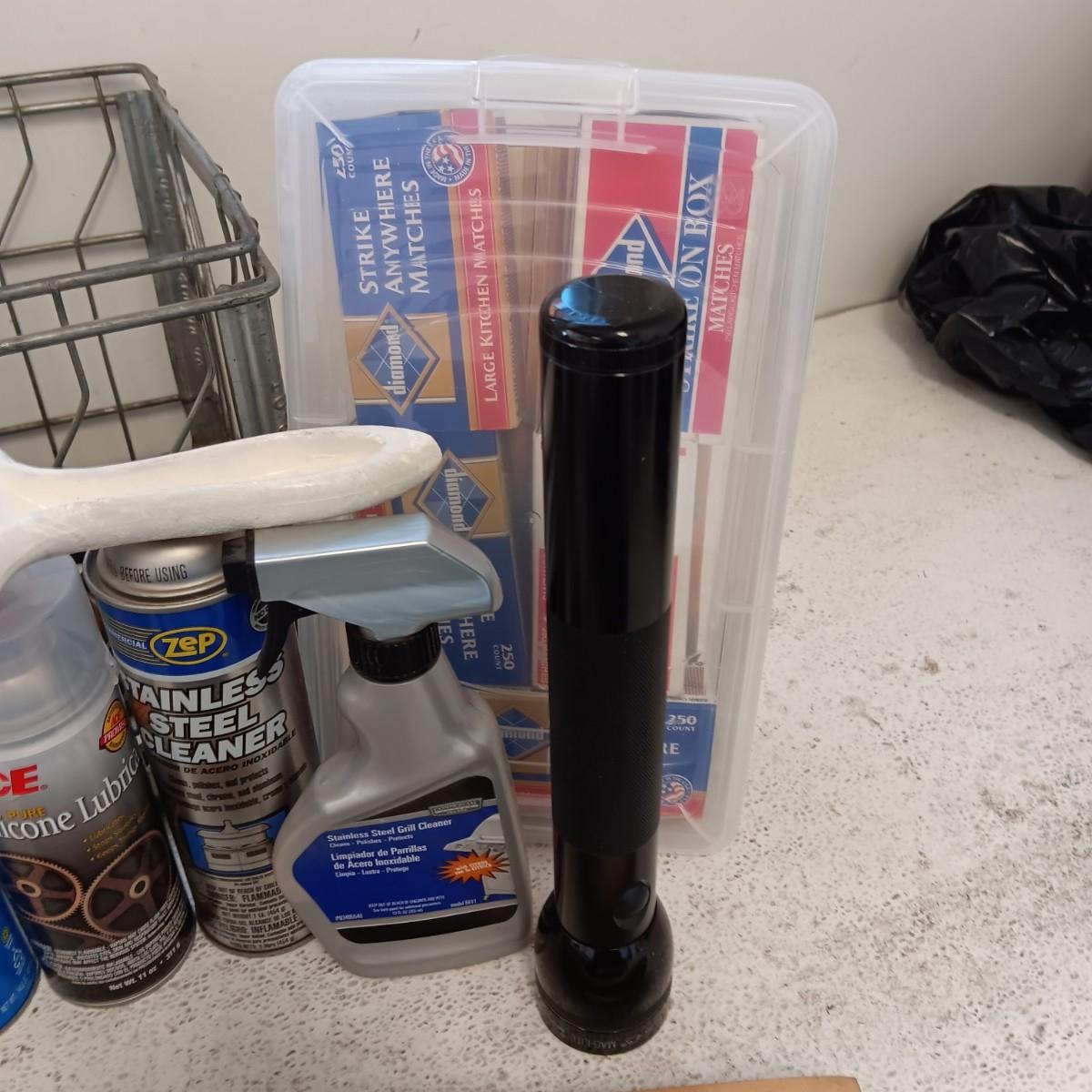 MAG-LITE, CLEANING CHEMICALS, MANY BOXES OF STICK MATCHES, MILK CRATE AND MORE