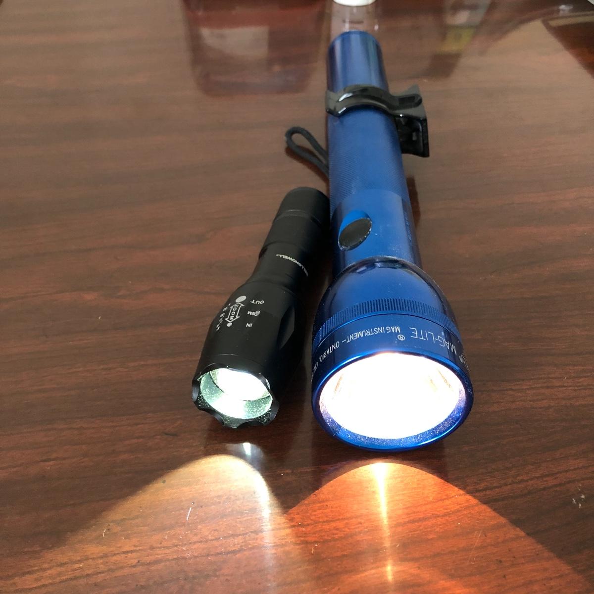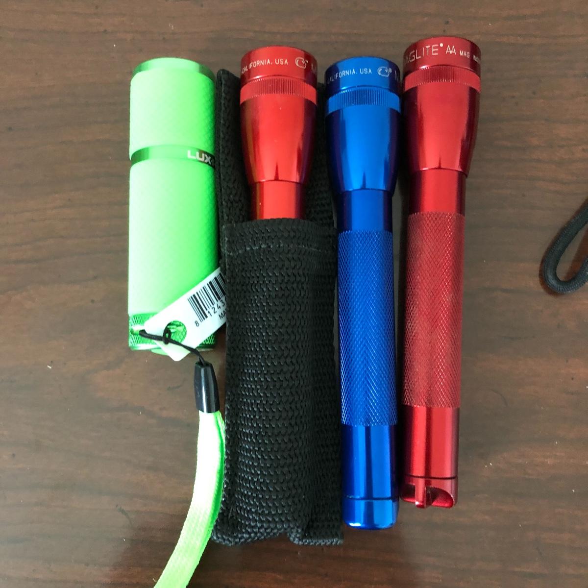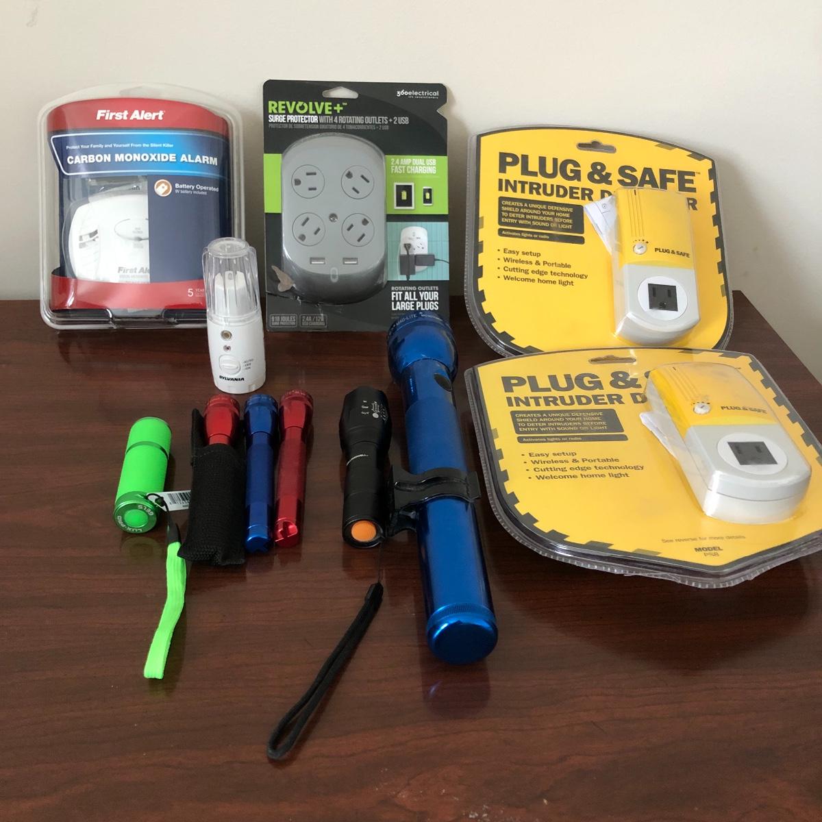 Lot includes one large and three small Mag-Lites, Bell and Howell and Liz-Pro flashlights and two Plug and Safe intruder detectors. Also includes Carbon Monoxide alarm and a surge protector with two USB plugs.
