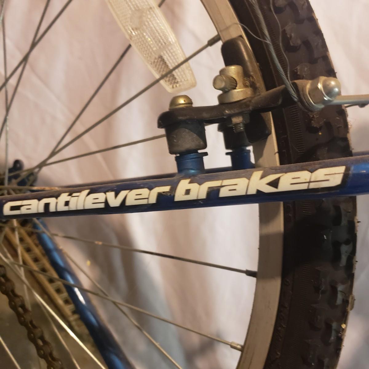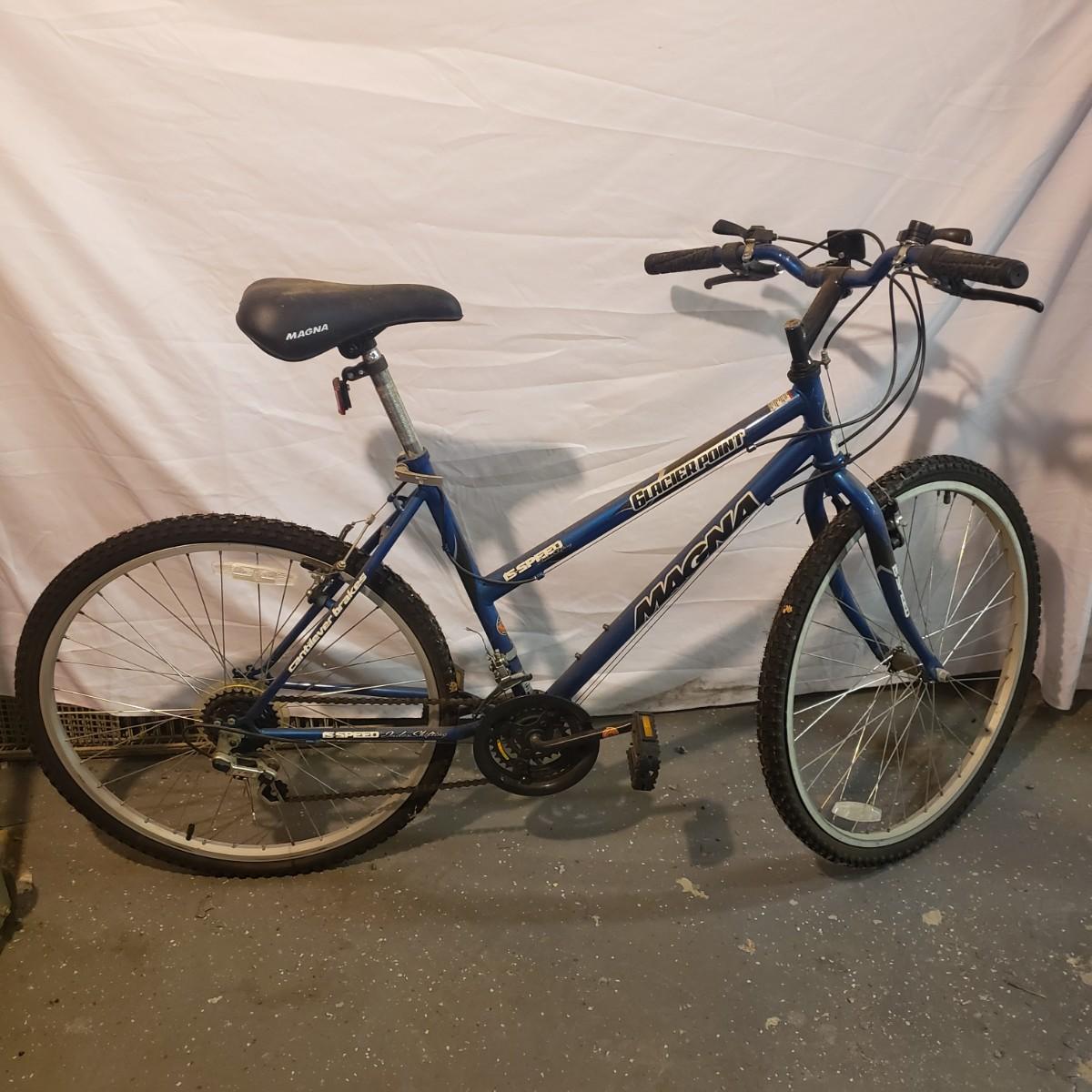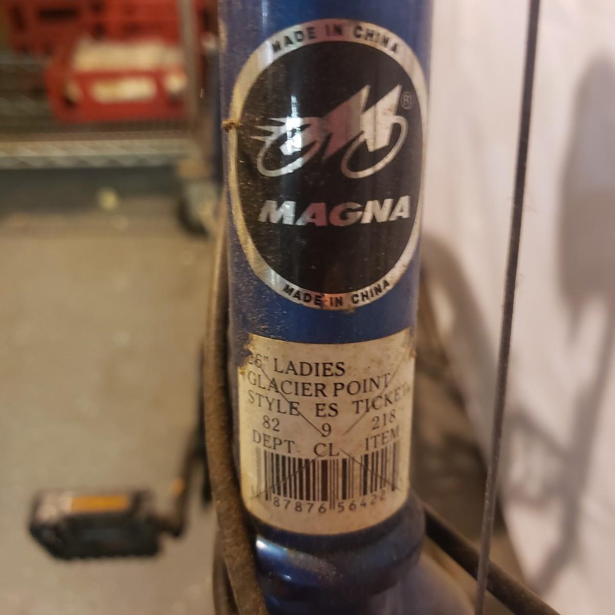 This is a Magna, Glacier Point 15 speed women's bike. The tread on the tires look barely used. The tires are a little flat, but we did not test by filling them up. The sticker says that it has cantilever brakes. The frame measures 18.5". The bike could probably use a tune up, as it has been sitting for a time.. See pictures for details.