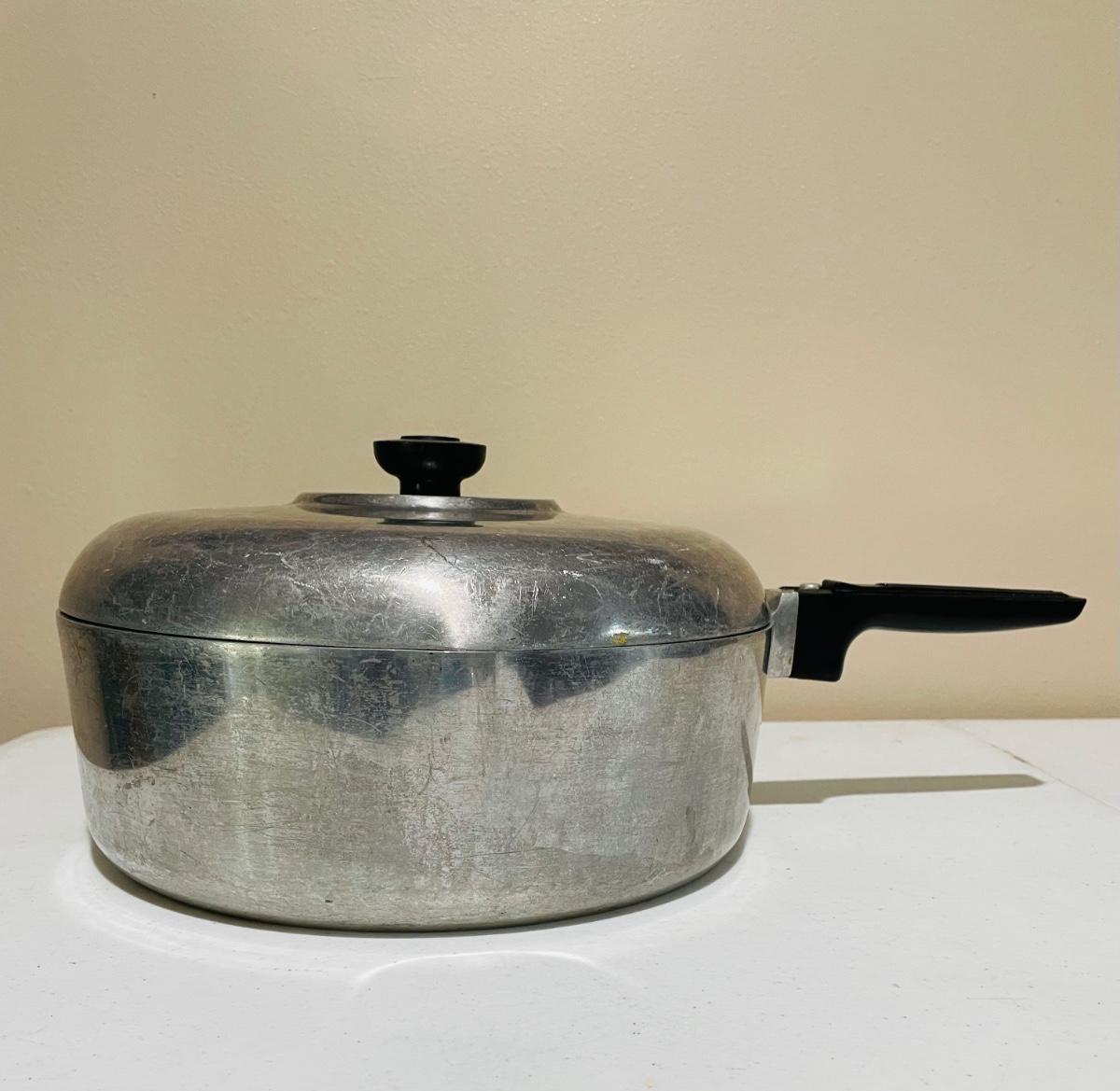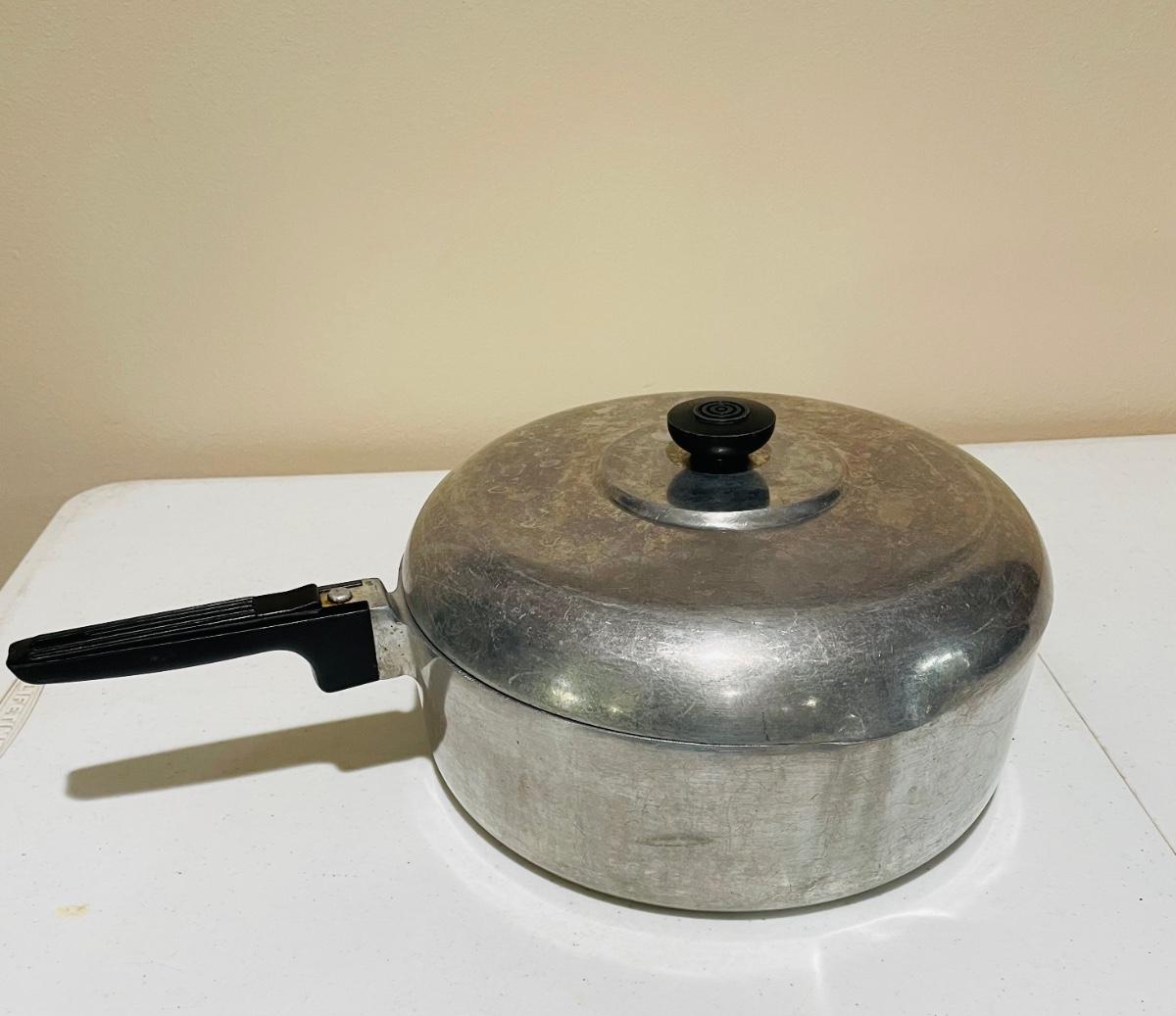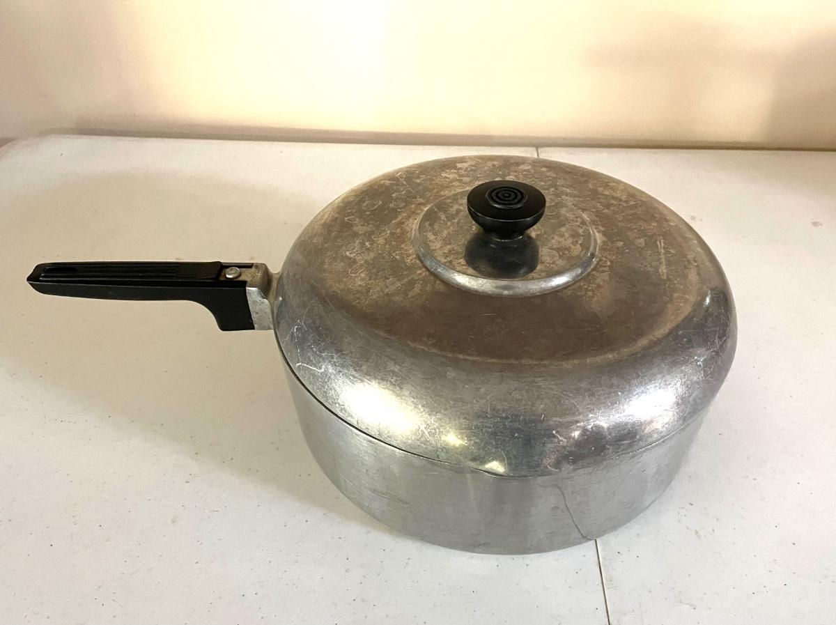 Magnalite 28.5 GHC 11 1/4" Deep Chicken Fryer Double Spout Pan Skillet w/Lid. Measures 4 inches deep.