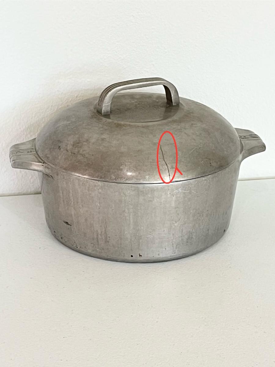 Lid has a crack as seen on photo ~ 4 1/4” H x 10” Round ~ Pot needs some extra cleaning on the bottom
