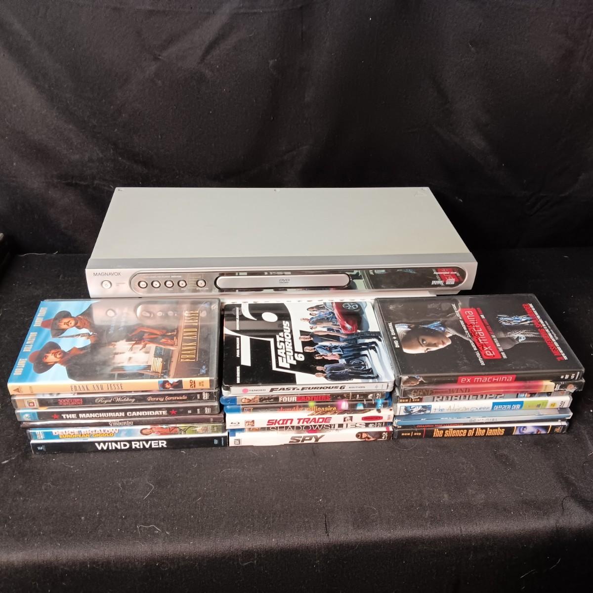 MAGNAVOX DVD PLAYER AND AN ASSORTMENT OF R RATED MOVIES