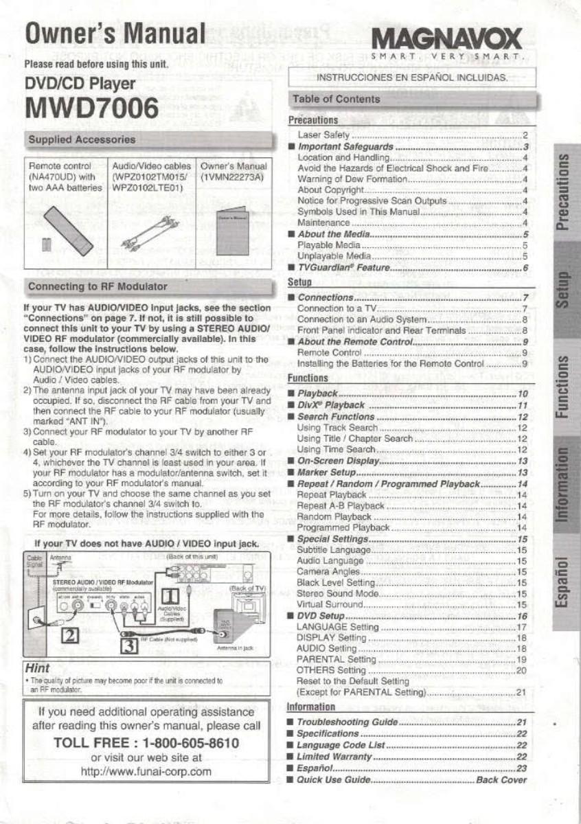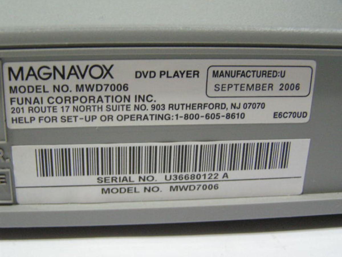 Magnavox DVD/CD Player w/Dolby Digital stereo. Will play ALL of these disc types: DVD-Video; DivX & TVG video; DVD-R & DVD-RW; DVD+R & DVD+RW; Video CD; Audio CD; CD-R & CD-RW. FULL SET of connections includes: HDTV-RGB component video; EDTV (”S”) video; SD composite video; stereo audio; digital coax HD audio. OEM remote will control most major brands of TV. Mod# MWD7006. TESTED & works great! L@@K for DVD & VHS movies elsewhere in this sale.