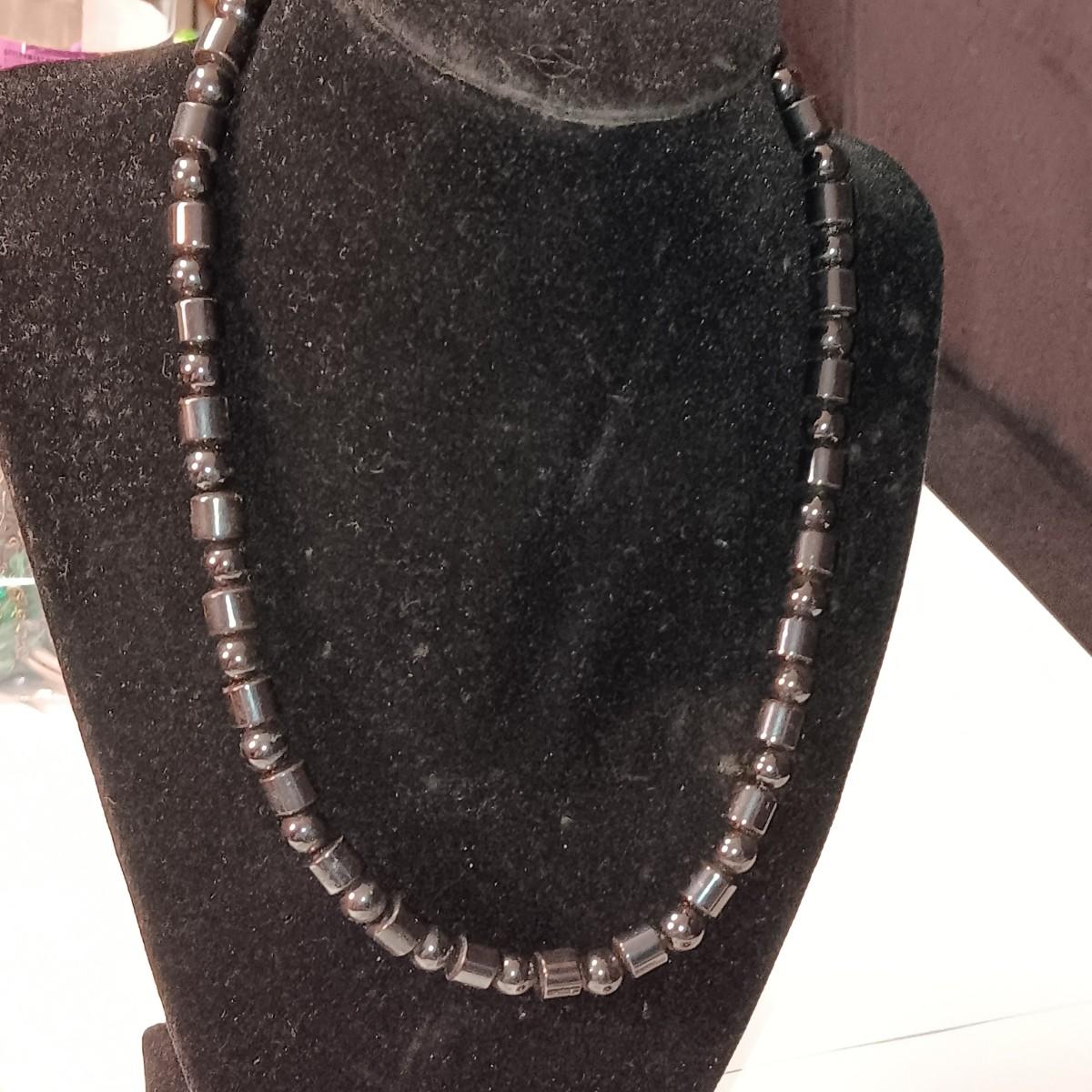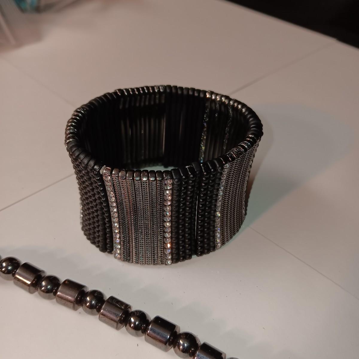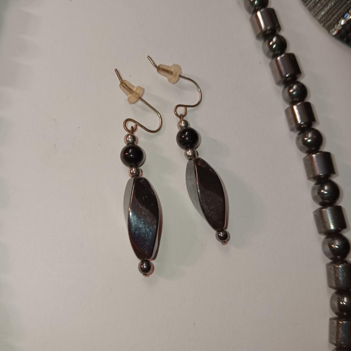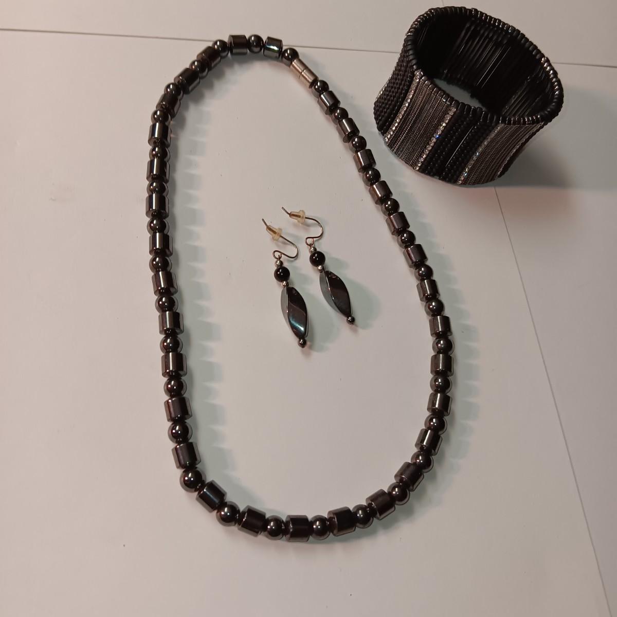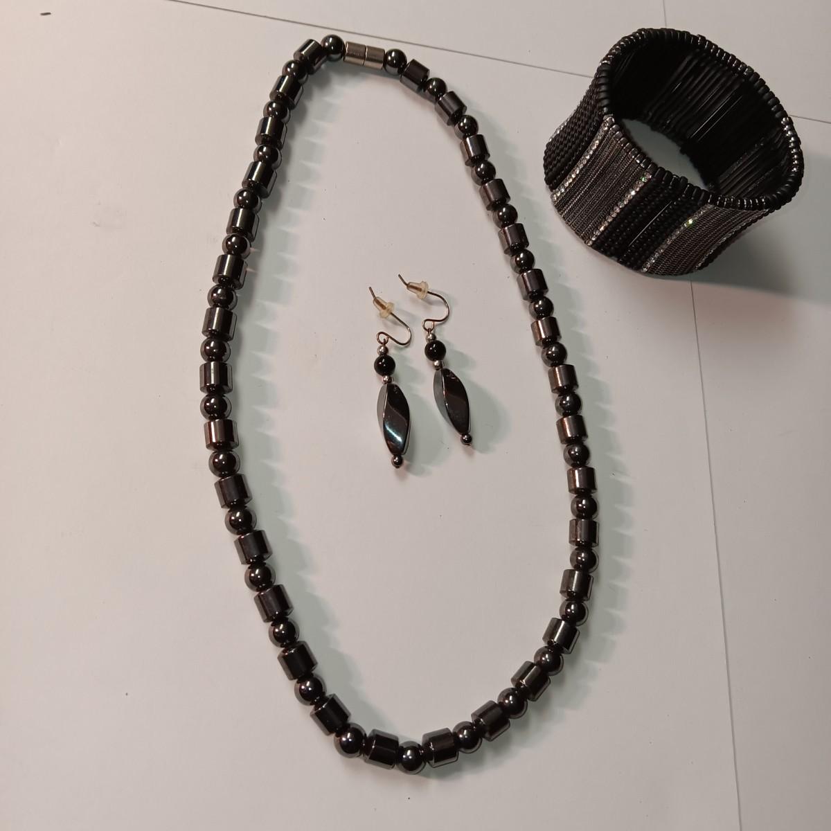 MAGNETIC NECKLACE, EARRINGS AND A METAL ELASTIC BRACELET