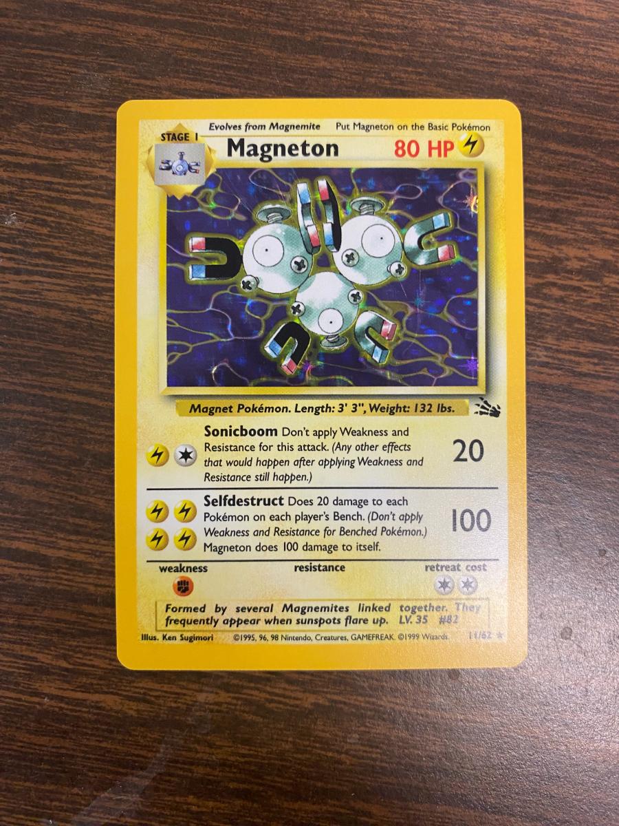 This is a Magneton card from the 1999 Base Set Pokemon TCG. The card is a Stage 1 Electric-type with 80 HP. It features the moves Sonicboom (20 damage) and Selfdestruct (100 damage), with a weakness to Fighting-type Pokemon. The card is in light play condition, showing moderate signs of handling and use.