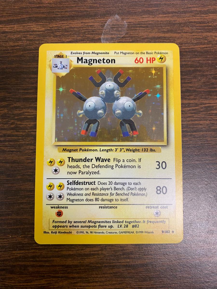 This is a Magneton trading card from the 1999 Pokemon Base Set, identified as card number 9/102. It has 60 HP and features the Thunder Wave and Selfdestruct moves. Condition is light play, with minor surface and edge wear visible from casual handling. The back design reflects the classic Pokemon card styling of the era.