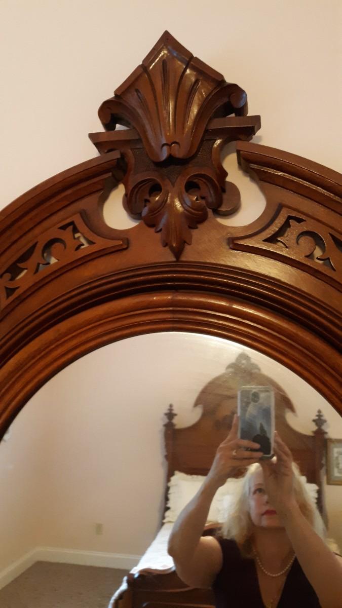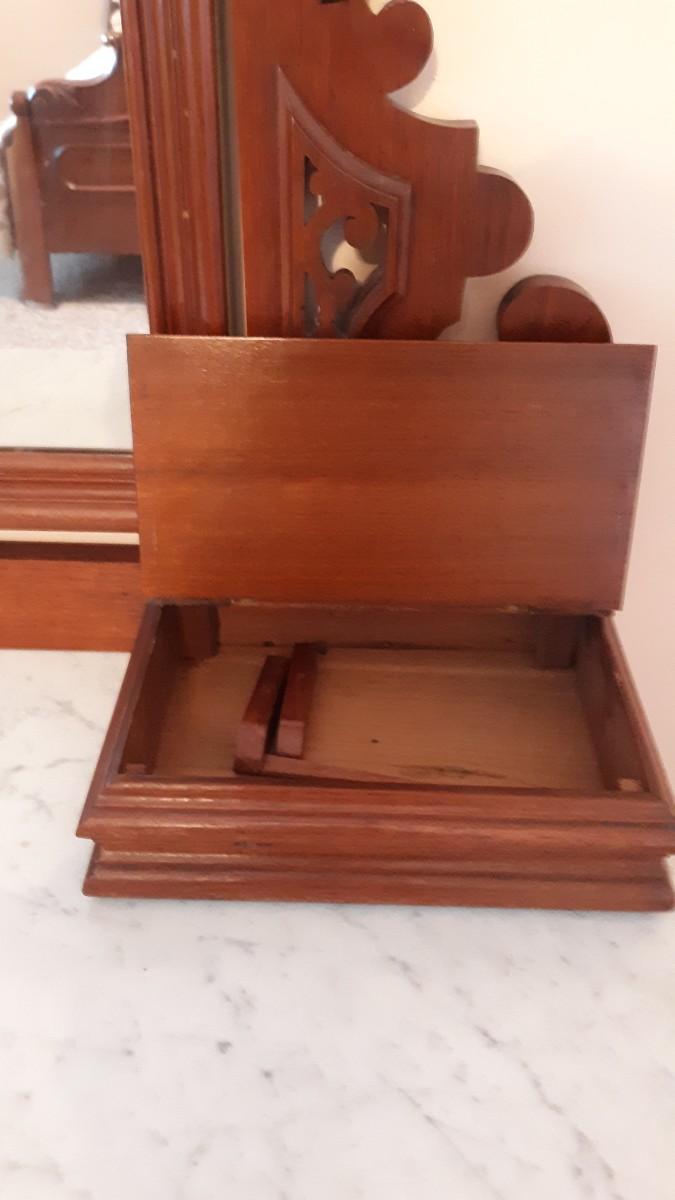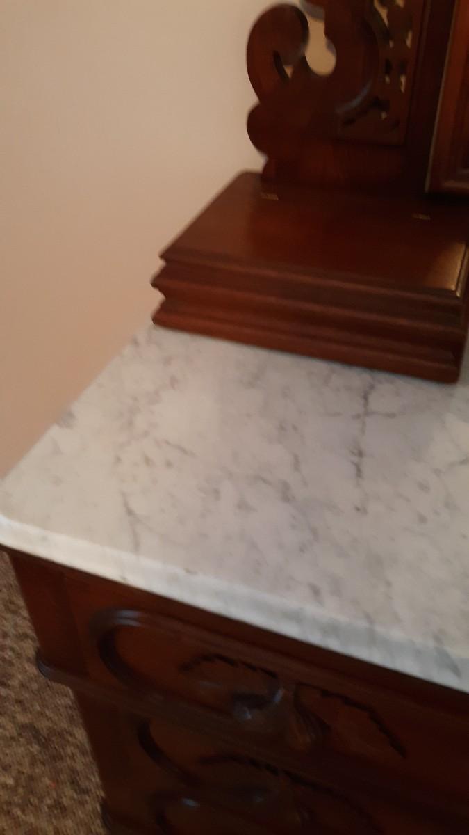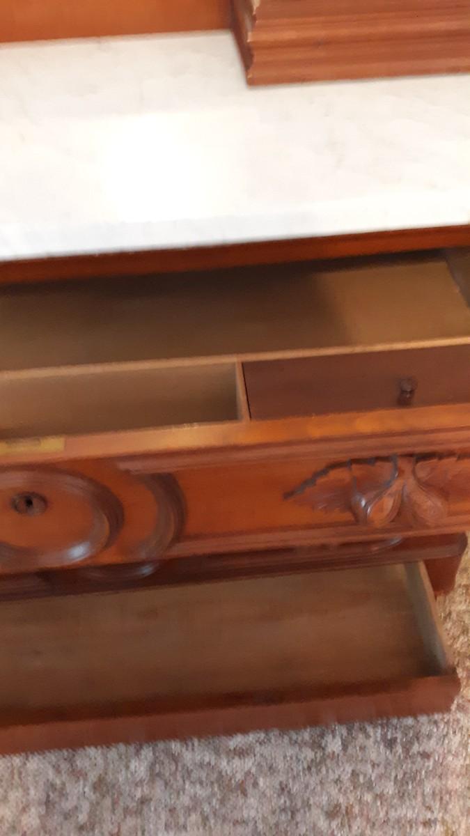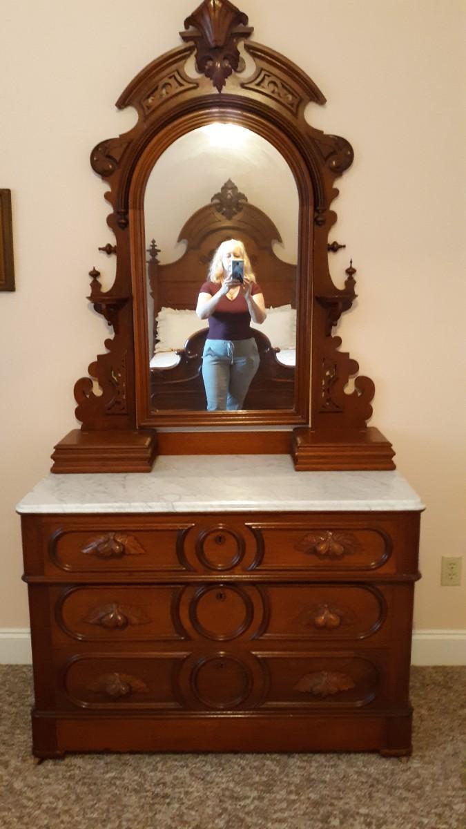 This matches the antique full size bed. Beautiful carvings. Marble top. The mirror tilts. Amazing find. This also has a hidden secret drawer. Hide your valuables. Eloquent, beautiful, amazing. If you buy the bed, you must have the dresser to match. Our consigner paid thousands for these pieces.