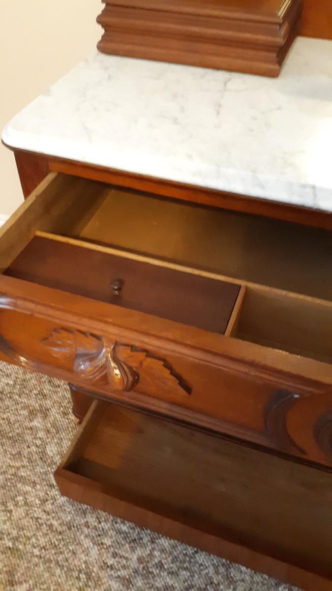Lot 2 Magnificently Carved Antique Marble topped Dresser With Hidden Secret Drawer