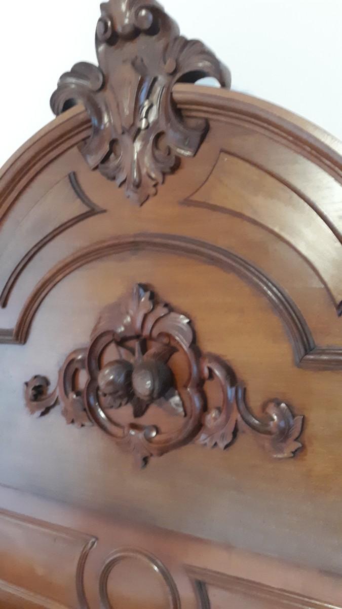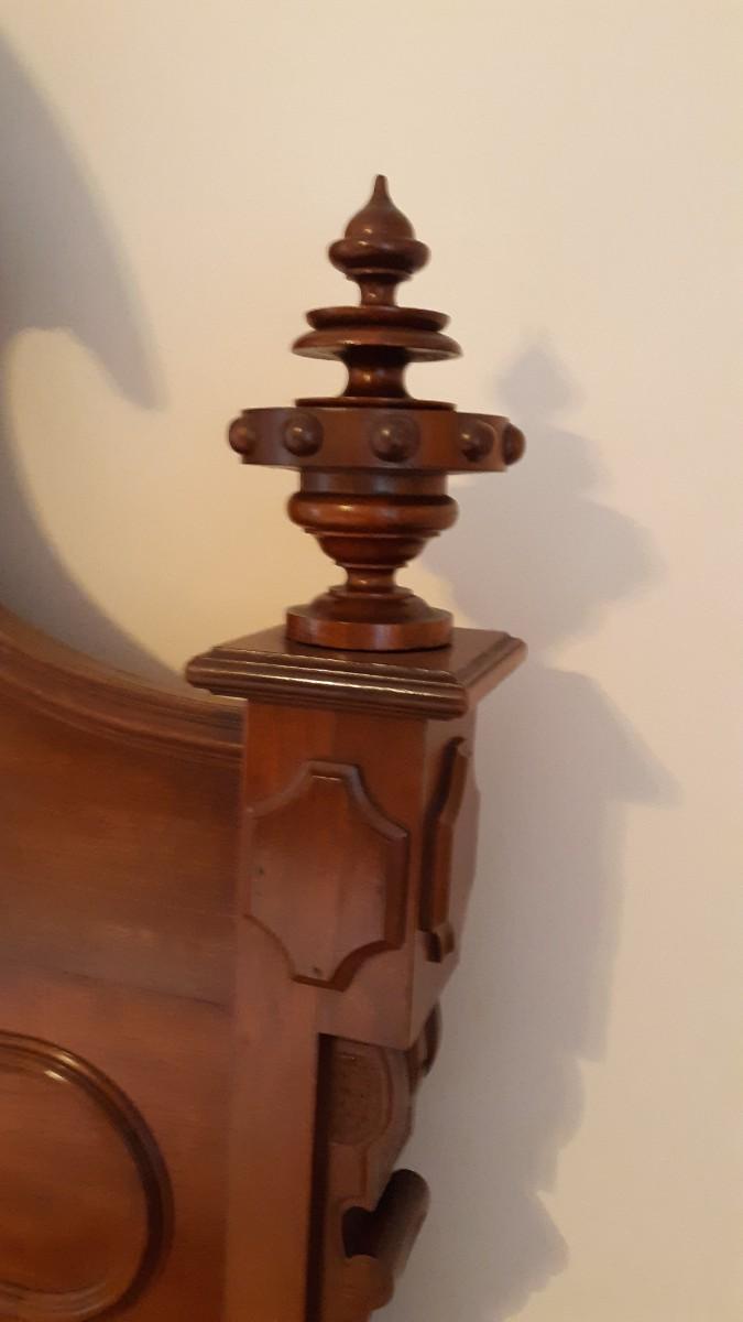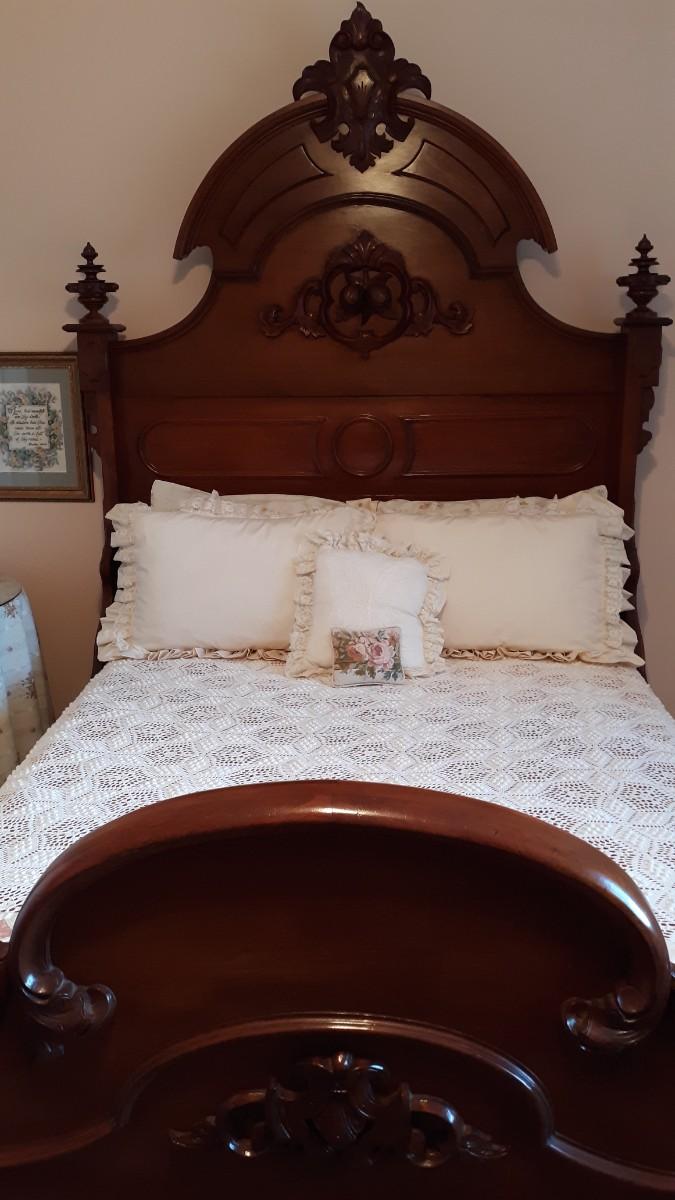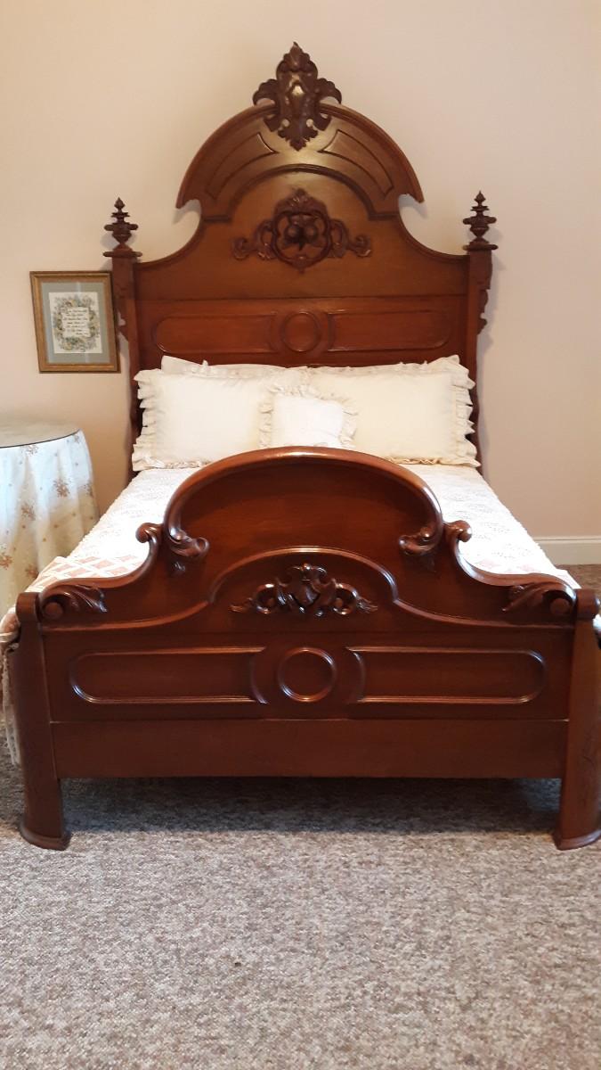 Antique Wooden full size bed. Beautiful and gorgeous carvings. Elegant! Stunning! You will not be sorry for purchasing this bed. Magnificent. You are biding on the bed only - The headboard, footboard, and the railings- The other items in the picture are not included.