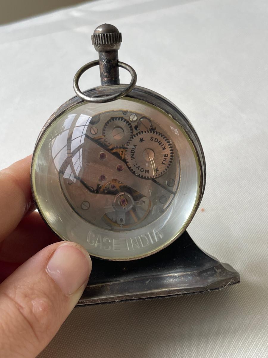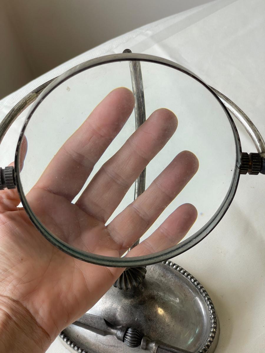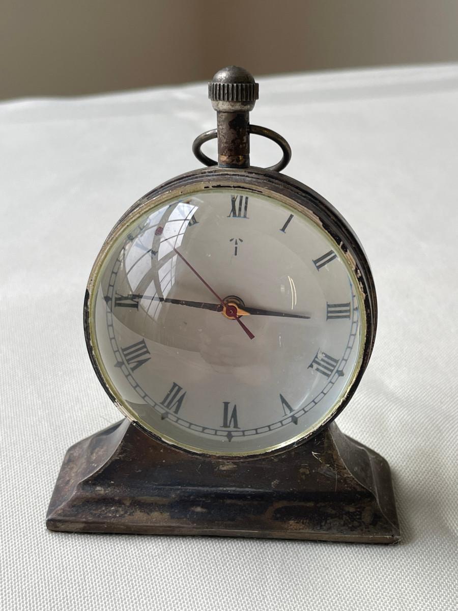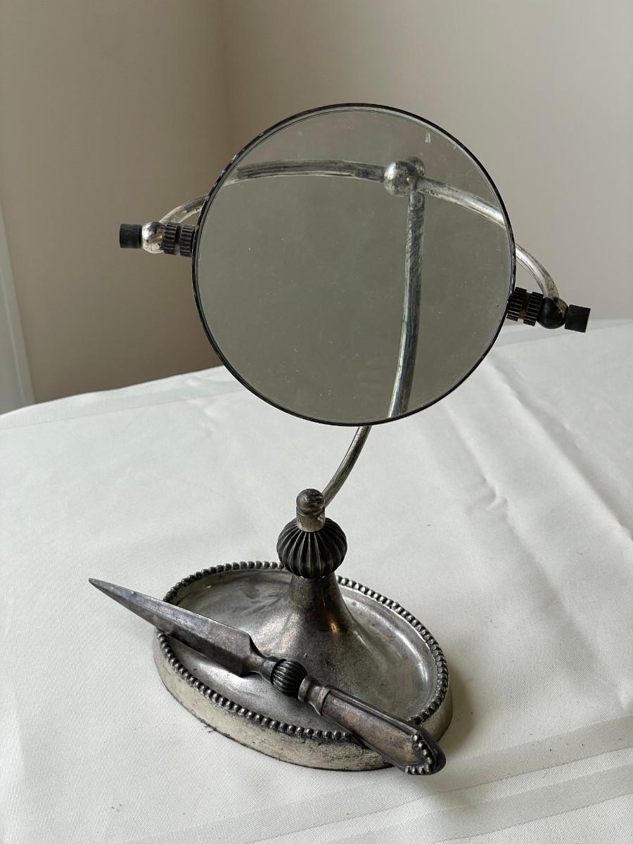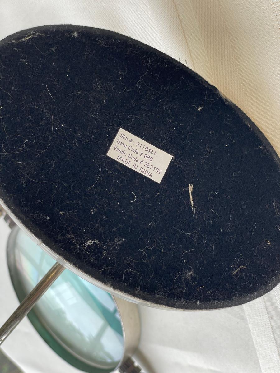 Orb magnifying clock is vintage. We believe the magnifying glass with letter opener is a reproduction but can’t tell for sure. The magnifying glass measures 10.25” tall.