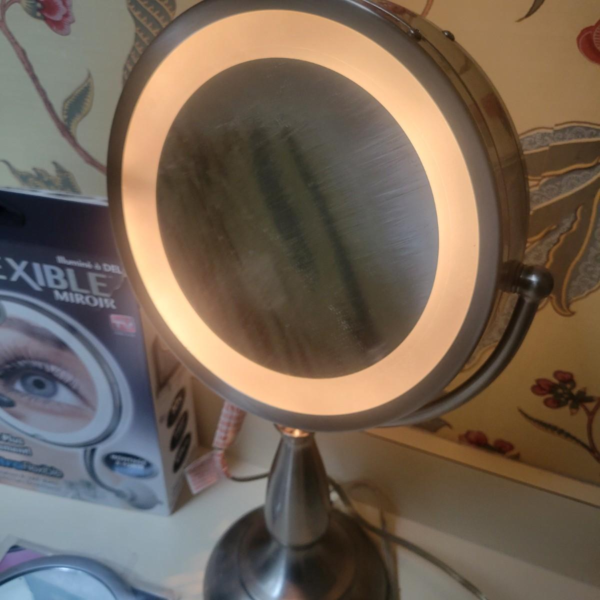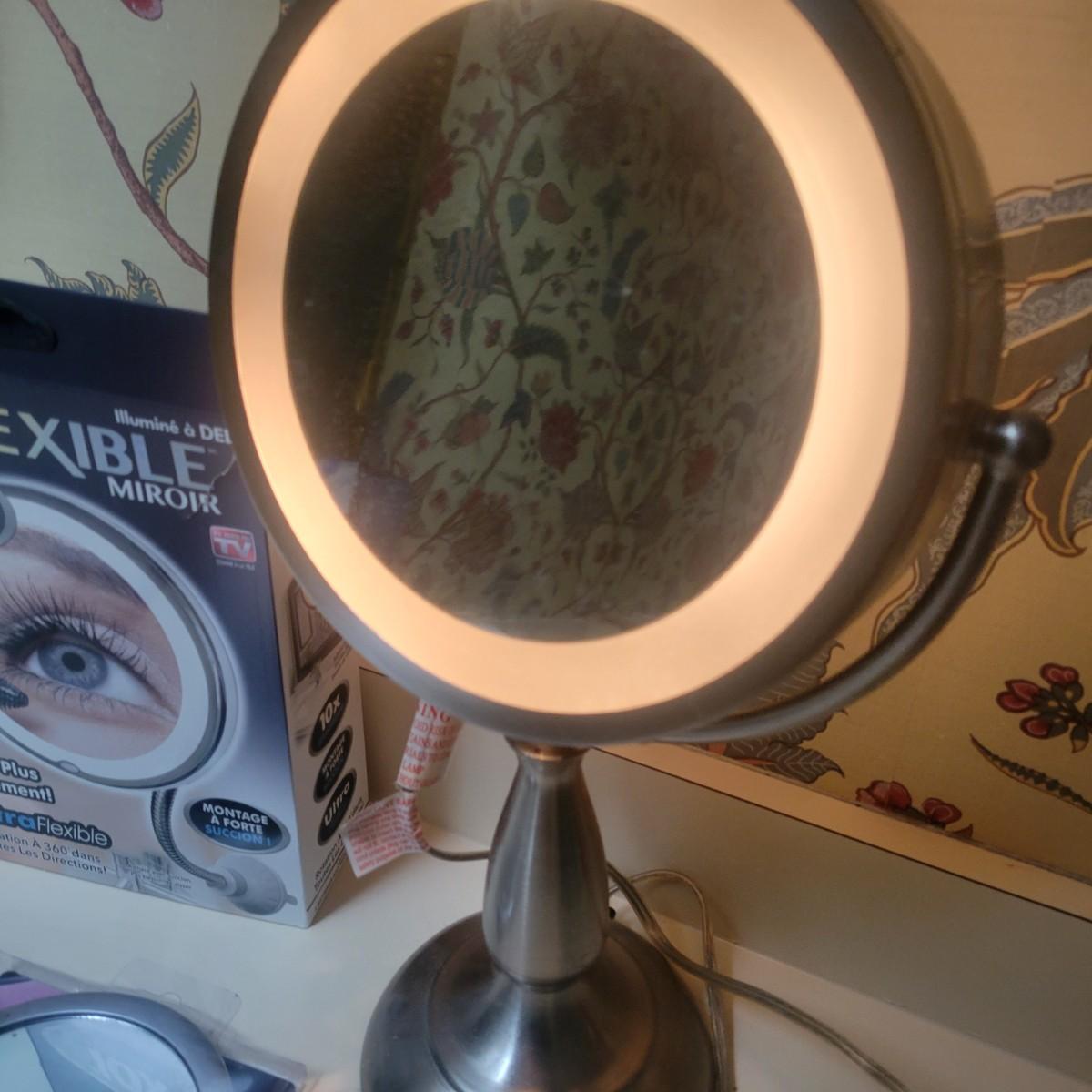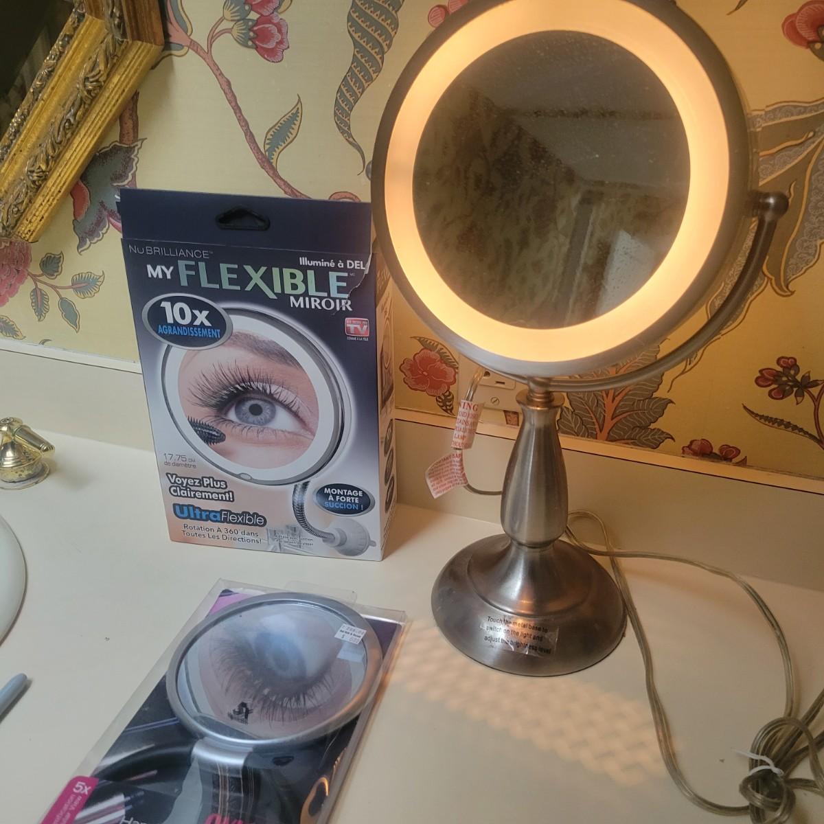 3 magnifying mirrors. One is a tabletop mirror with 3 light settings. One side magnifies and the other side is a standard mirror. Measures approximately 10" x 6.5" x 17.5" Newand in original packaging flexible mirror with a 10x magnification with a suction mount. Also new 5x hanging/standing mirror