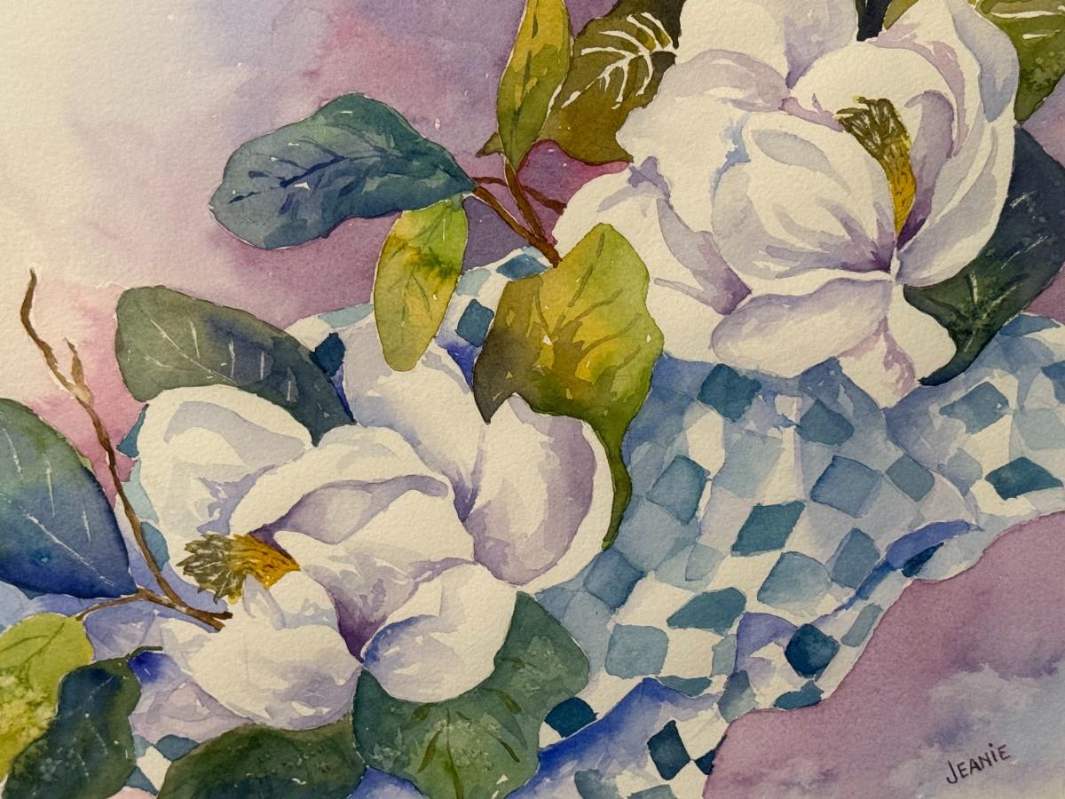 Magnolias on Blue Checkered Cloth- 21 1/2" x 18"