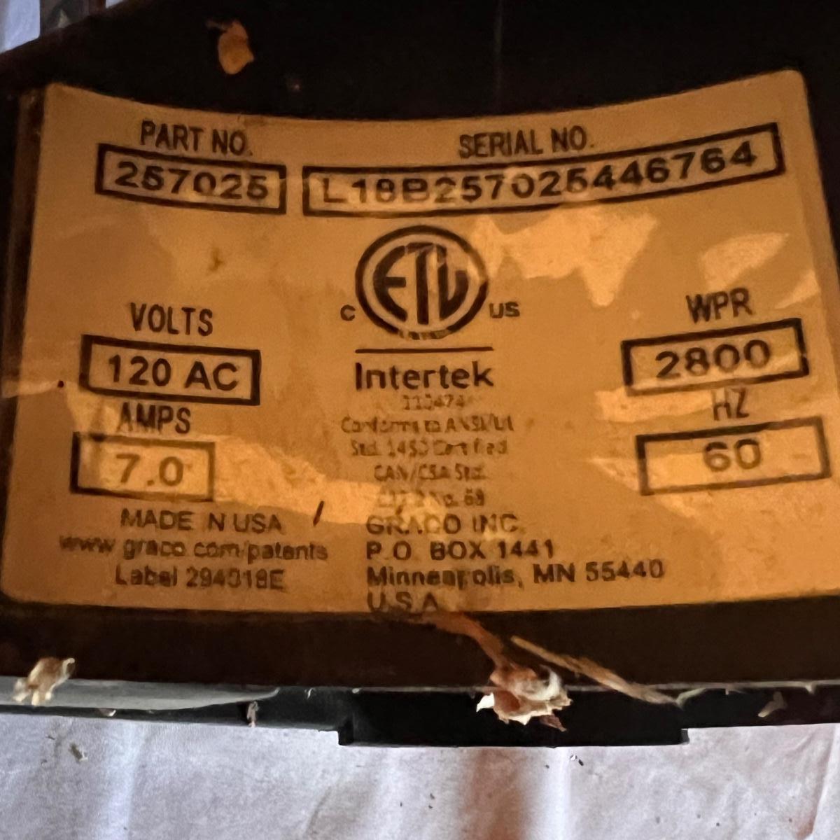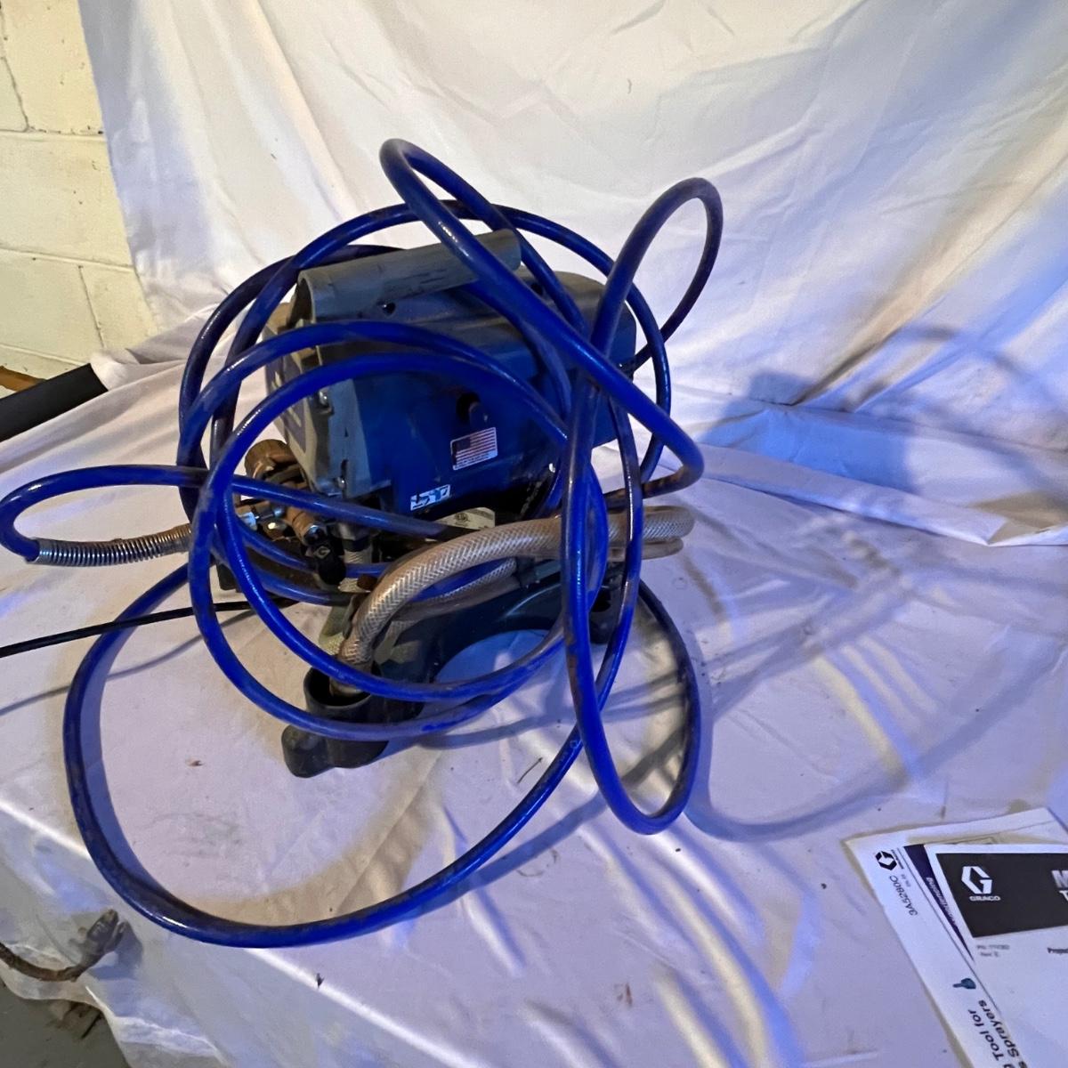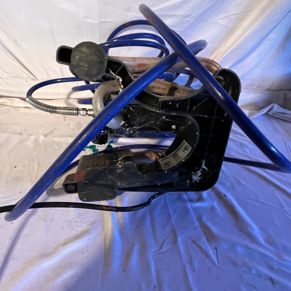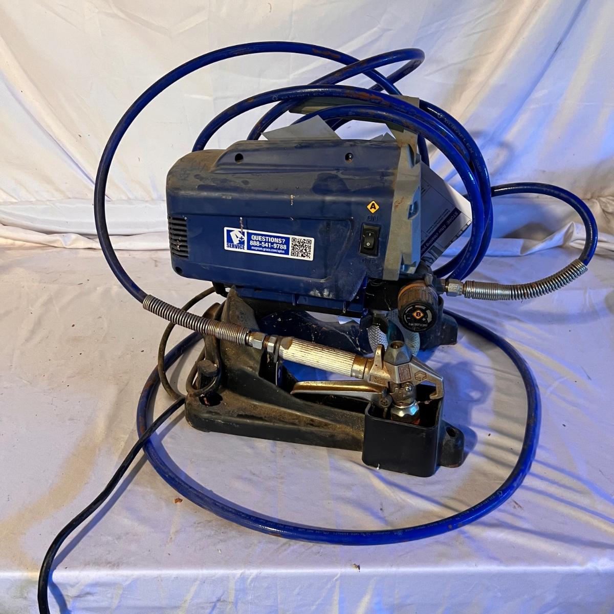 This airless paint sprayer powered on when plugged in. It measures approximately 19” x 10” x 16”H.