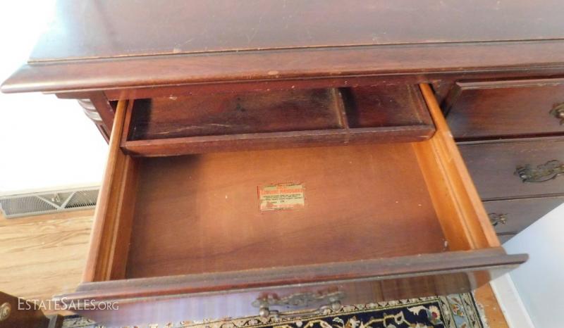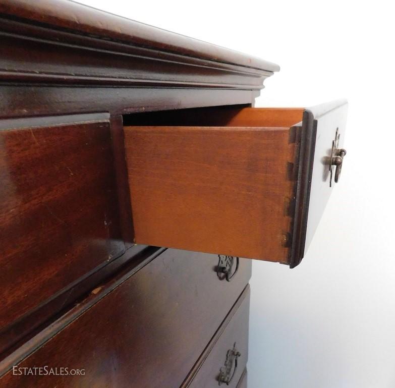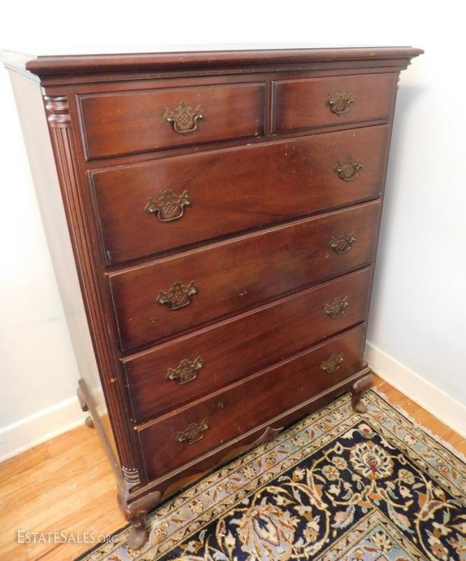 Very nice solid mahogany highboy dresser with 2 over 4 drawers. Queen Ann style with fluted trim. Older piece but in good condition.