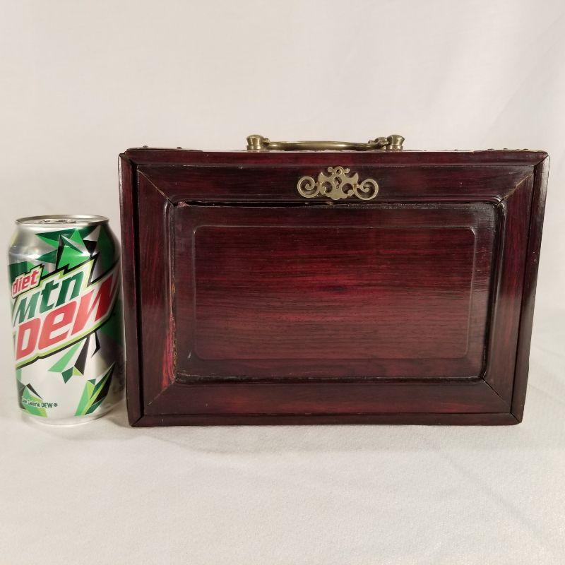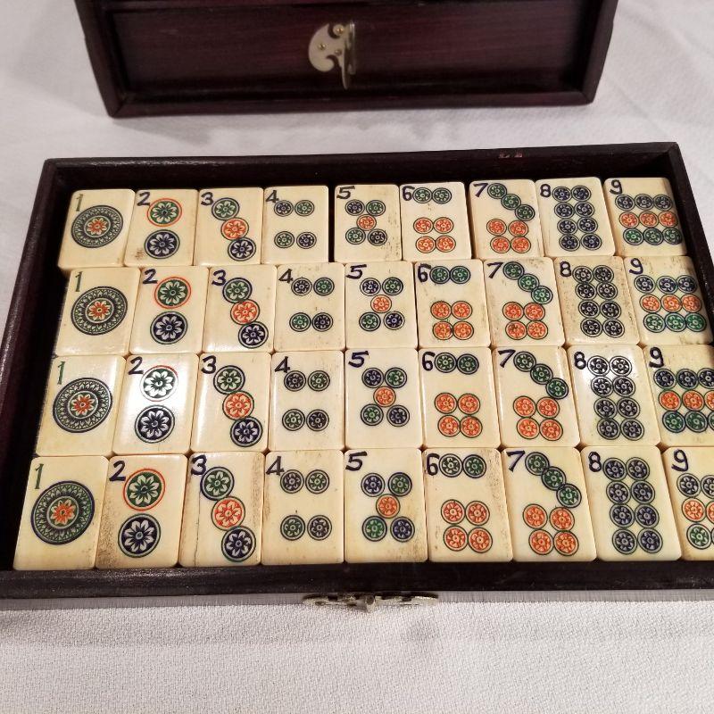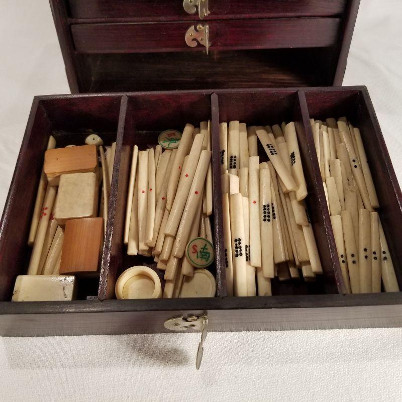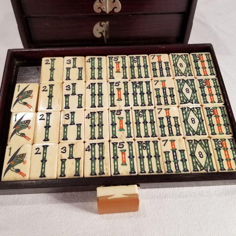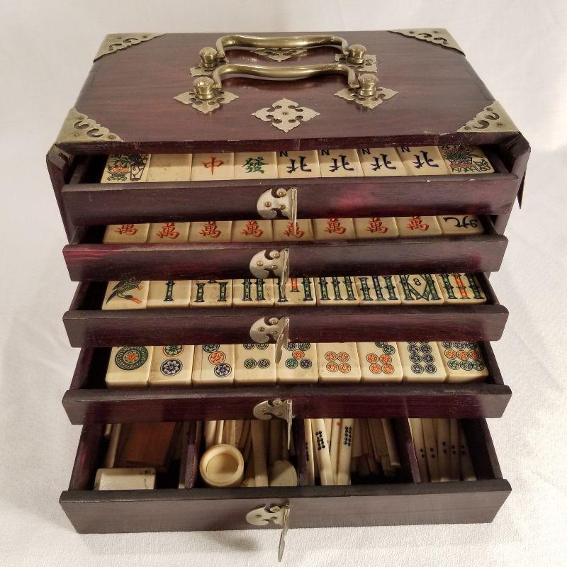 A most unique Mahjong Set skillfully crafted of bone and bamboo placed in a beautiful wood carrier. Carrier is Asian Mahogany with brass handles and accents. Condition is very good for it’s age. Contains 5 individual drawers which hold the unused game pieces and supplies. The individual tiles are laminated with bone and bamboo and hand painted ““ very amazing quality workmanship. NOTE: there is a small reserve set on this item by the consigner.