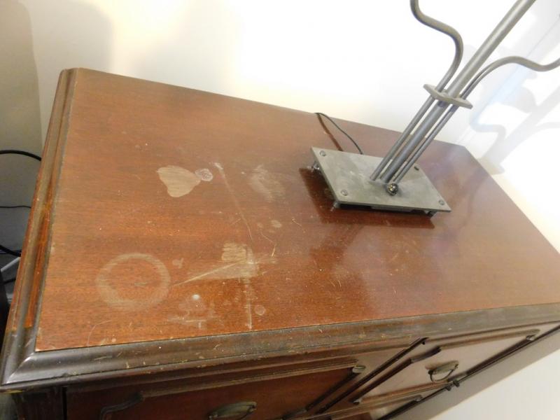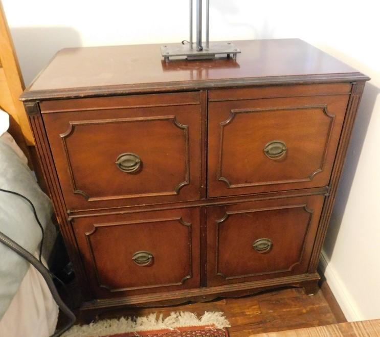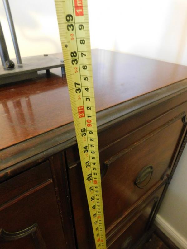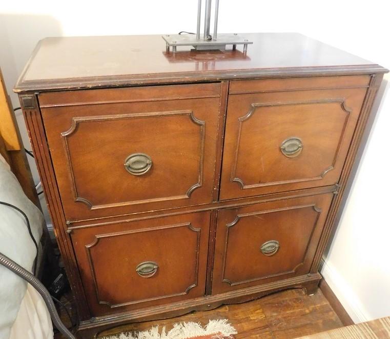 Mahogany 4 Door Cabinet with wear to the finish and scratches to surface
