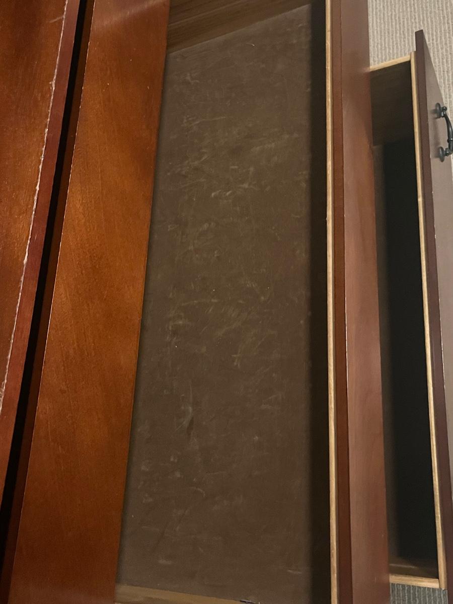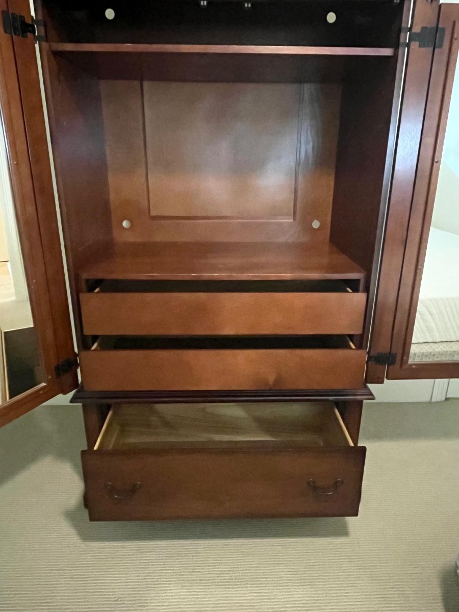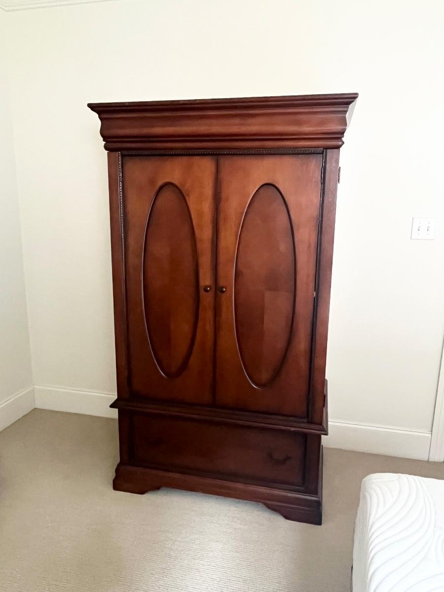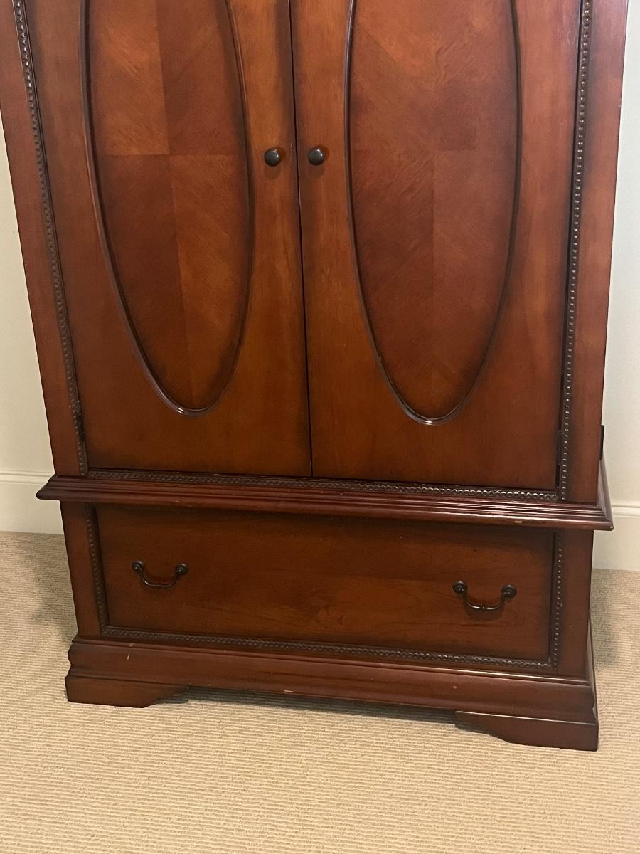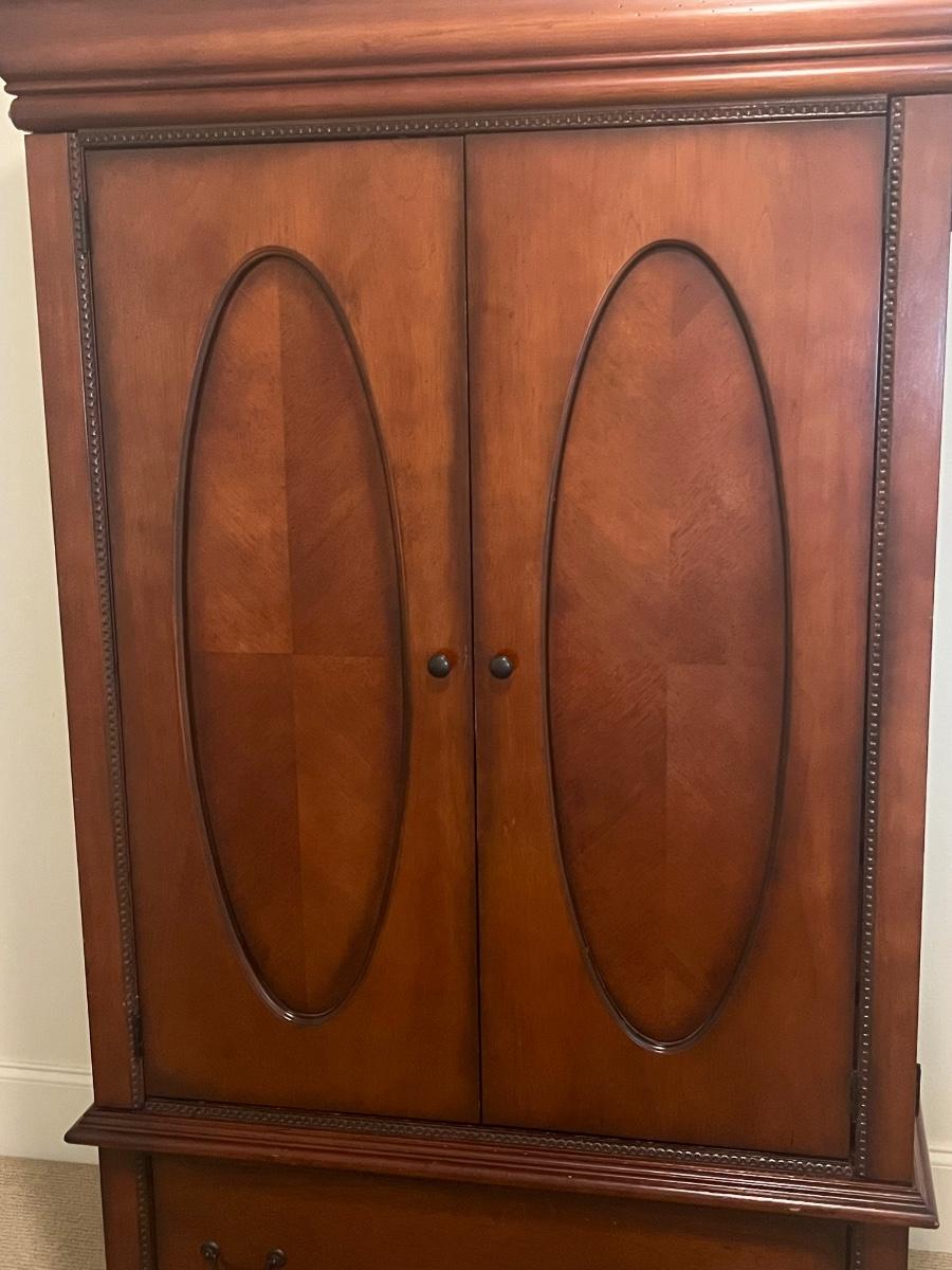 One Piece ~ Overall dimension = 73” H x 44” W x 25” D ~ minor wear & tear ~ doors have mirrors on the inside ~ single shelf is adjustable ~ inside dimensions without the shelf is 29' H x 37" W x 21" D ~ All three drawers are felt lined