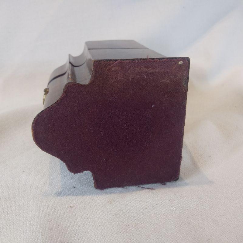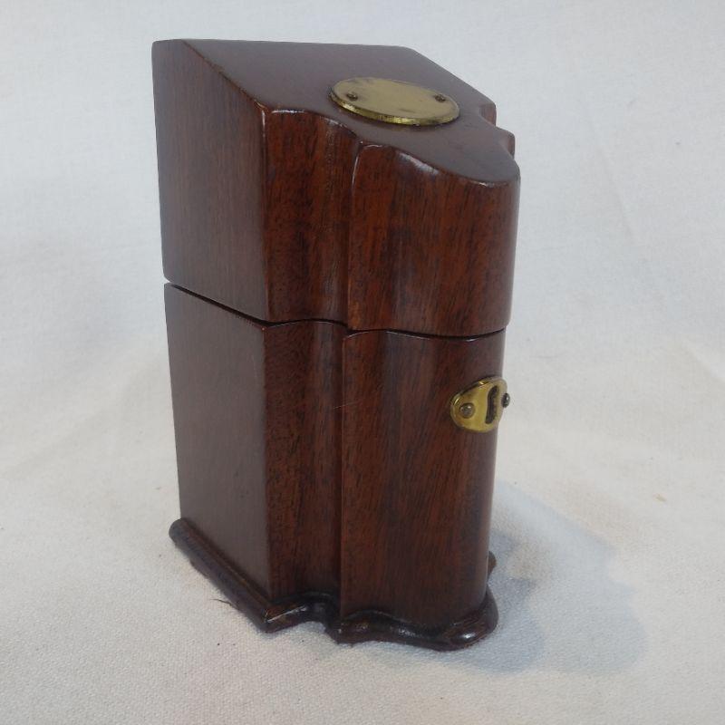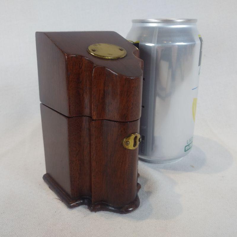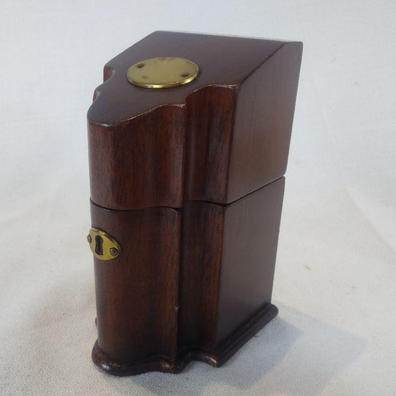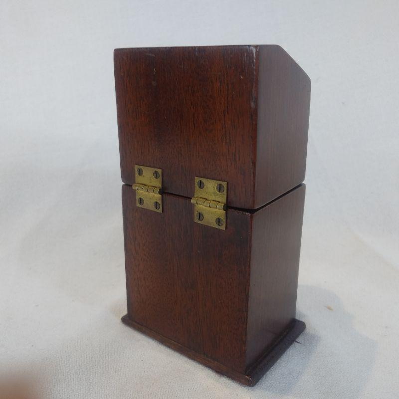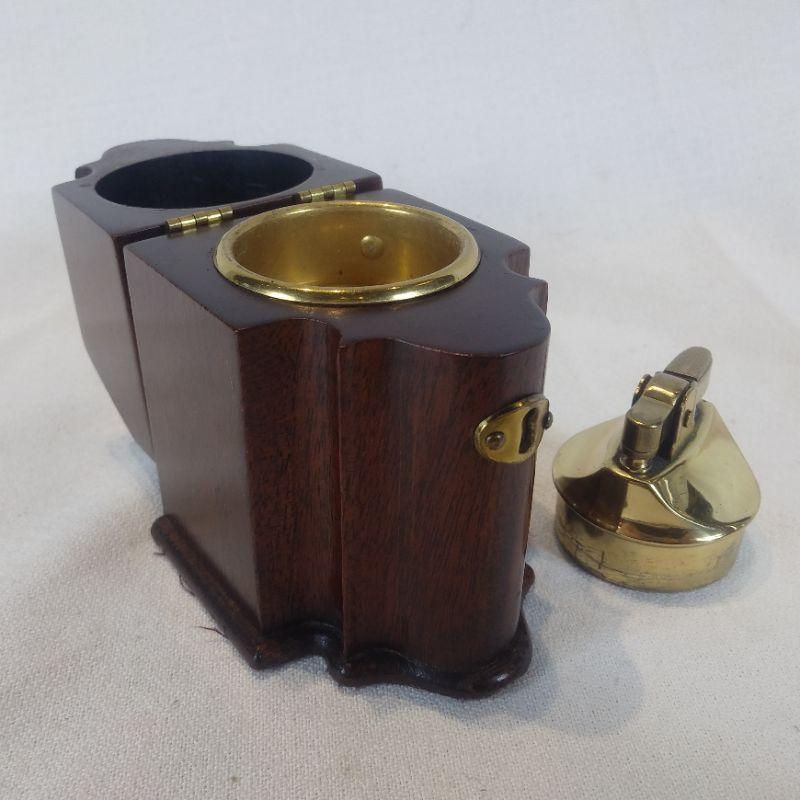 This is a very fancy cigarette lighter indeed. No maker noted but the wood is mahogany and in very good shape. It measures 4 3/4-inches tall X 3-inches deep X 2 1/2-inches wide. Reserve/Starting Bid is $10.