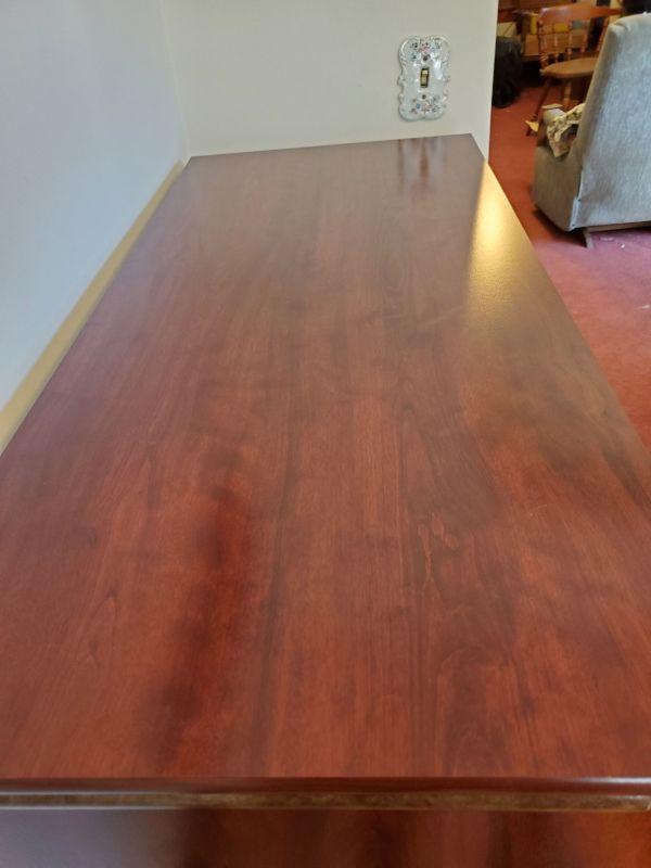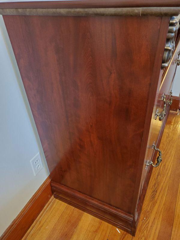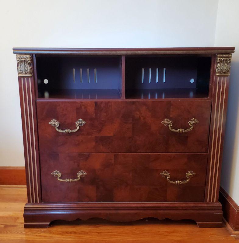 Originally used as a tv stand, this makes an excellent server. The finish is in great condition but the top drawer needs regluing. It is 44" wide, 20" front to back, and 41" high.