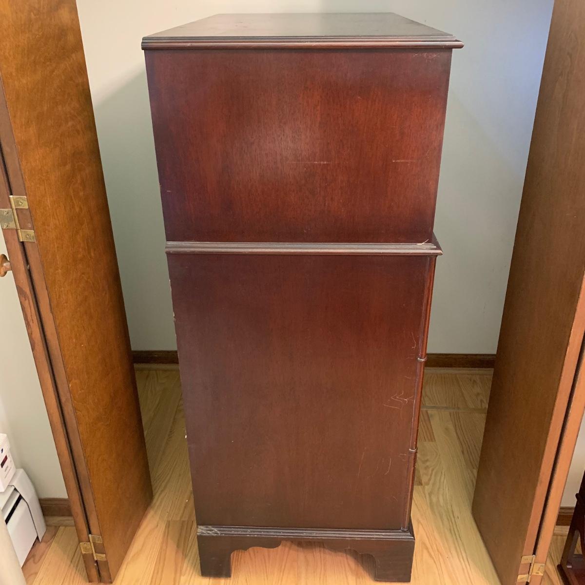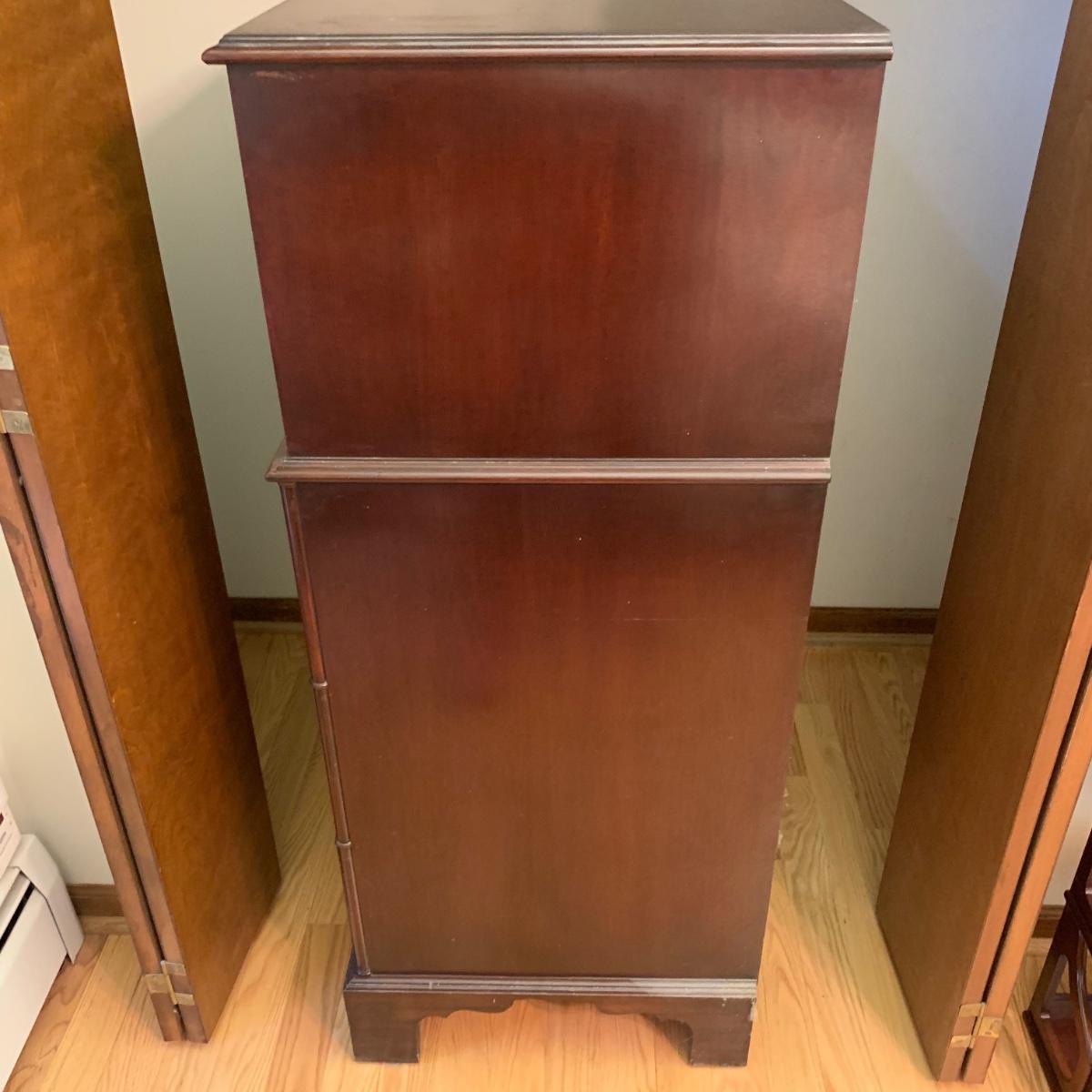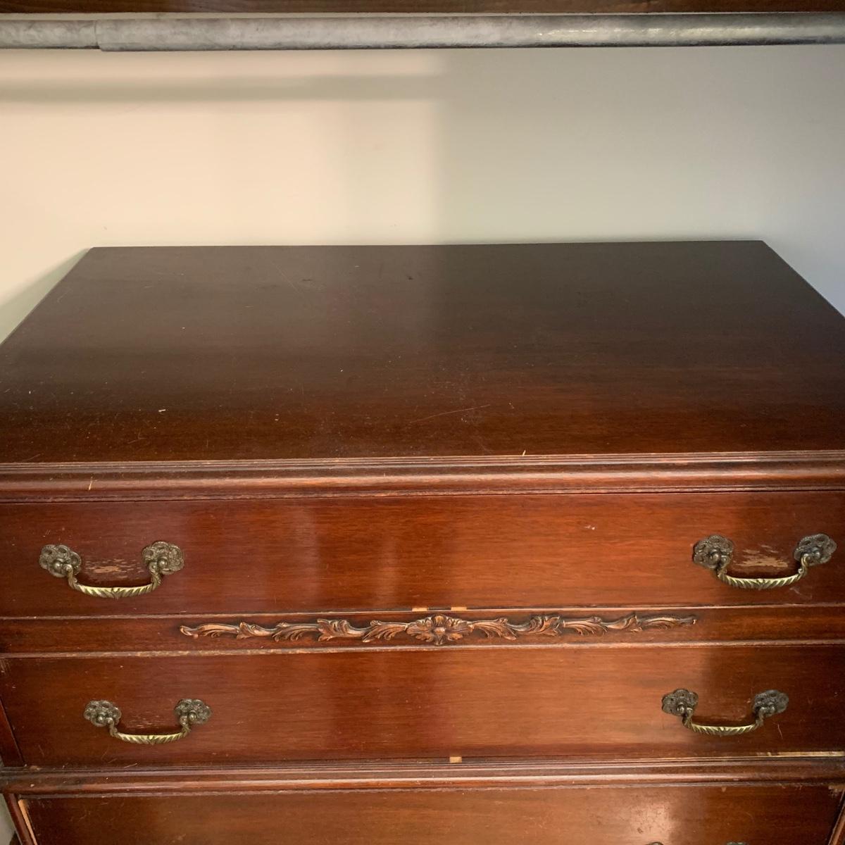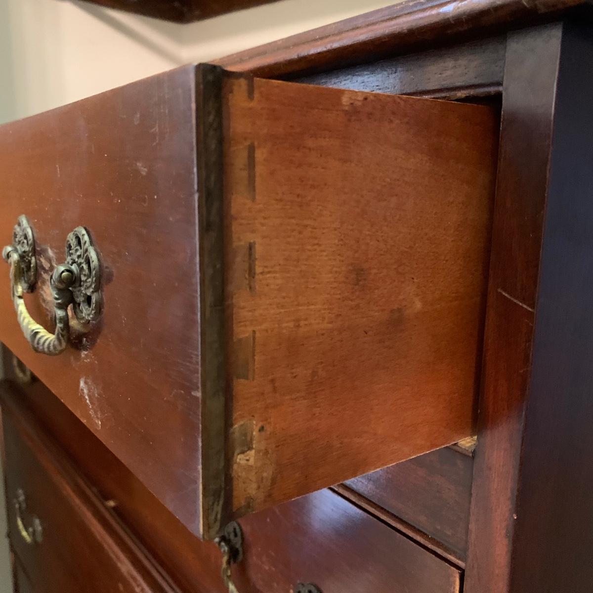 Antique chest on chest, made of what appears to be mahogany. This unique piece is crafted using dovetail joinery and features lovely brass-like hardware. Please note minor blemishes and see photos for more details. Chest on chest measures approximately, 36” x 21” x 52”H. Shipping available. Local pickup only. Winning bidder must bring assistance to help move and load this item due to its weight and/or size.