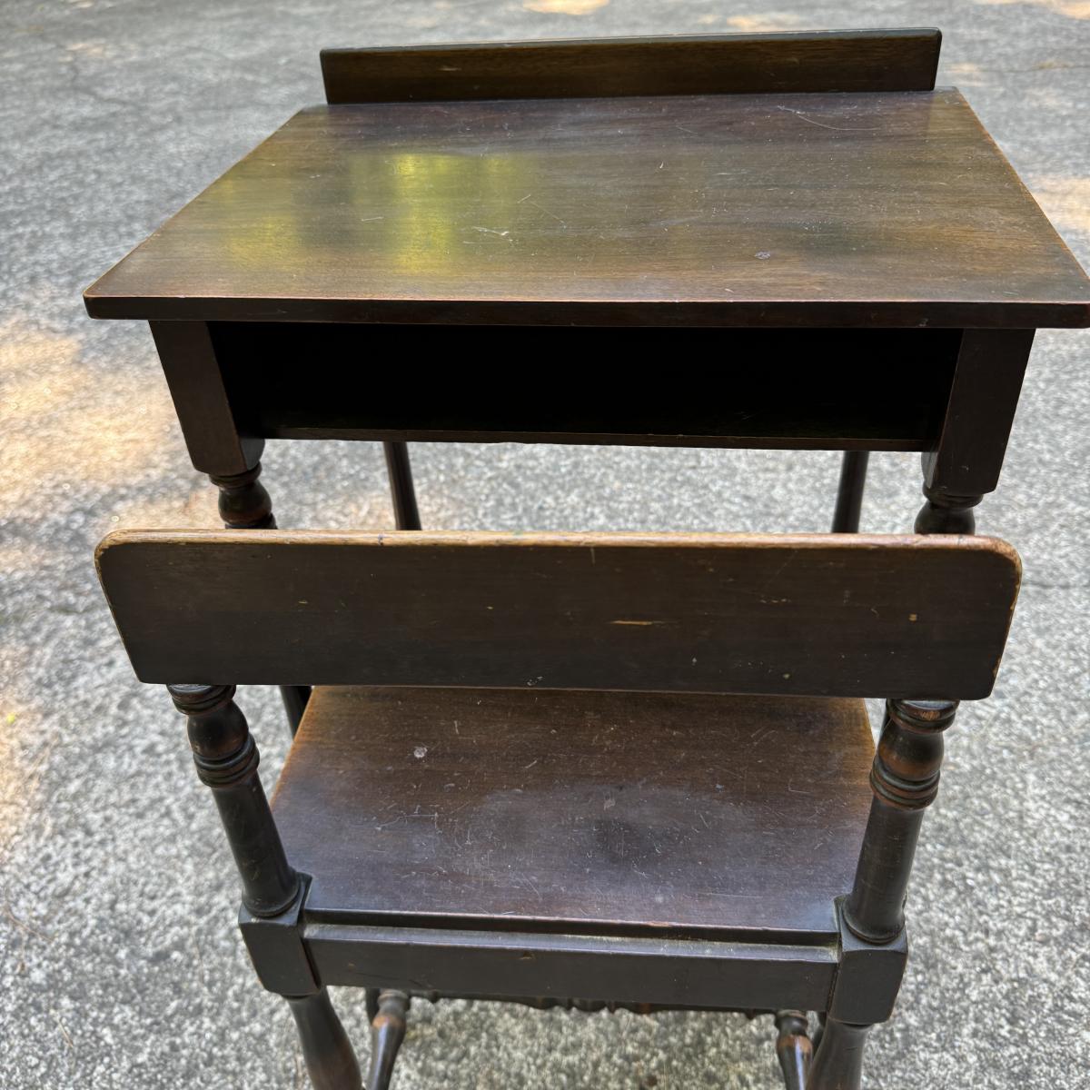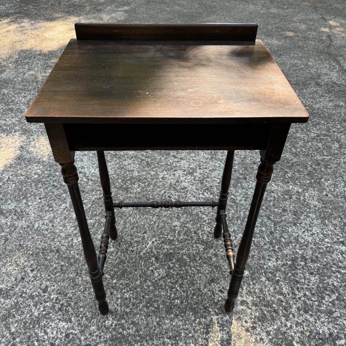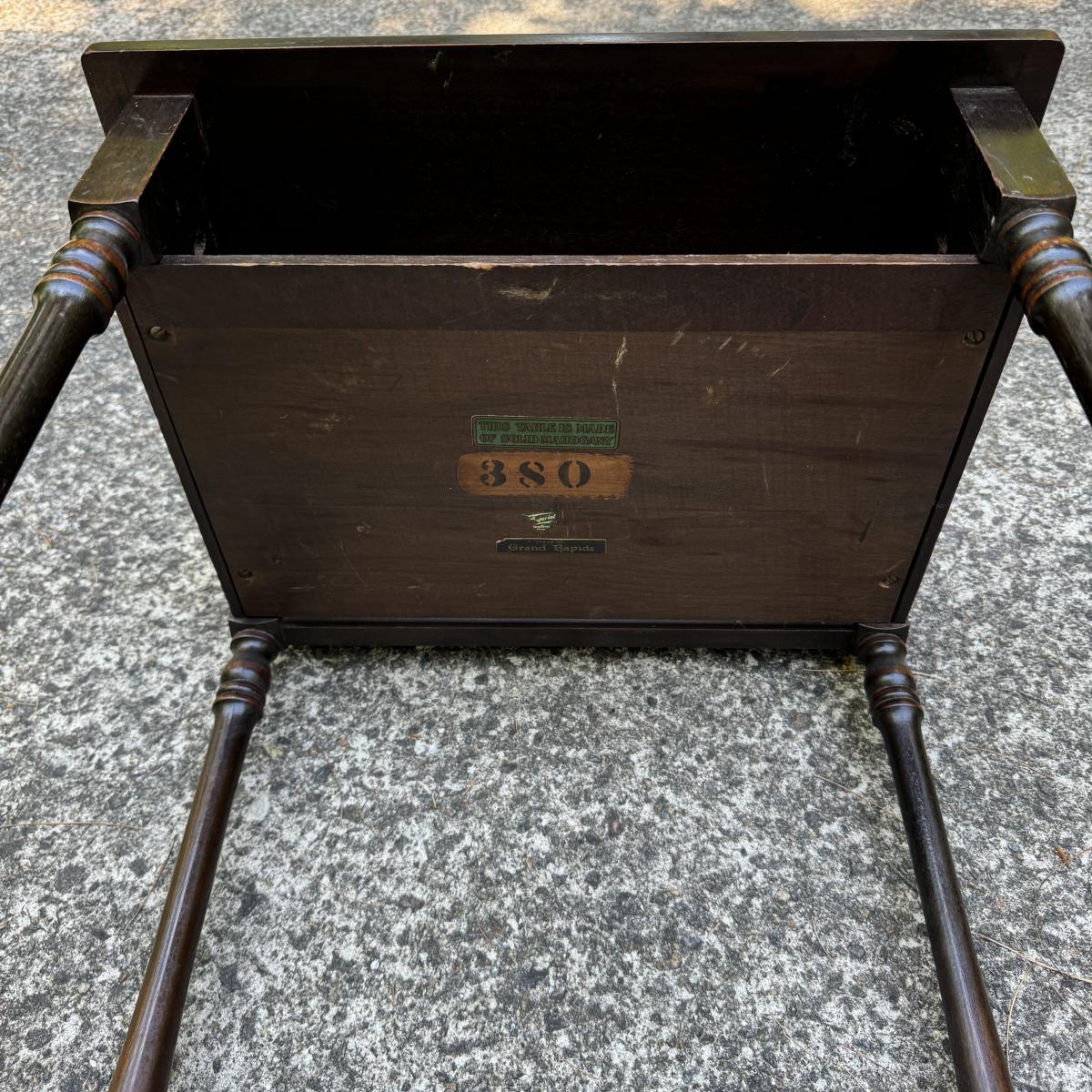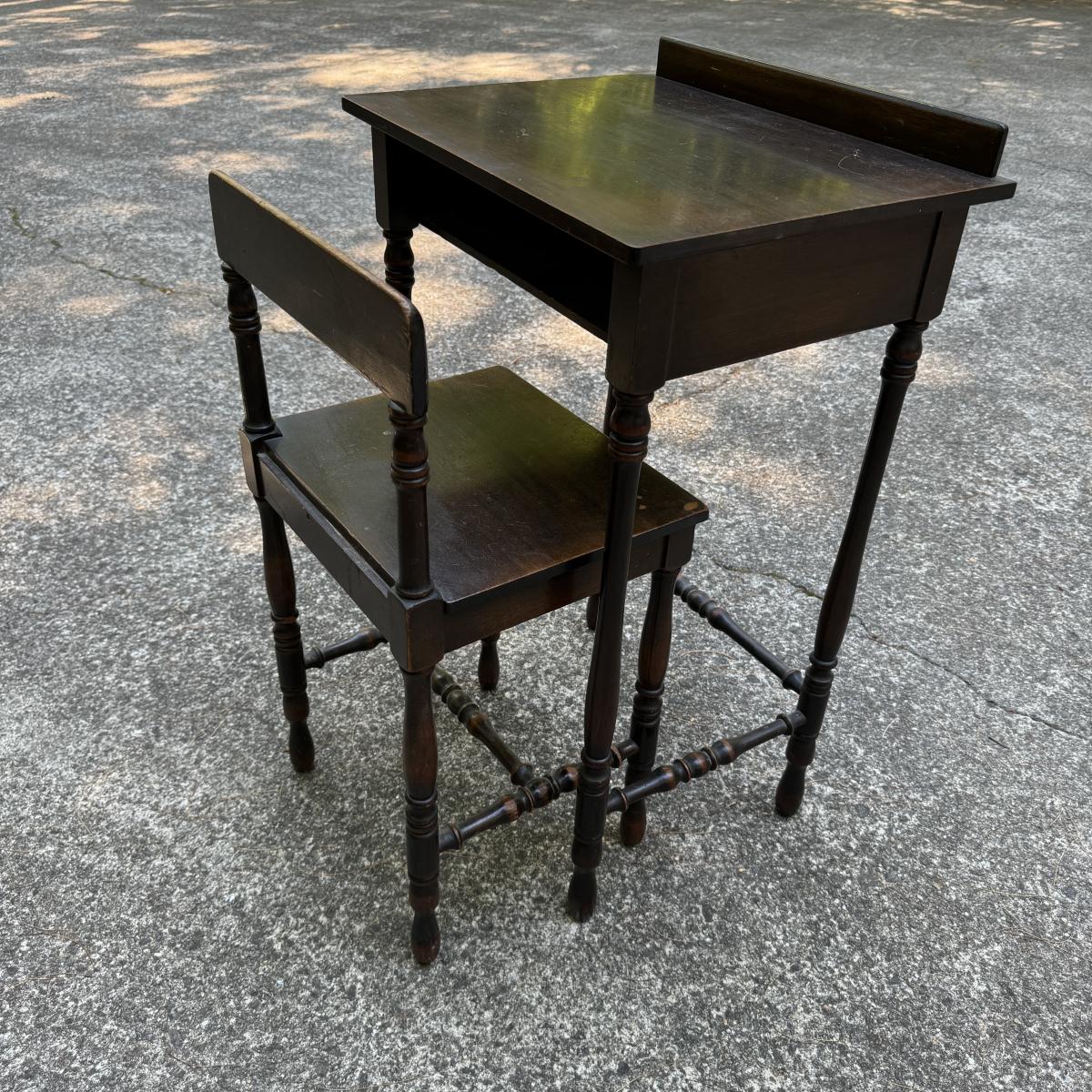 Cute delicate mahogany child desk made in Grand Rapids. Label is worn but appears to say 'Imperial'. Lightweight but sturdy. Chair fits perfectly under desk for easy storage. Thin legs have nice design. Has a built in shelf for papers. Some wear on wood per age. Measures 18” x 14” x 28”H.