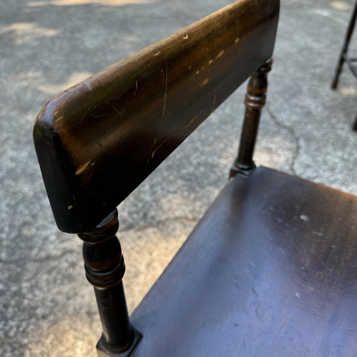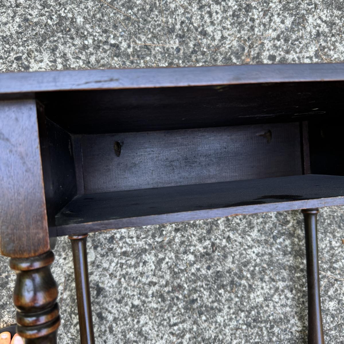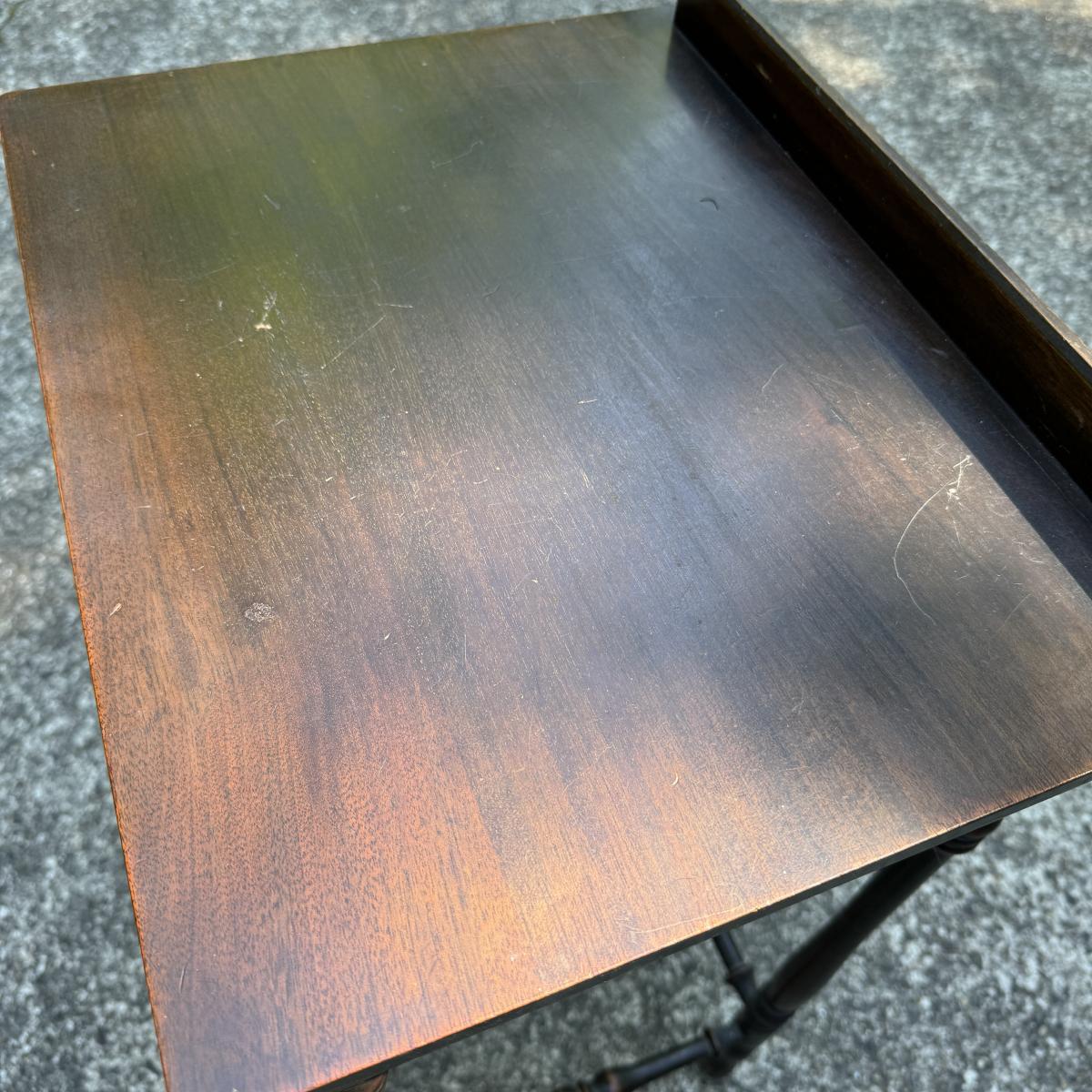 Cute delicate mahogany child desk made in Grand Rapids. Label is worn but appears to say 'Imperial'. Lightweight but sturdy. Chair fits perfectly under desk for easy storage. Thin legs have nice design. Has a built in shelf for papers. Some wear on wood per age. Measures 18” x 14” x 28”H.