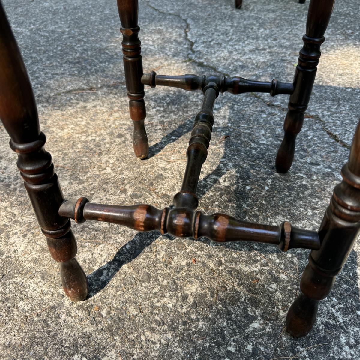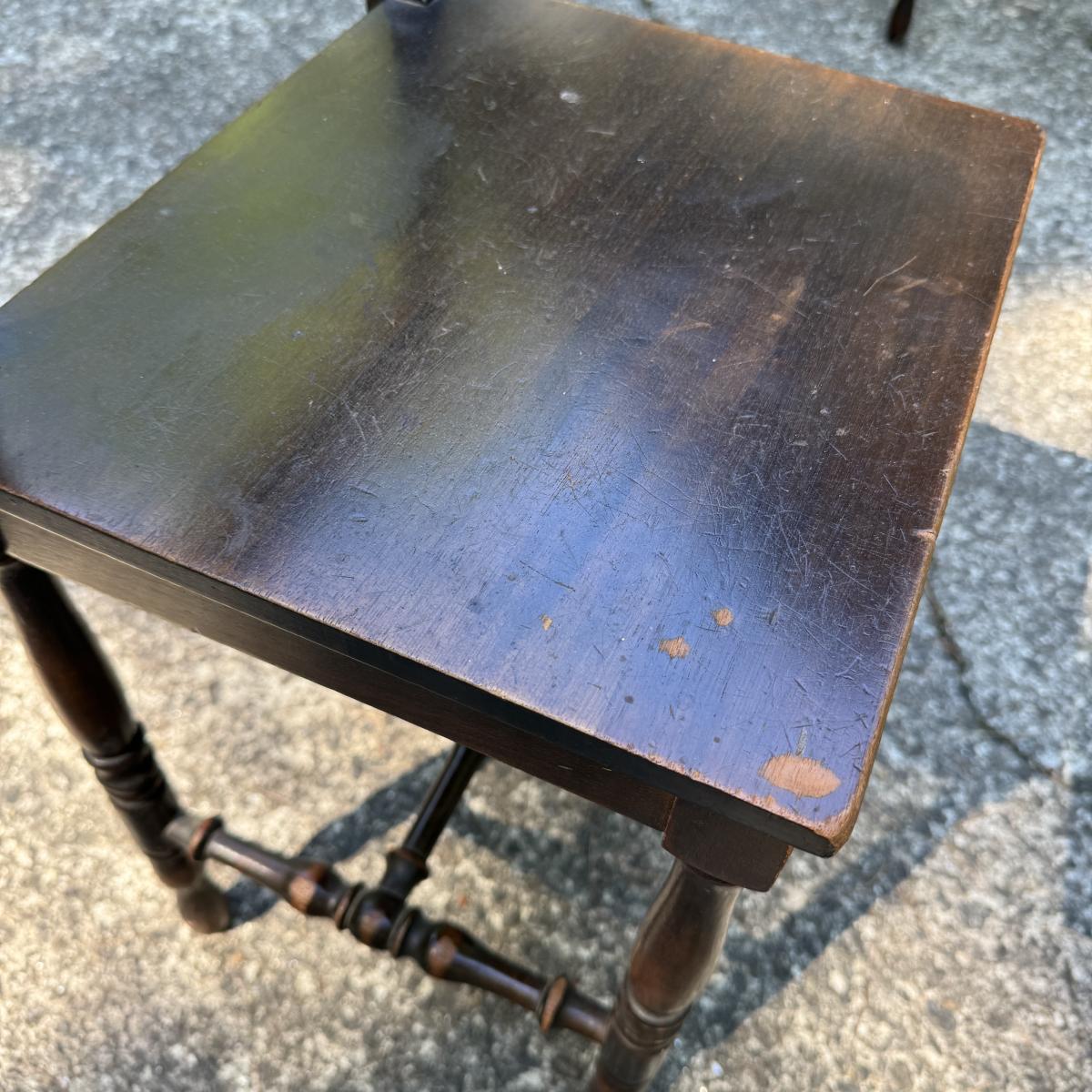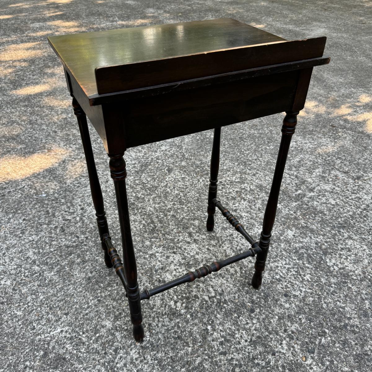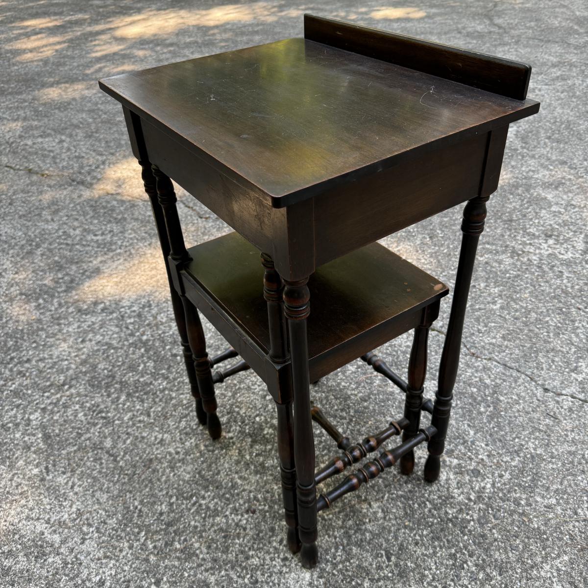 Cute delicate mahogany child desk made in Grand Rapids. Label is worn but appears to say 'Imperial'. Lightweight but sturdy. Chair fits perfectly under desk for easy storage. Thin legs have nice design. Has a built in shelf for papers. Some wear on wood per age. Measures 18” x 14” x 28”H.