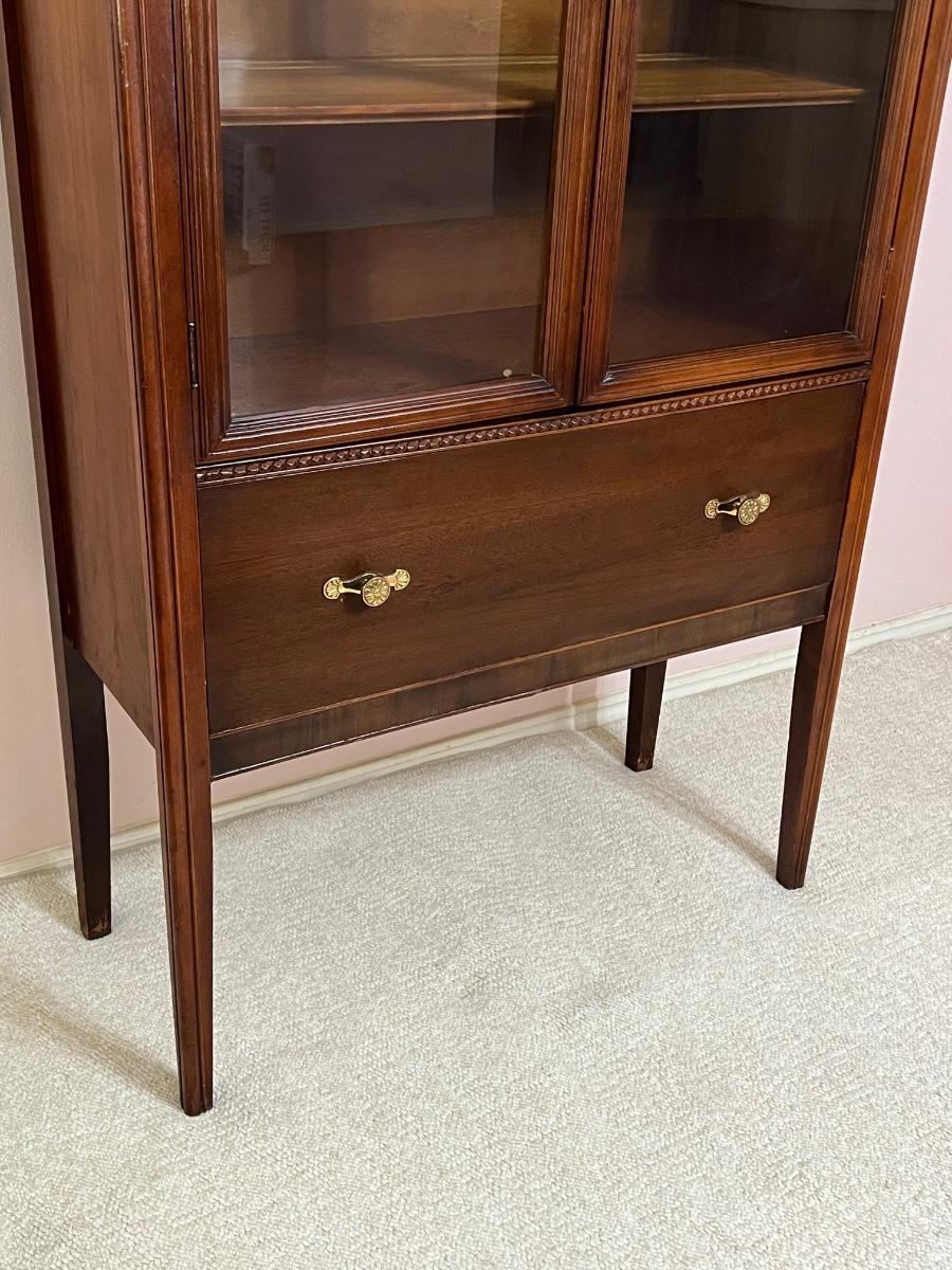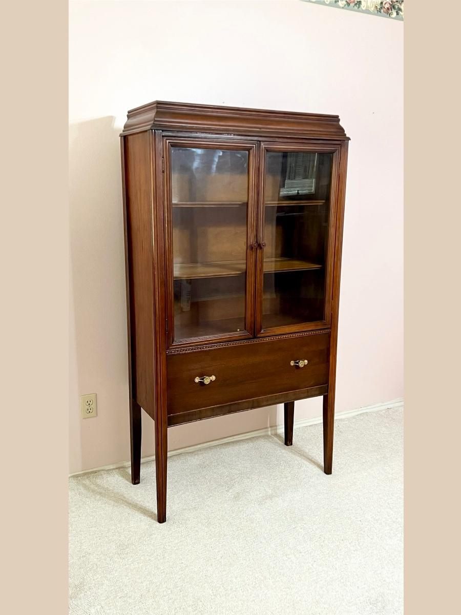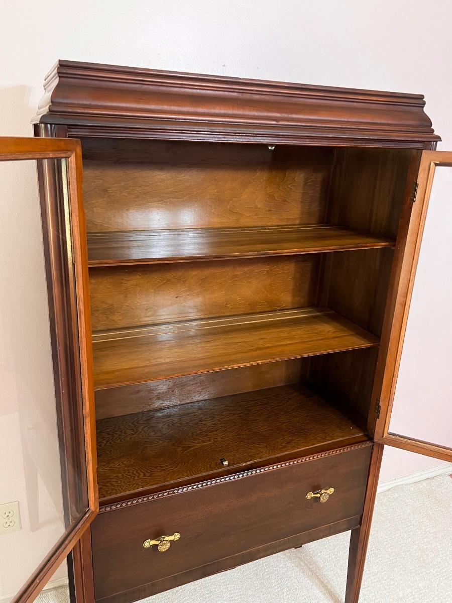 Shelves are removable but not adjustable ~ Drawer slides easy ~ no brand ~ Has had minor repair & back legs have wear, see photos for condition ~ 66” H x 36” W x 15.25” D