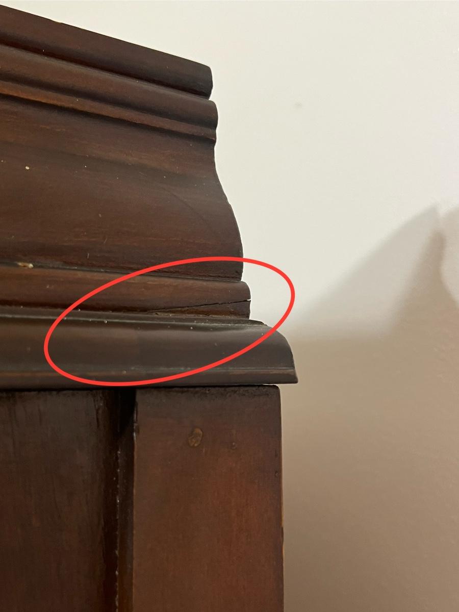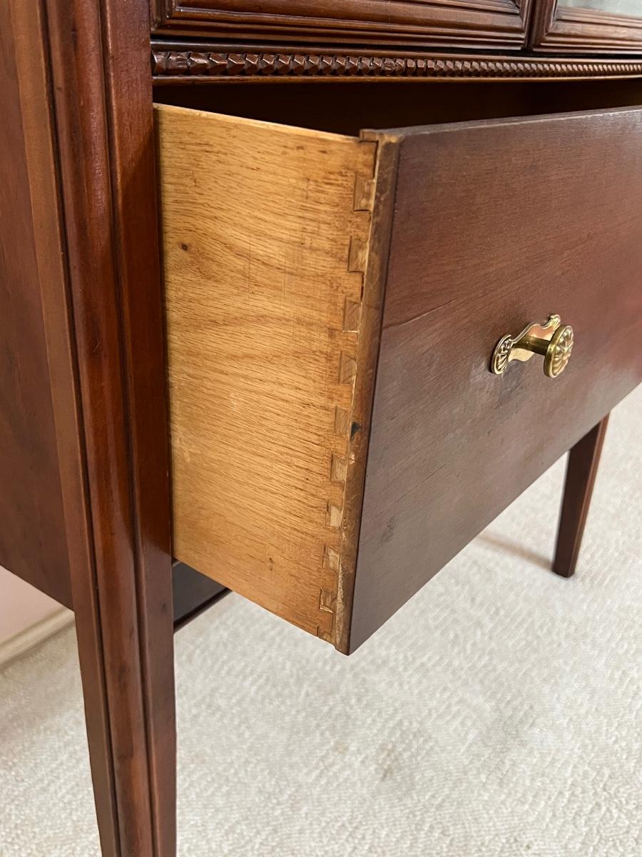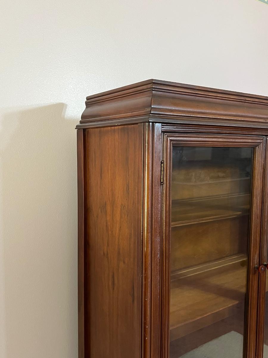 Shelves are removable but not adjustable ~ Drawer slides easy ~ no brand ~ Has had minor repair & back legs have wear, see photos for condition ~ 66” H x 36” W x 15.25” D