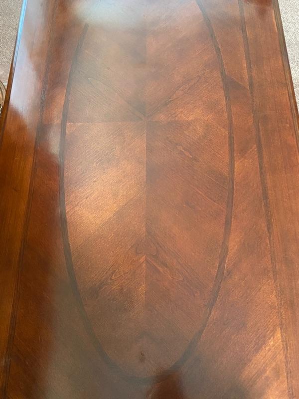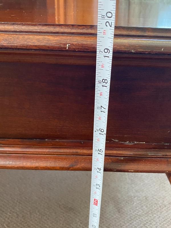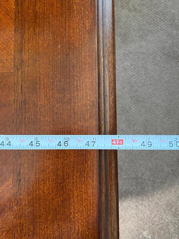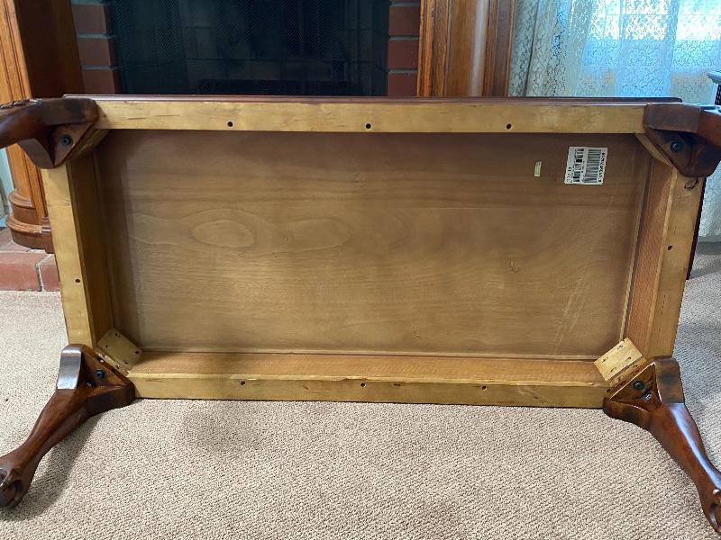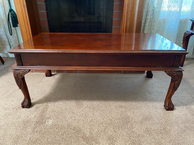 Newer mahogany coffee table. Claw foot design legs. In good condition, no obvious scratches to the surface. One leg is loose and needs to be tightened up. Matches end tables up for auction.. Measures 4'x24" and is 20" tall. #24-10006