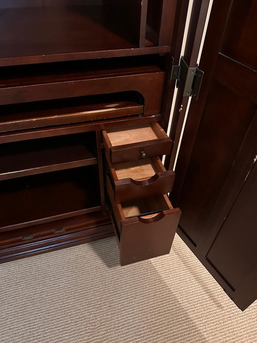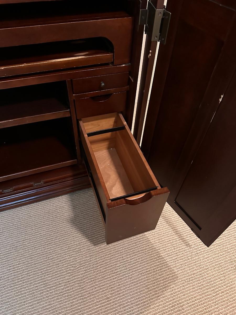 Hide your computer and desk accessories in this heavy one piece computer Armoire ~ 67” H x 42” W x 21.5” D ~ pull out trays and a few small drawers to keep your accessories. Also there is a small file drawer (see photo) ~ has minor surface scratches from use ~ This is one piece.