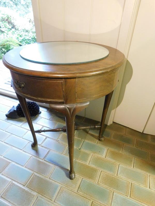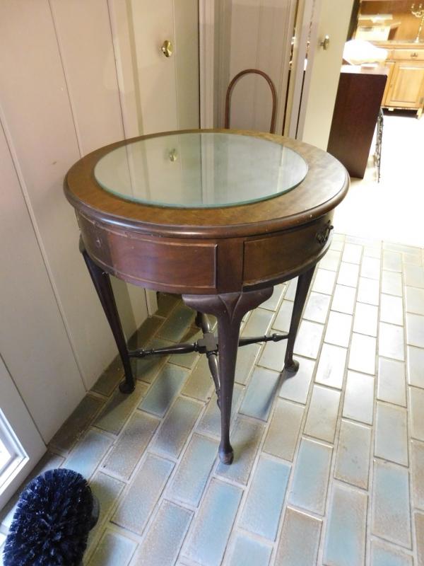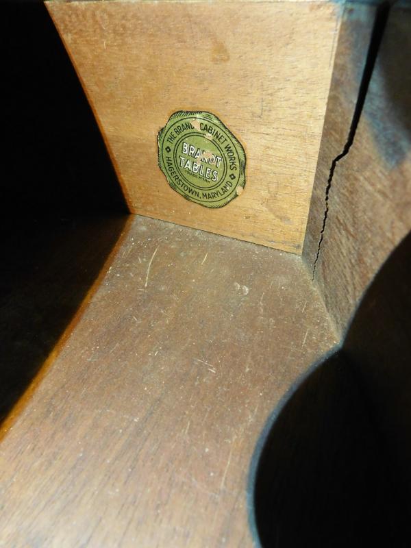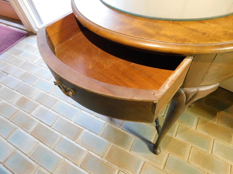 Mahogany Drum Table by Brandt Wood Works has some scratches and a repair on drawer.