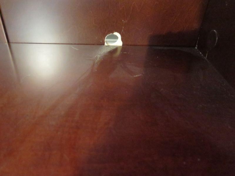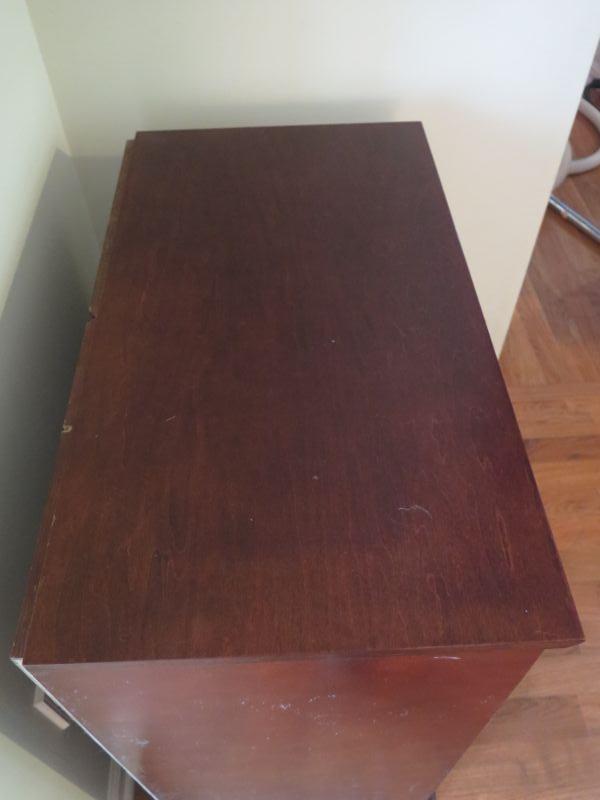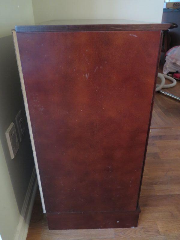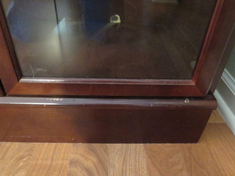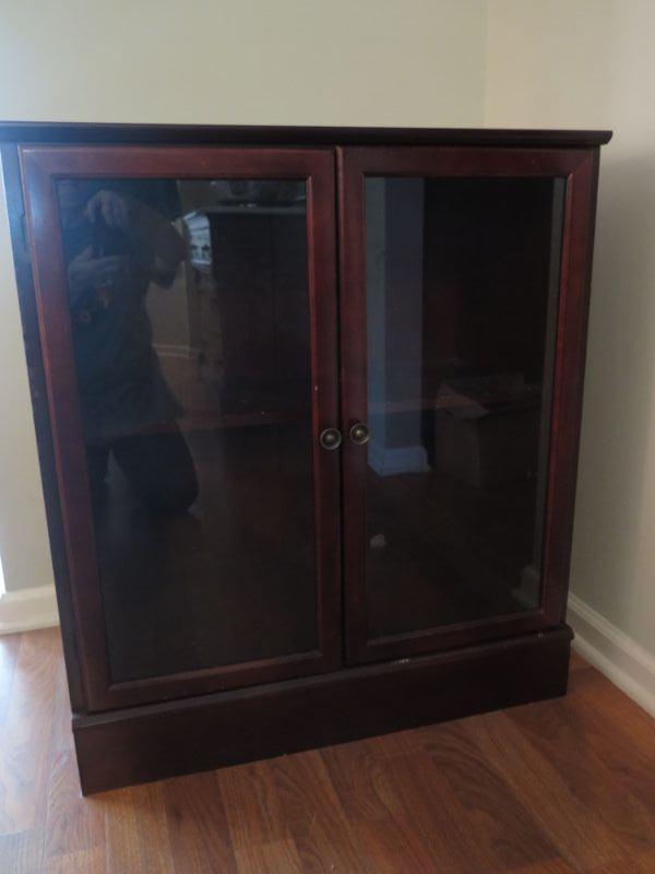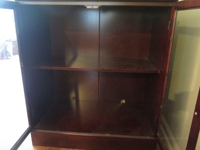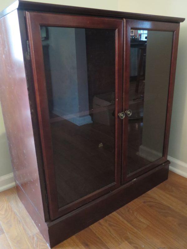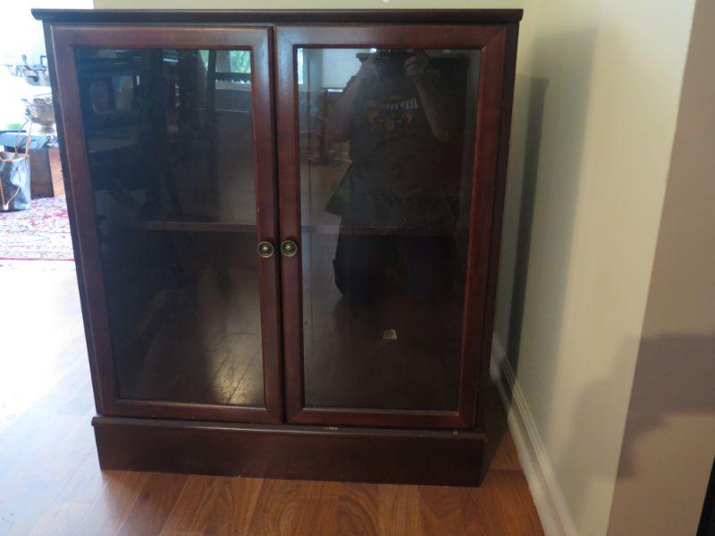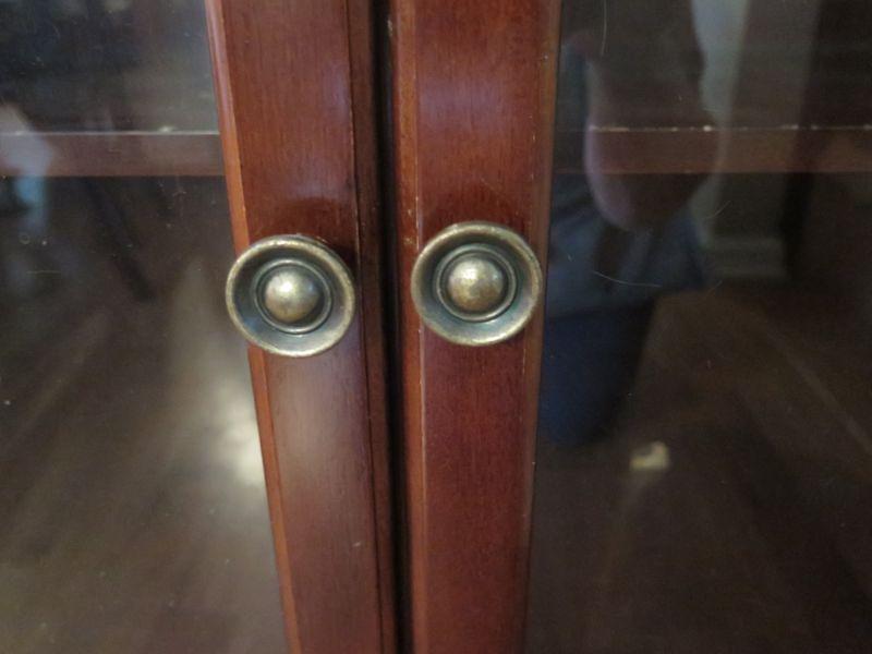 Glass-front mahogany cupboard with 1 shelf. **Please read Terms and Conditions before placing a bid. Pick up is Sunday, September 1, 2019 from 10am to 4pm in Williamstown. All sales are final. All sales are as is, where is. Please review all photos. Any props included in photos are not included in listing. All measurements are approximate. Comes from a home with cats.
