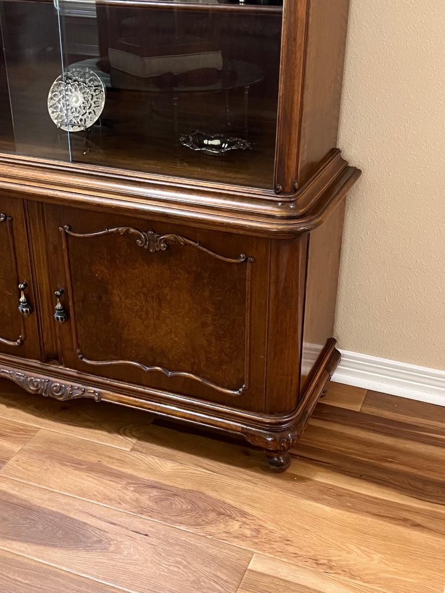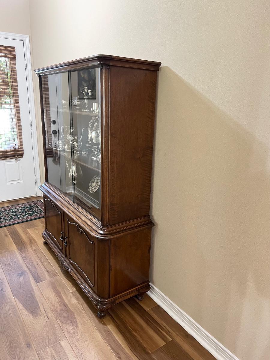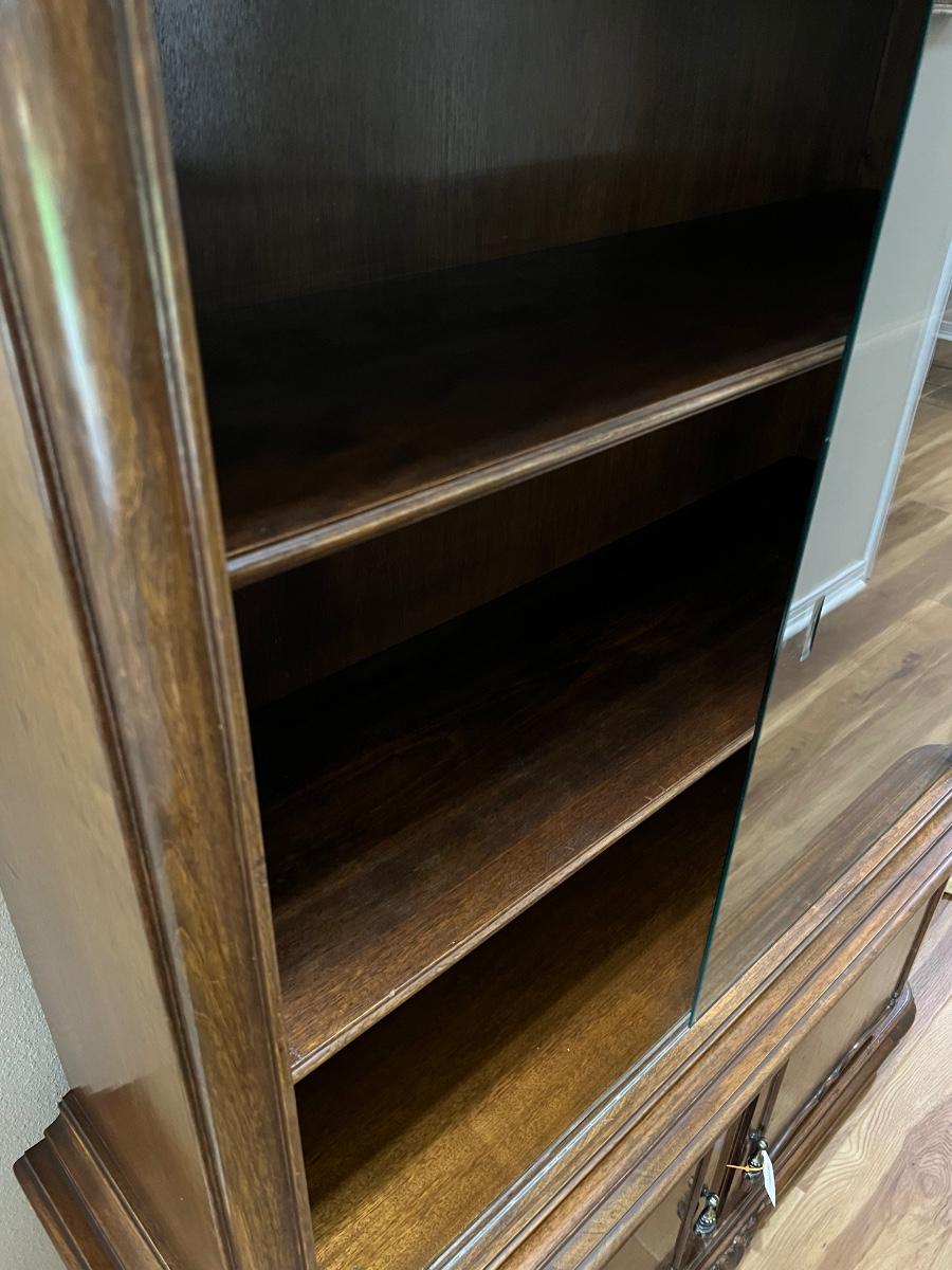 1 piece ~ Shelves are adjustable ~ No brand ~ One glass door has a minor chip on the side panel, see photos ~ Items in cabinet sold separately ~ 63.25” H x 51” W x 17” D