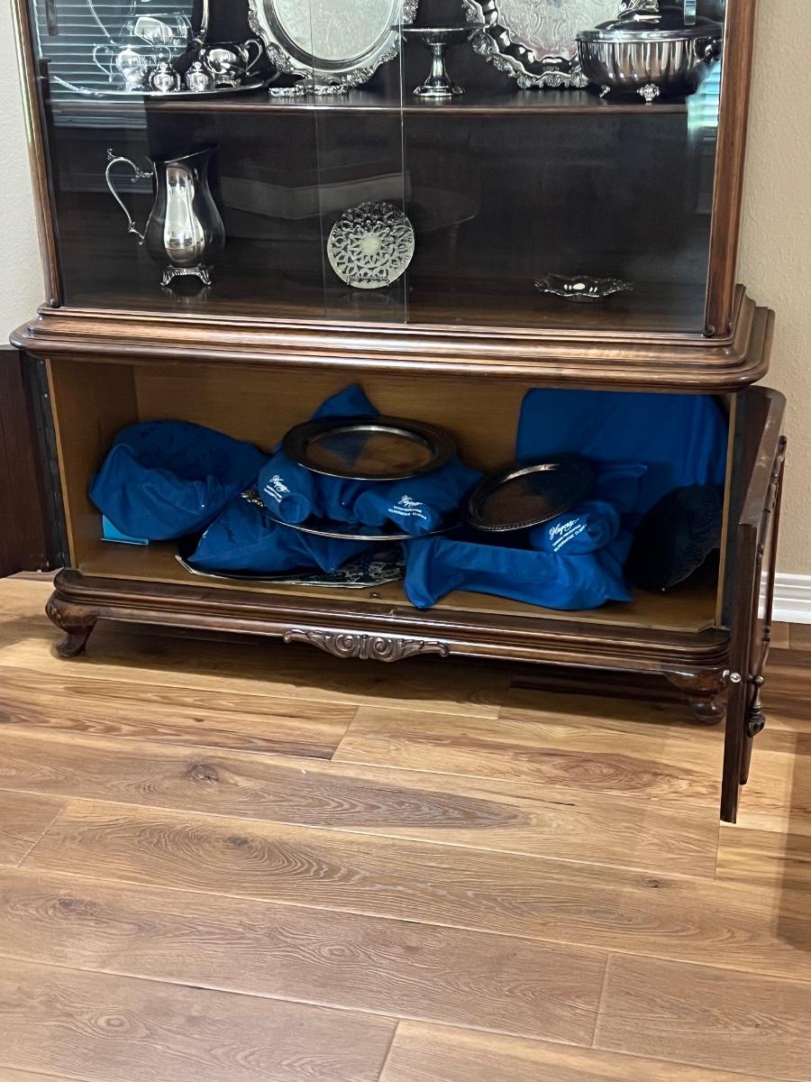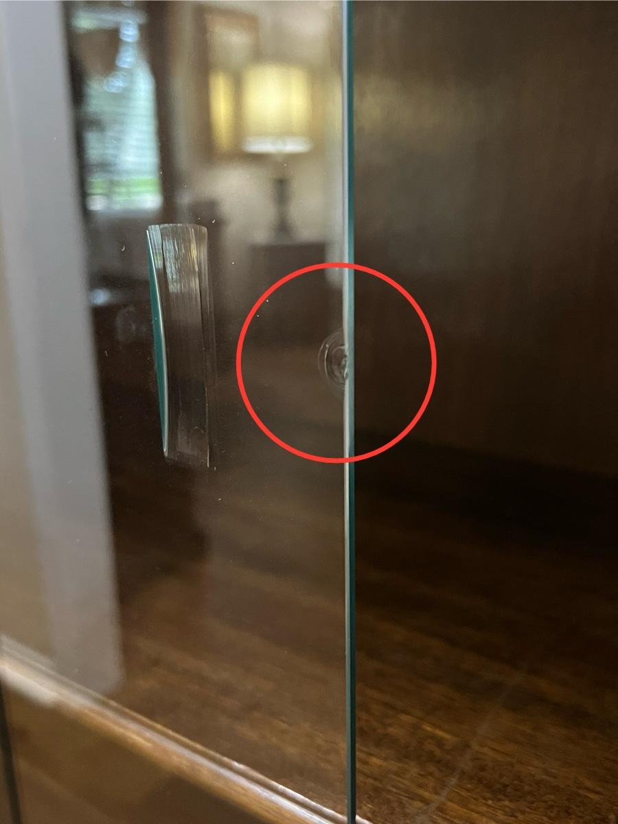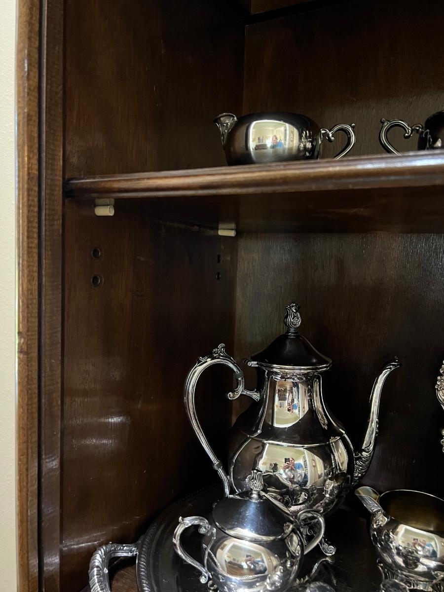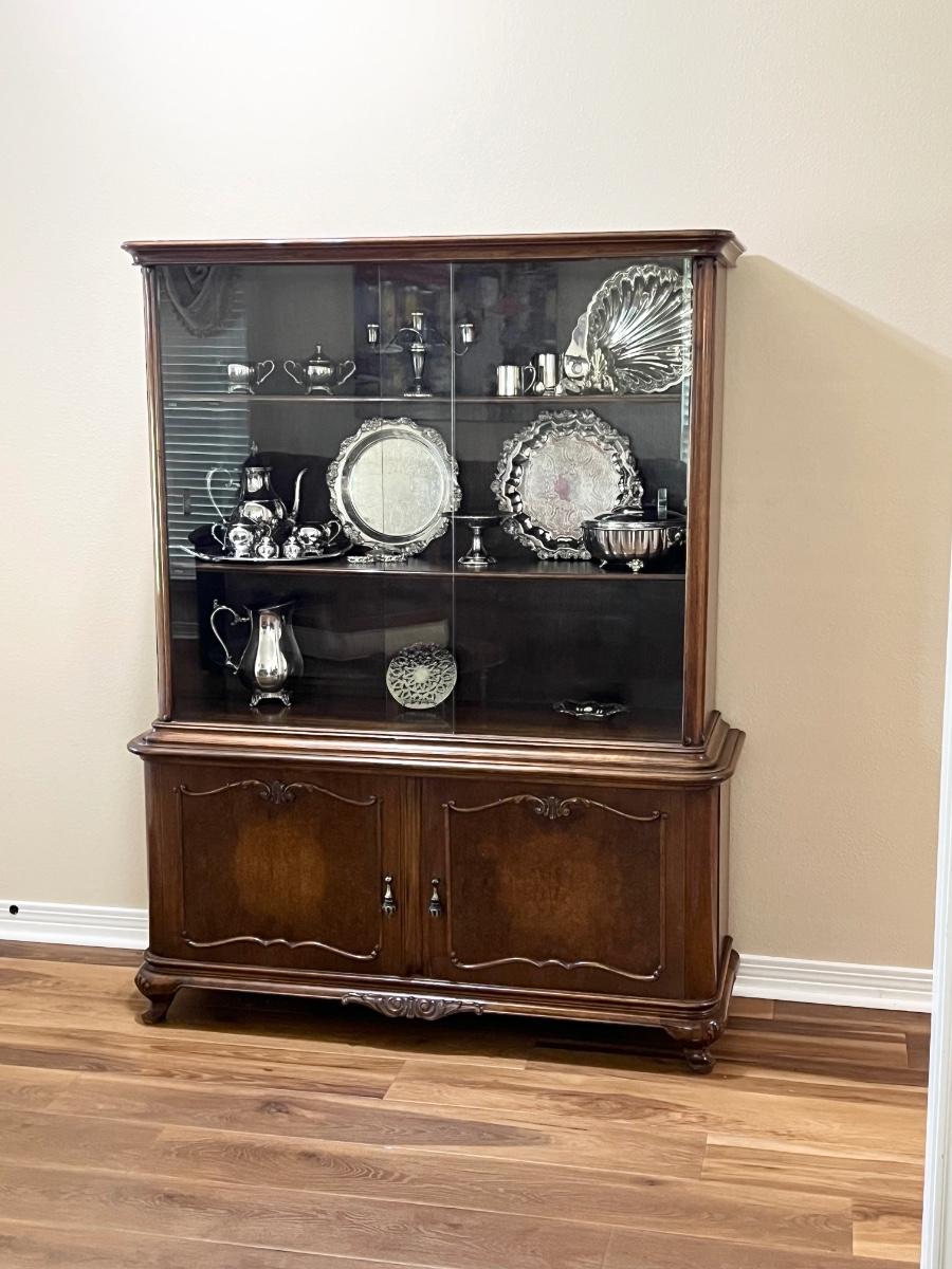 1 piece ~ Shelves are adjustable ~ No brand ~ One glass door has a minor chip on the side panel, see photos ~ Items in cabinet sold separately ~ 63.25” H x 51” W x 17” D