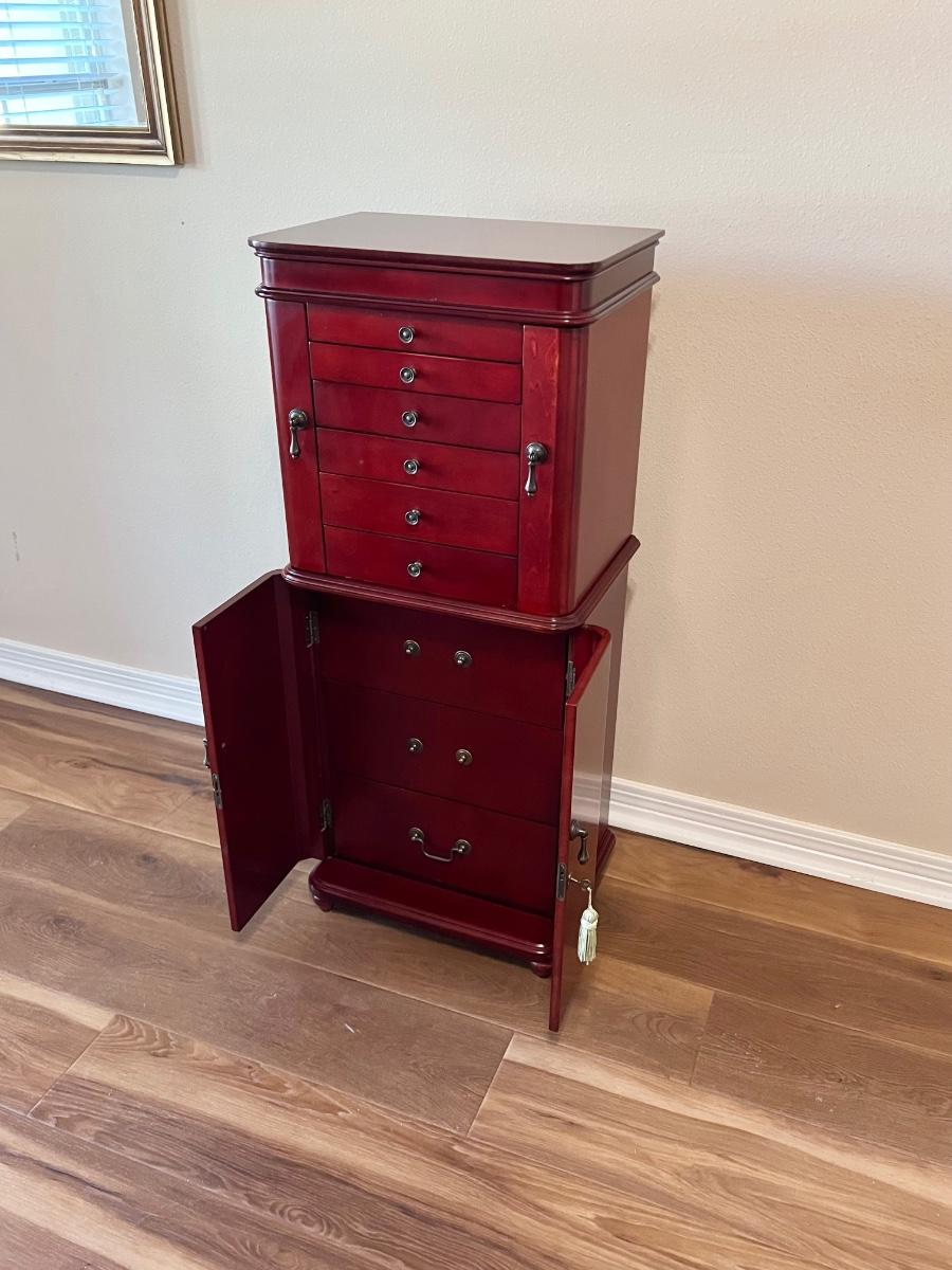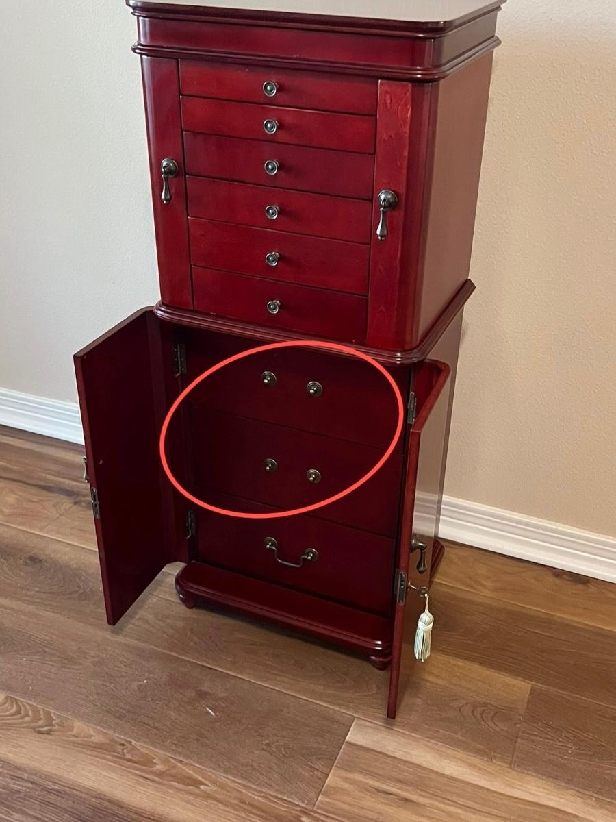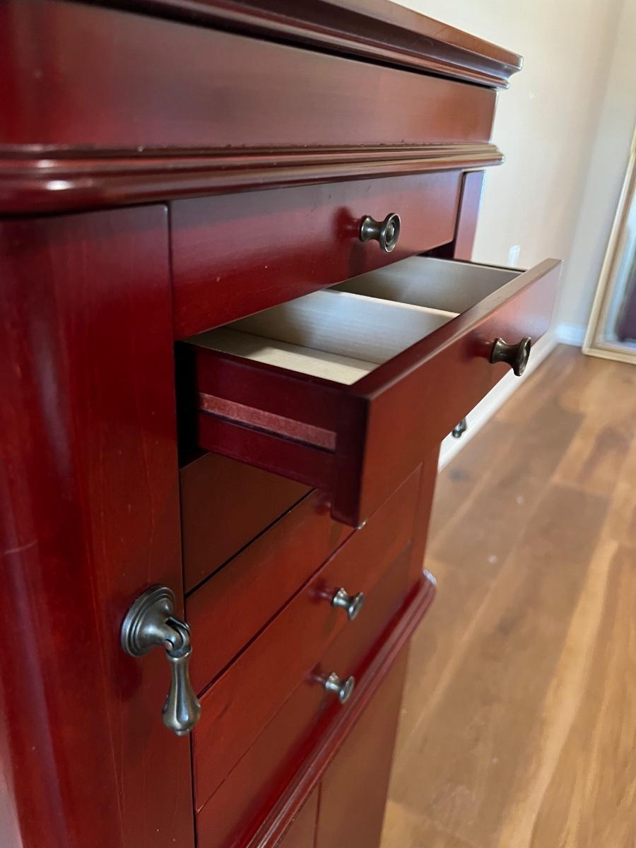 Drawers slide easy ~ No brand ~ Has key but does not lock, 2 bottom drawers behind cabinet doors are missing handles, see photos ~ 39.25” H x 16.5” W x 12” D