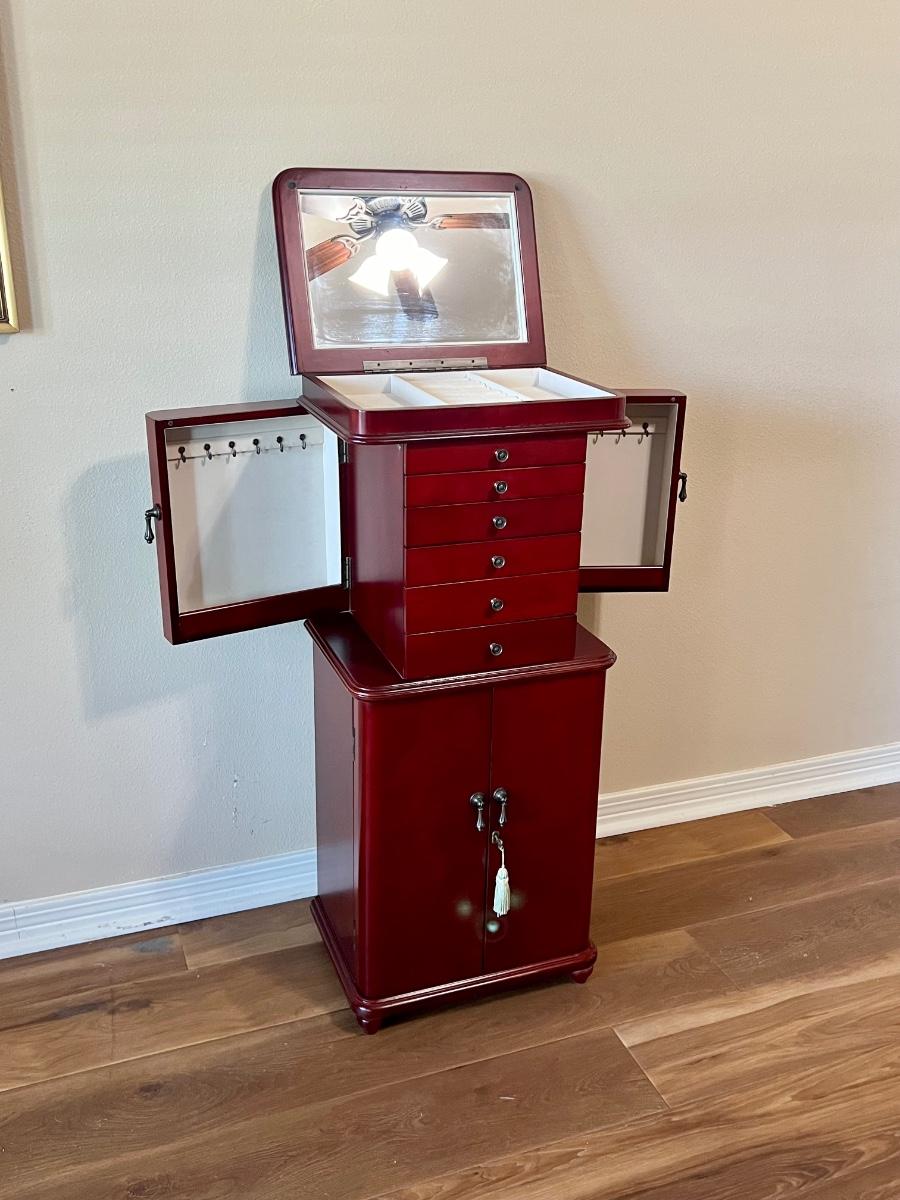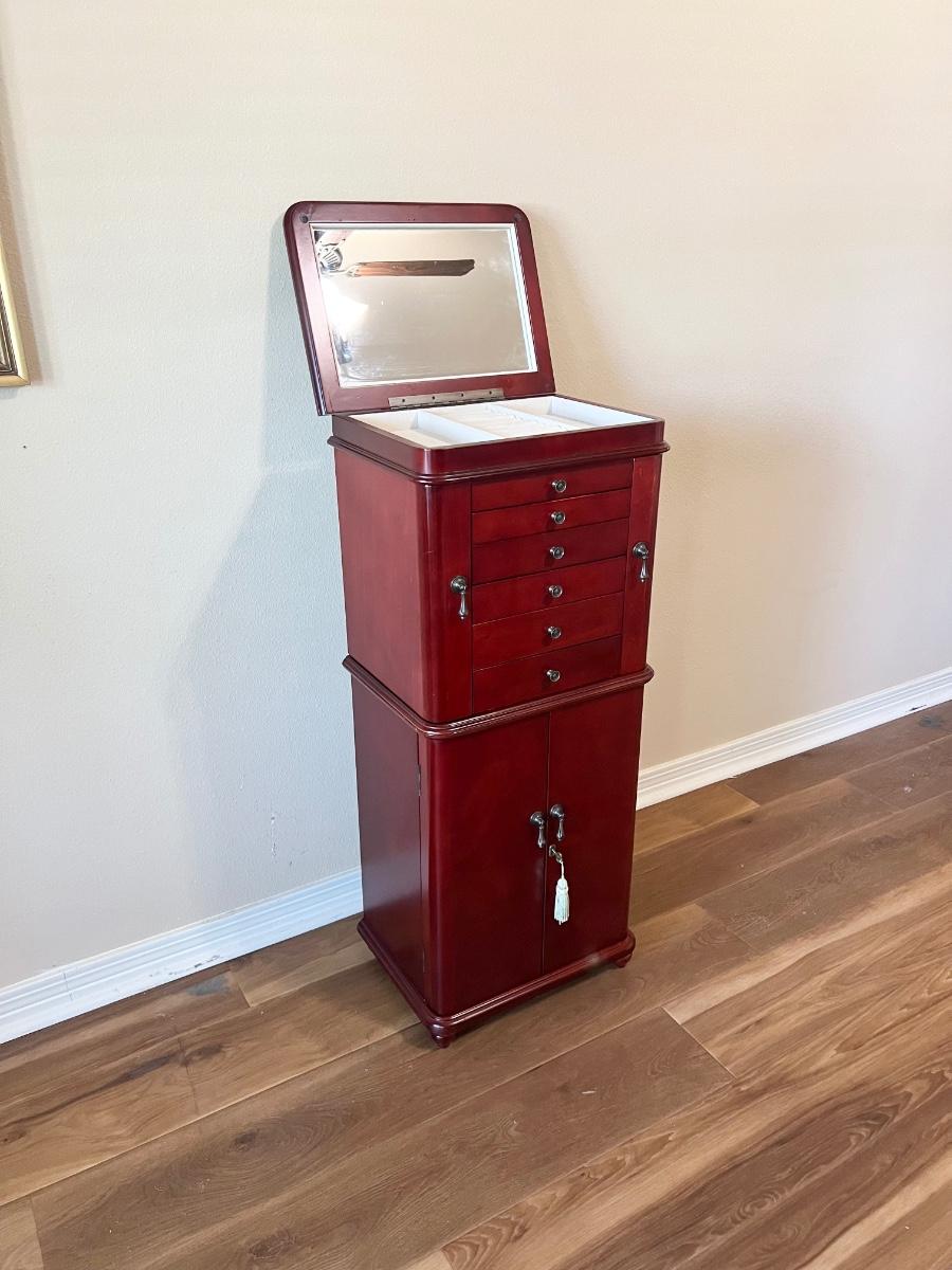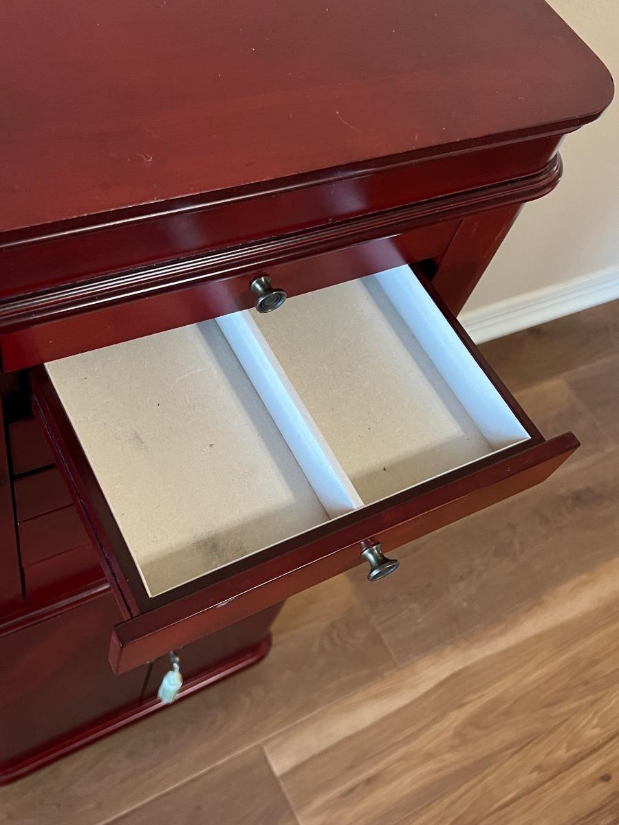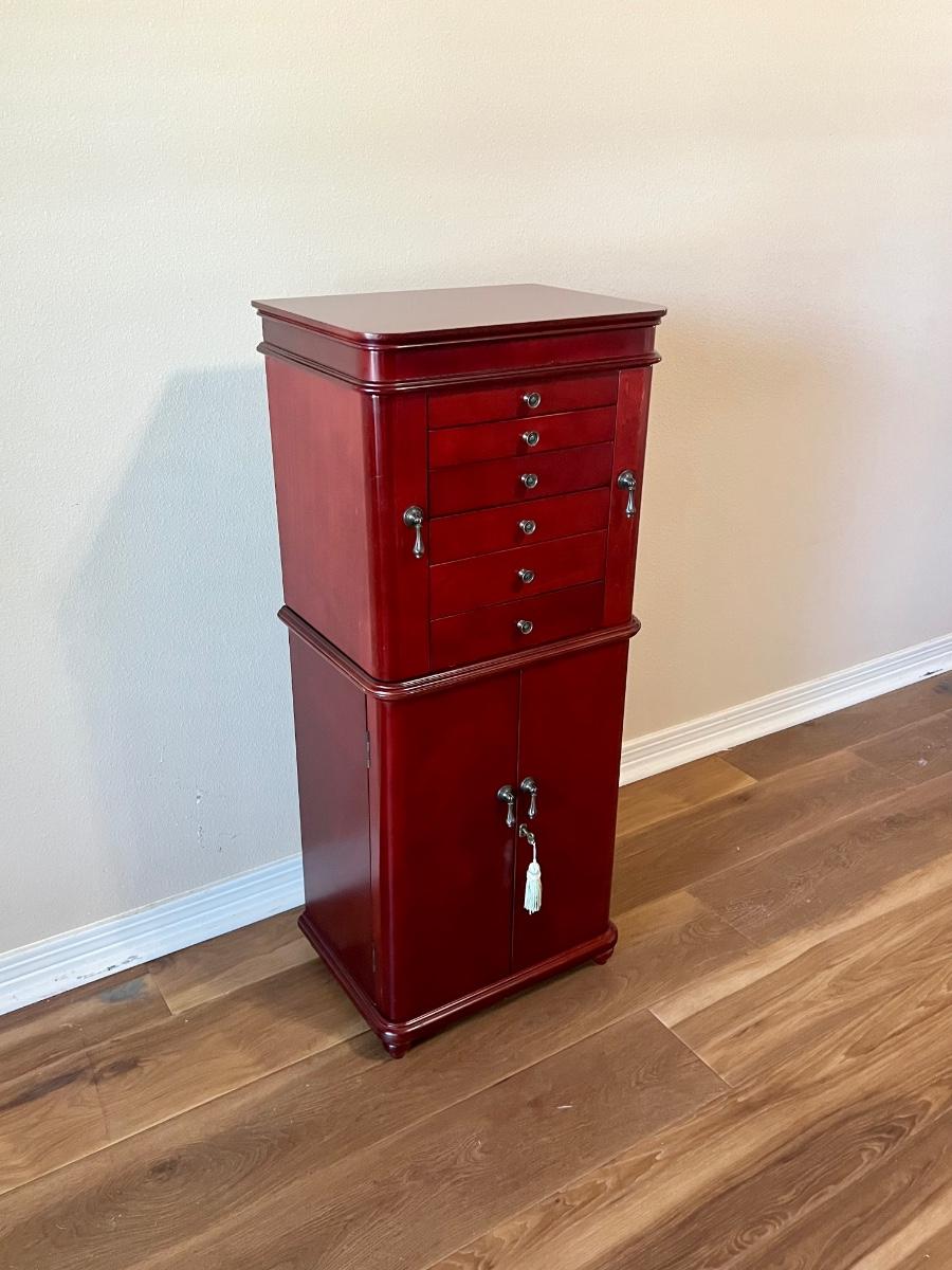 Drawers slide easy ~ No brand ~ Has key but does not lock, 2 bottom drawers behind cabinet doors are missing handles, see photos ~ 39.25” H x 16.5” W x 12” D