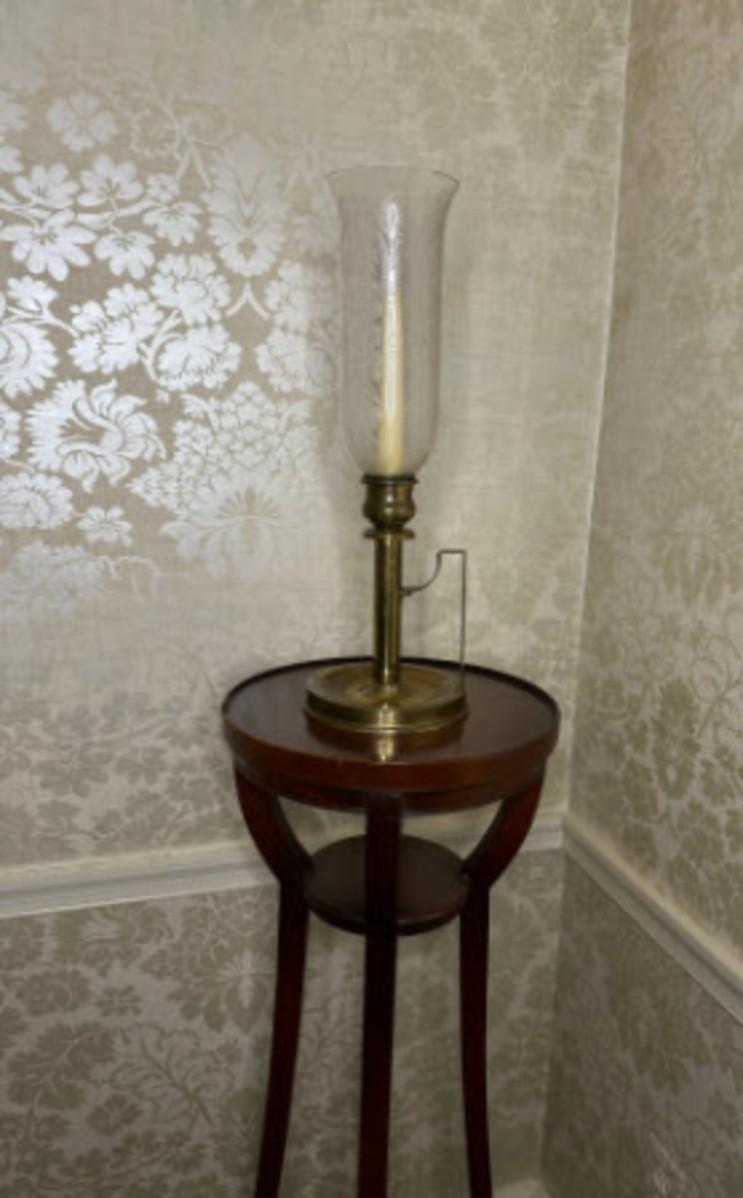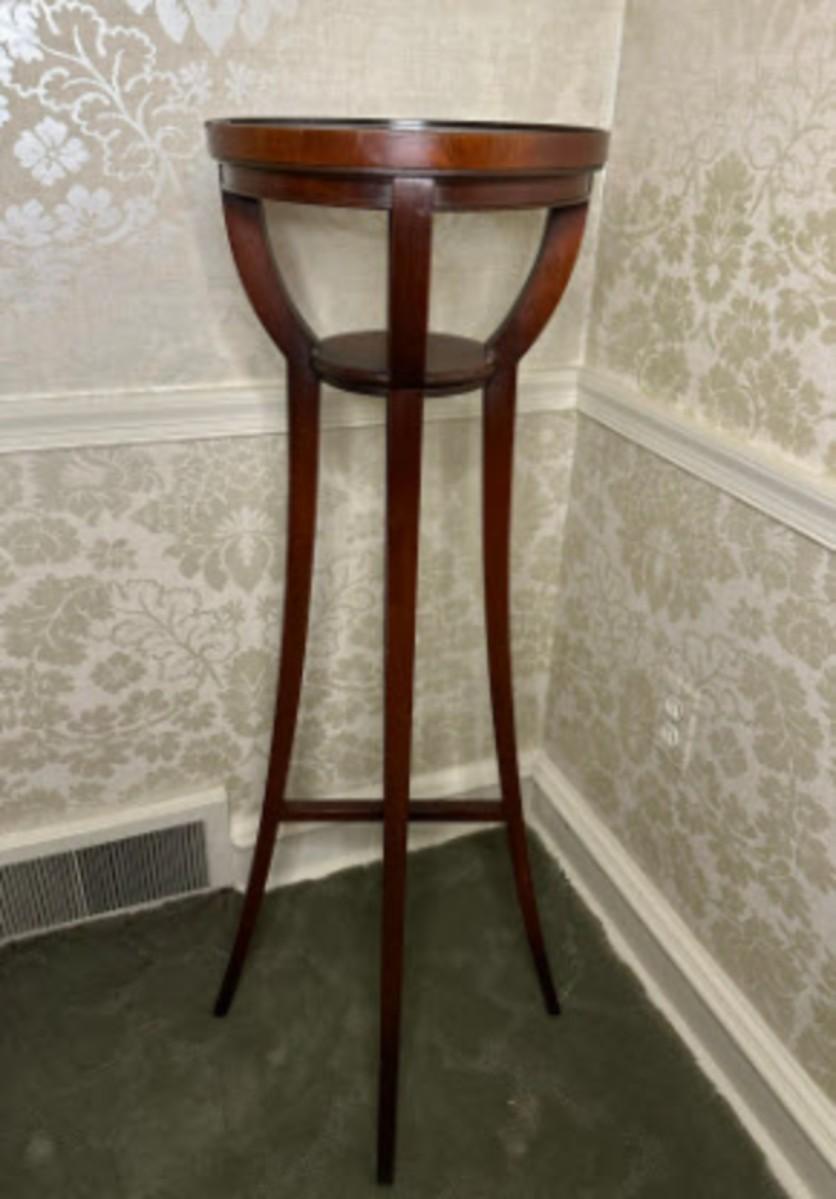 This tall mahogany stand rochere has mahogany wood with a small shelf underneath. Made in the Regency style. Excellent condition.