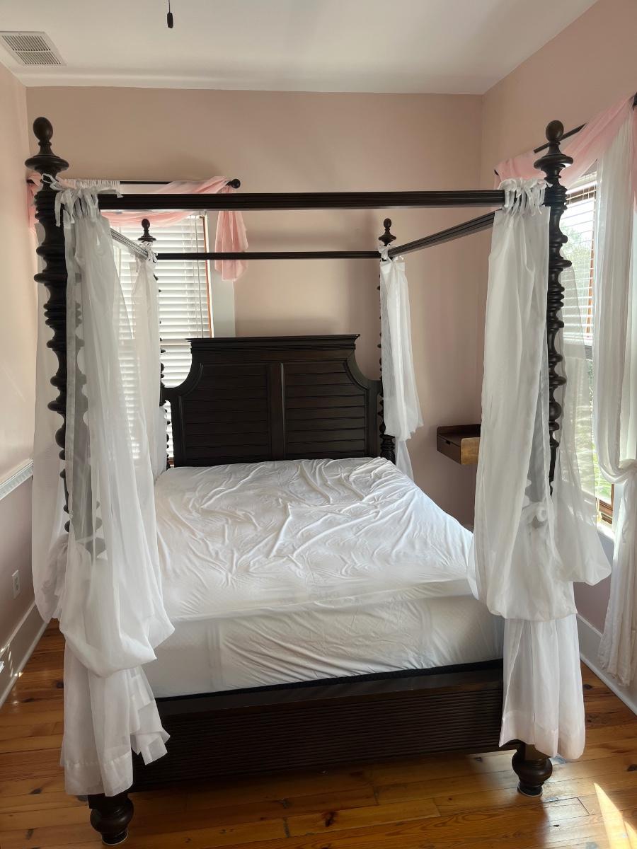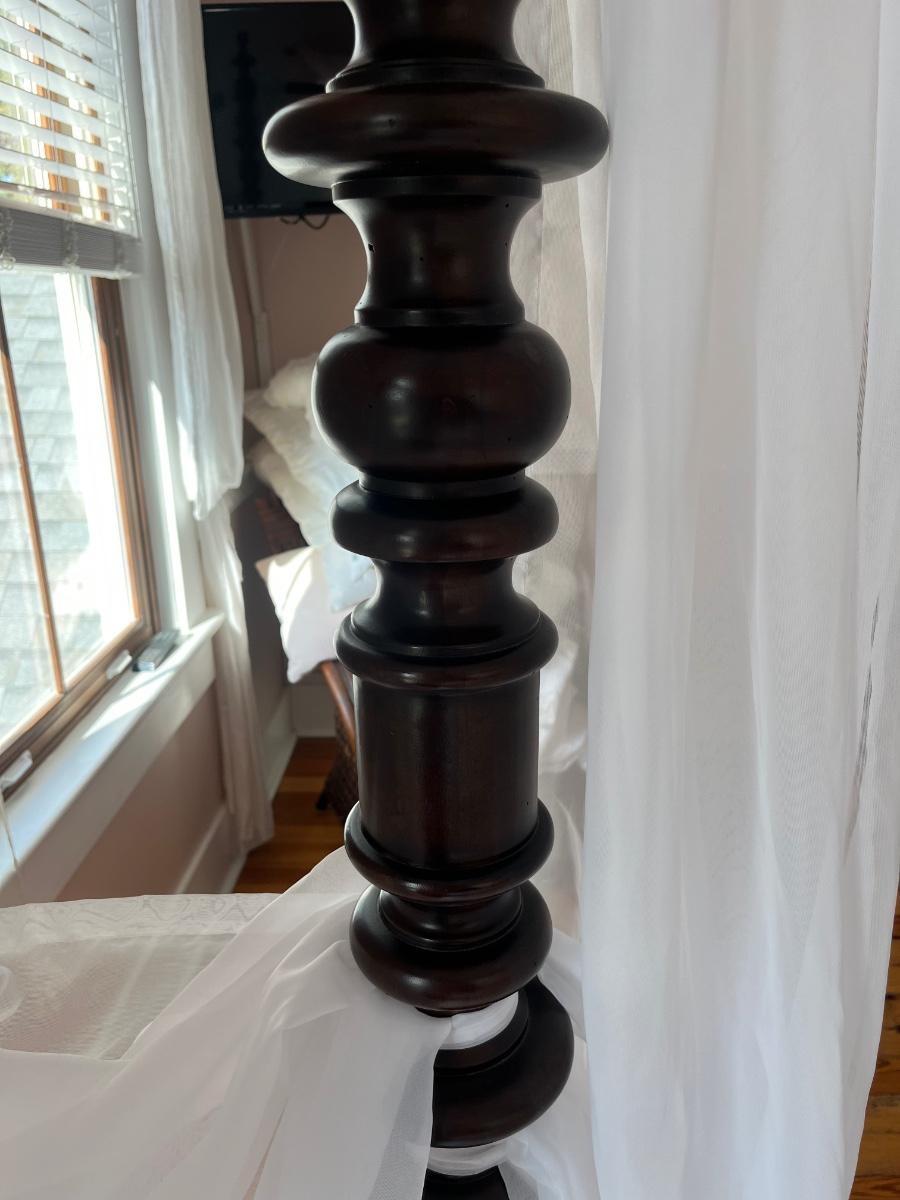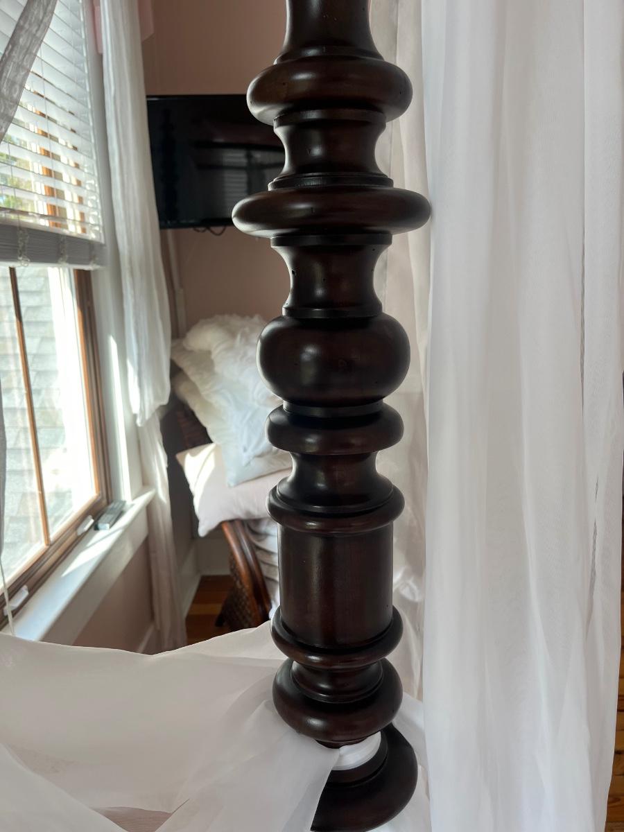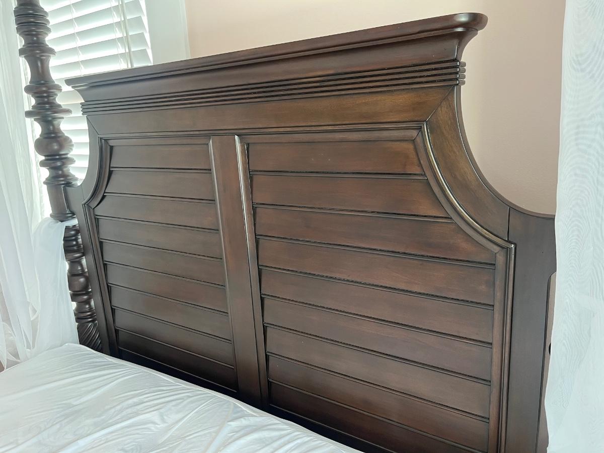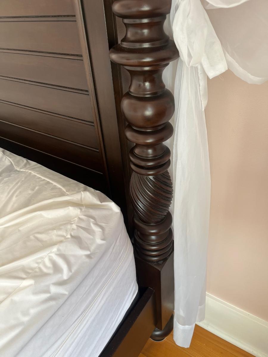 “Barbados” mahogany queen poster bed; with mattress; frame approx. 91" H x 64"; in good condition; available as frame only