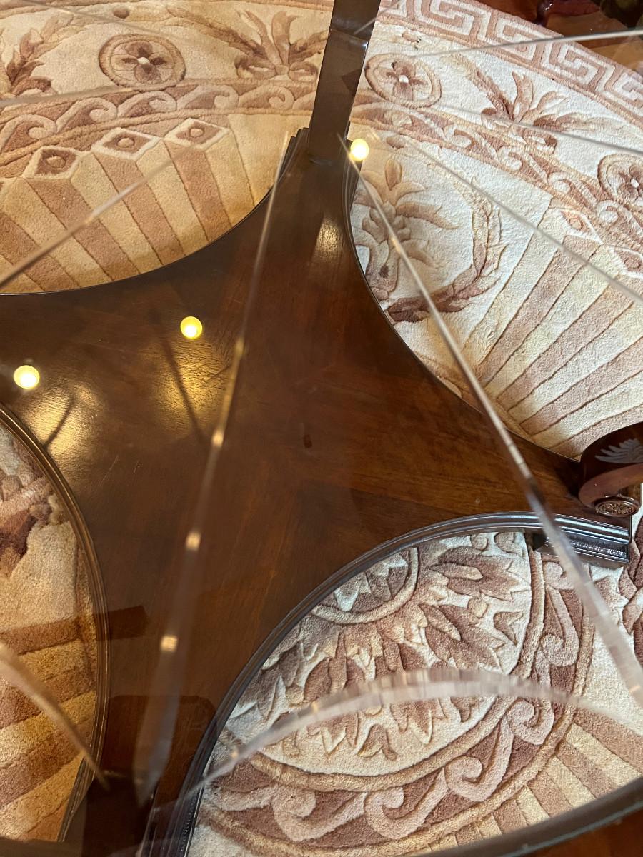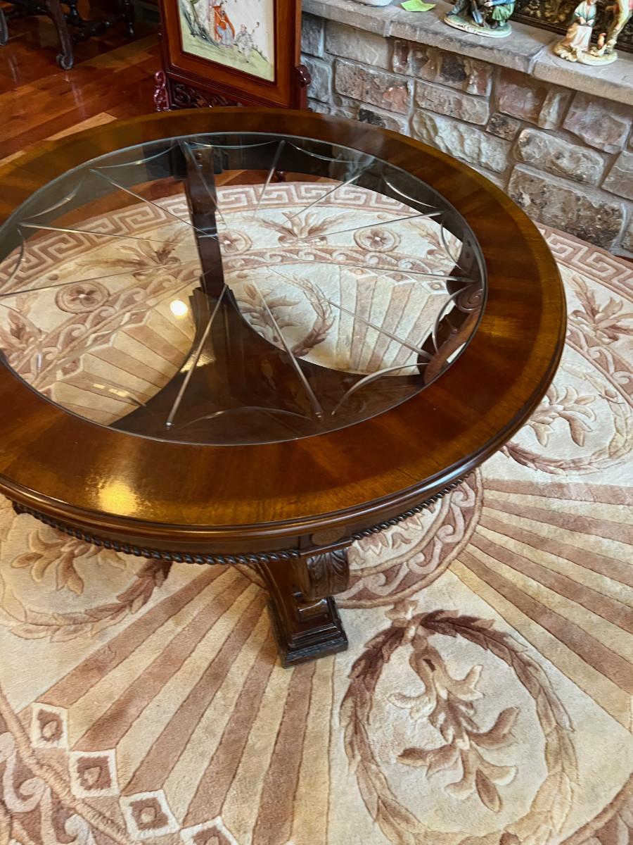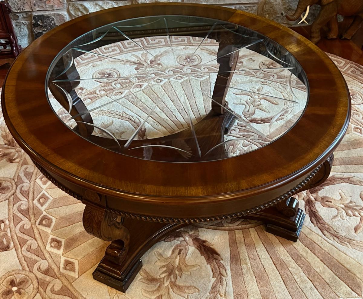 Mahogany Round Coffee Table with Cut Beveled Edge Glass Top