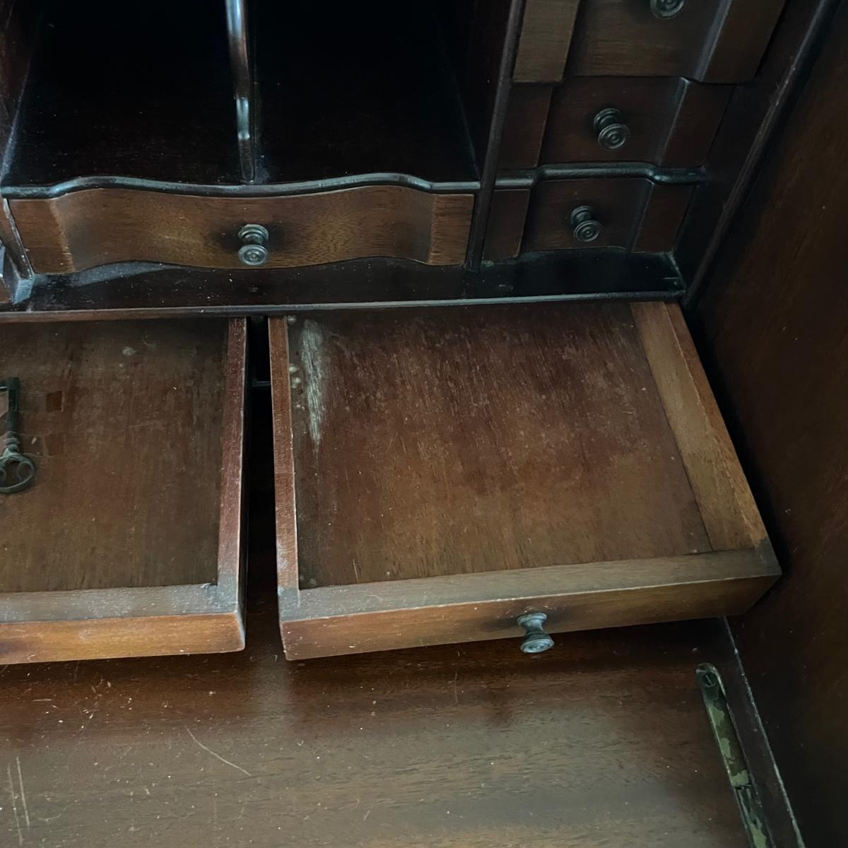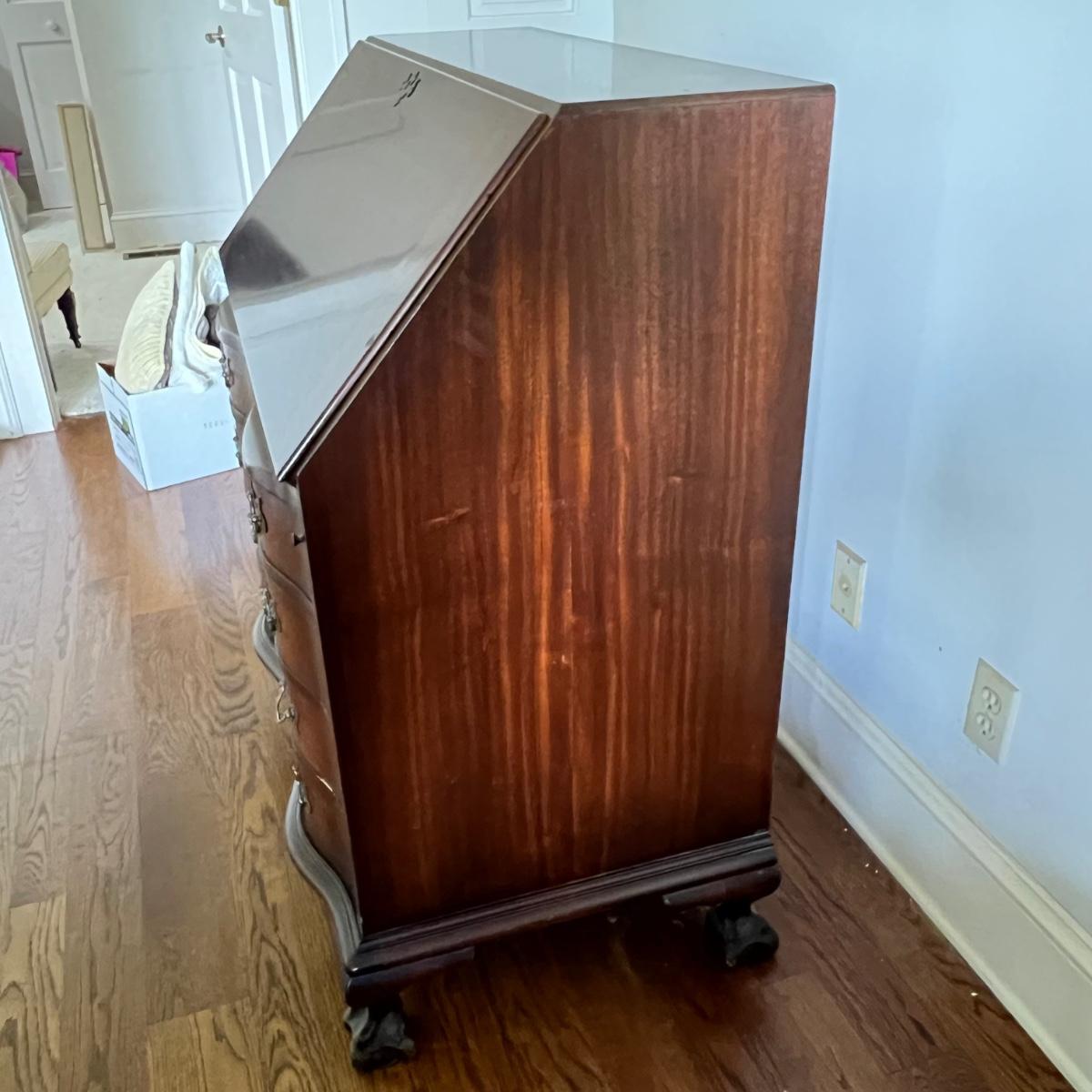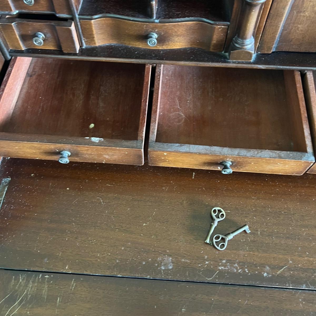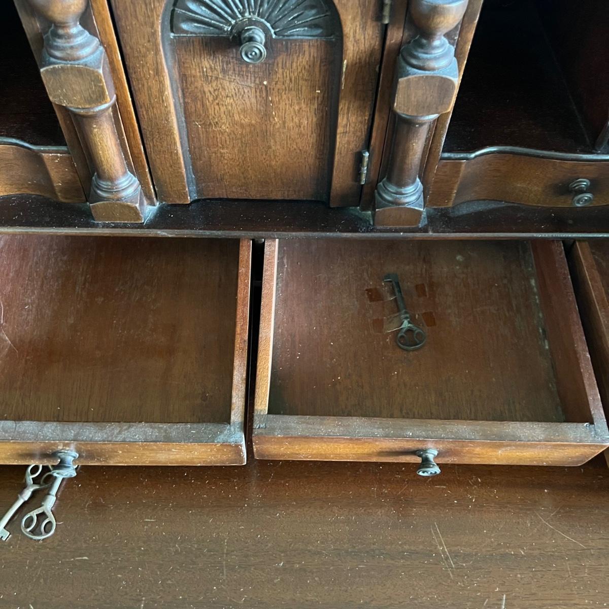 Lovely mahogany secretary with three working keys. This piece has four lockable doors and claw feet. It measures 36” x 20” x 42”H.