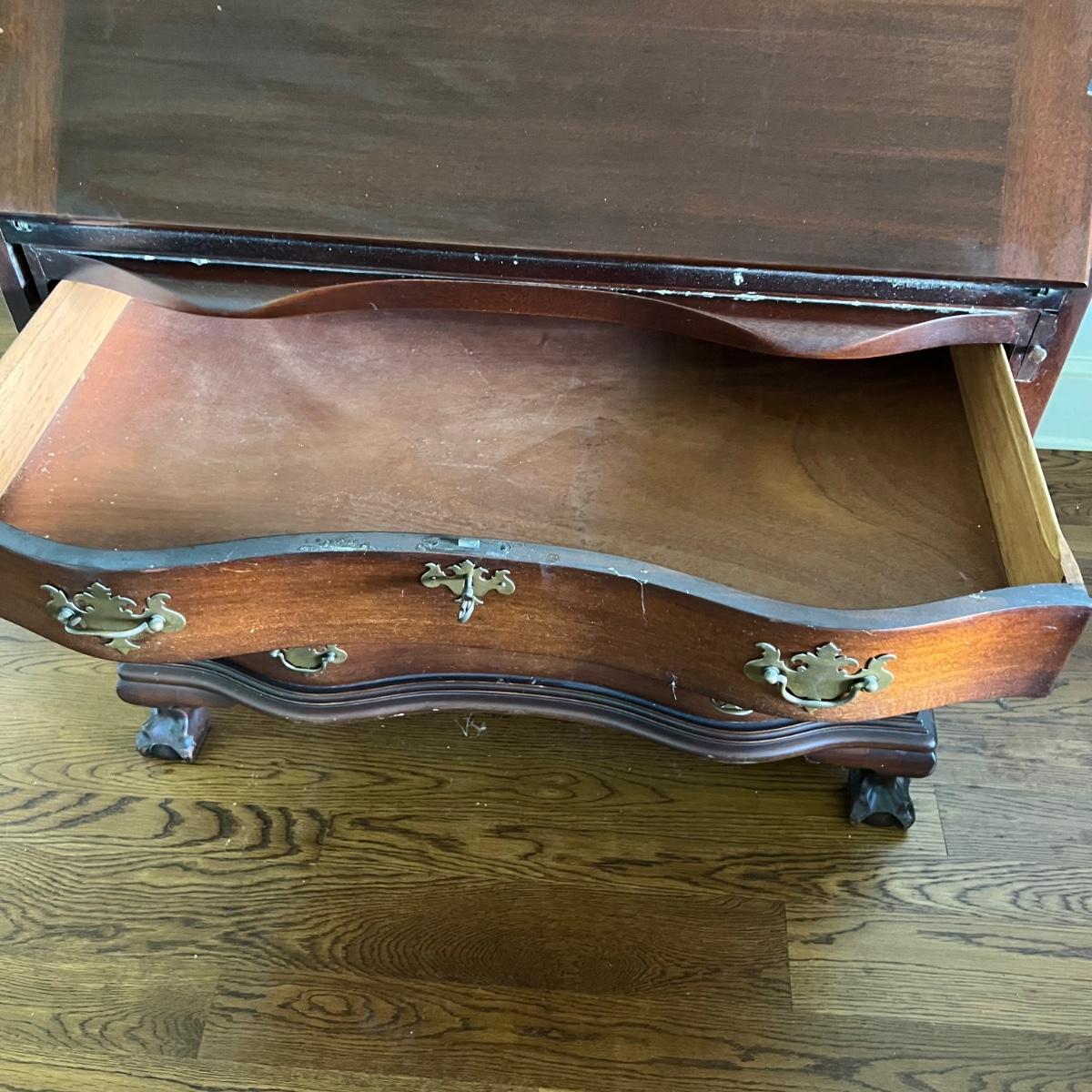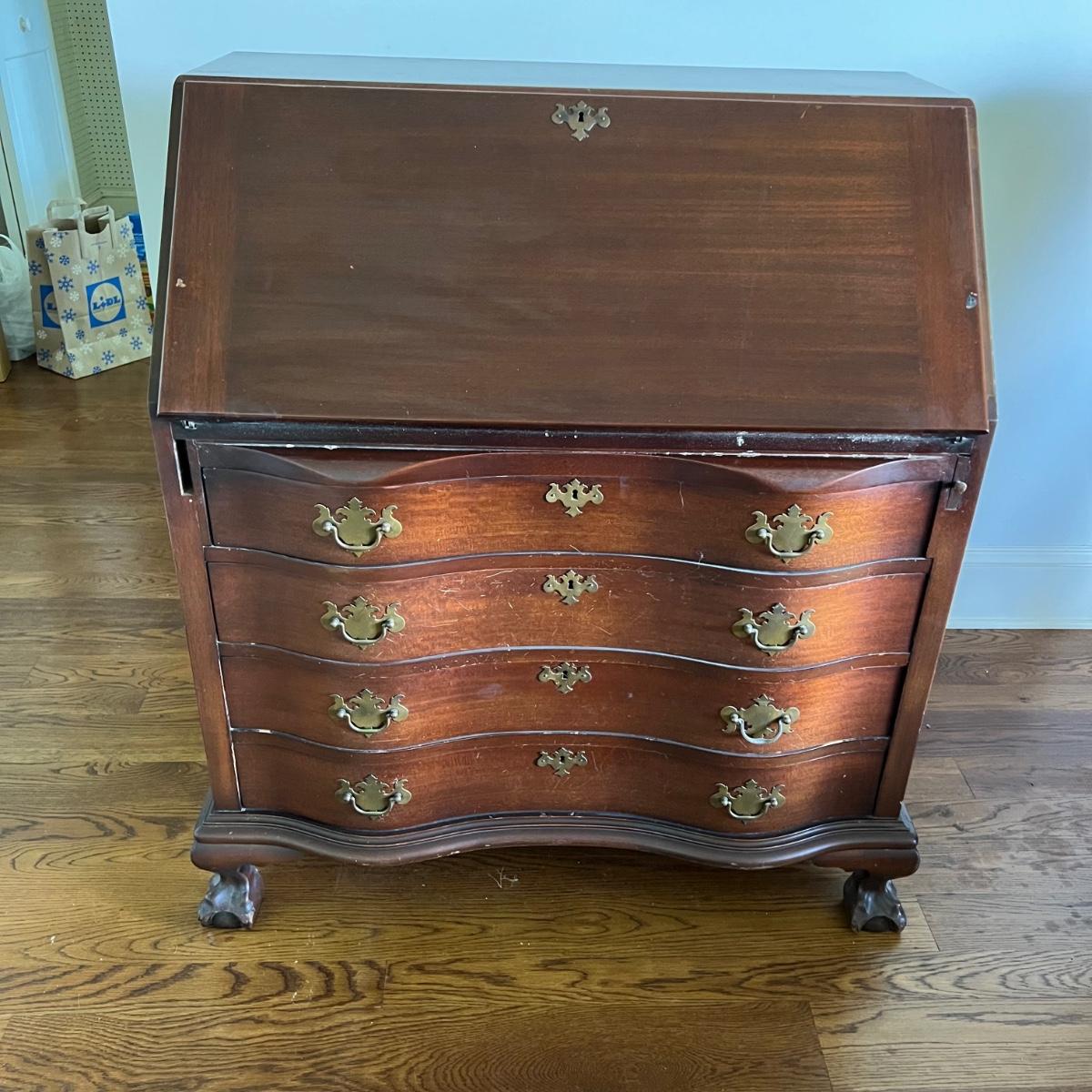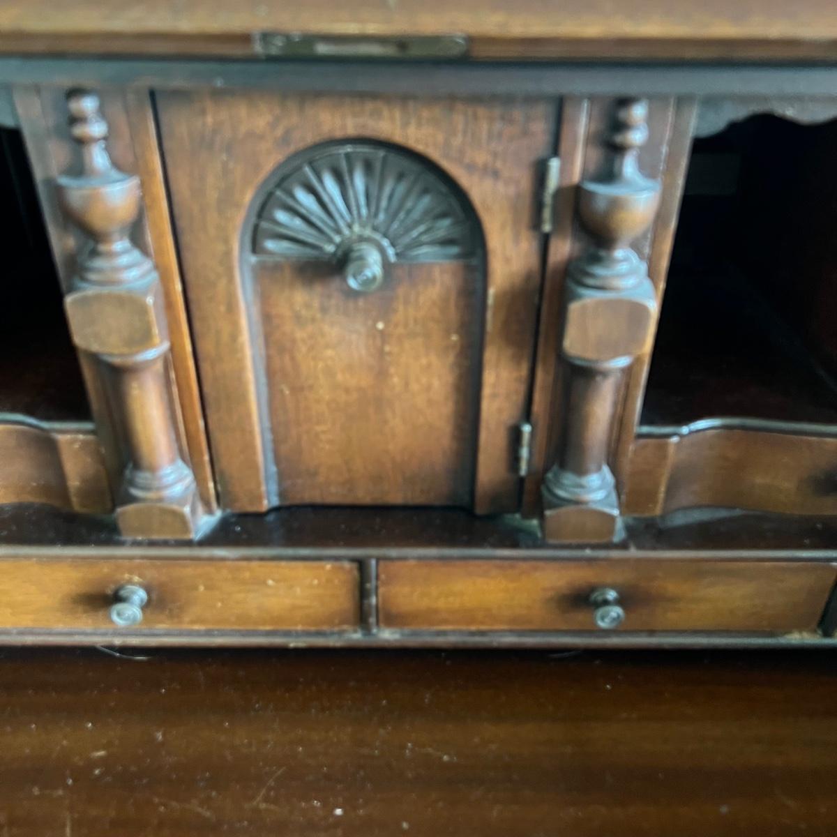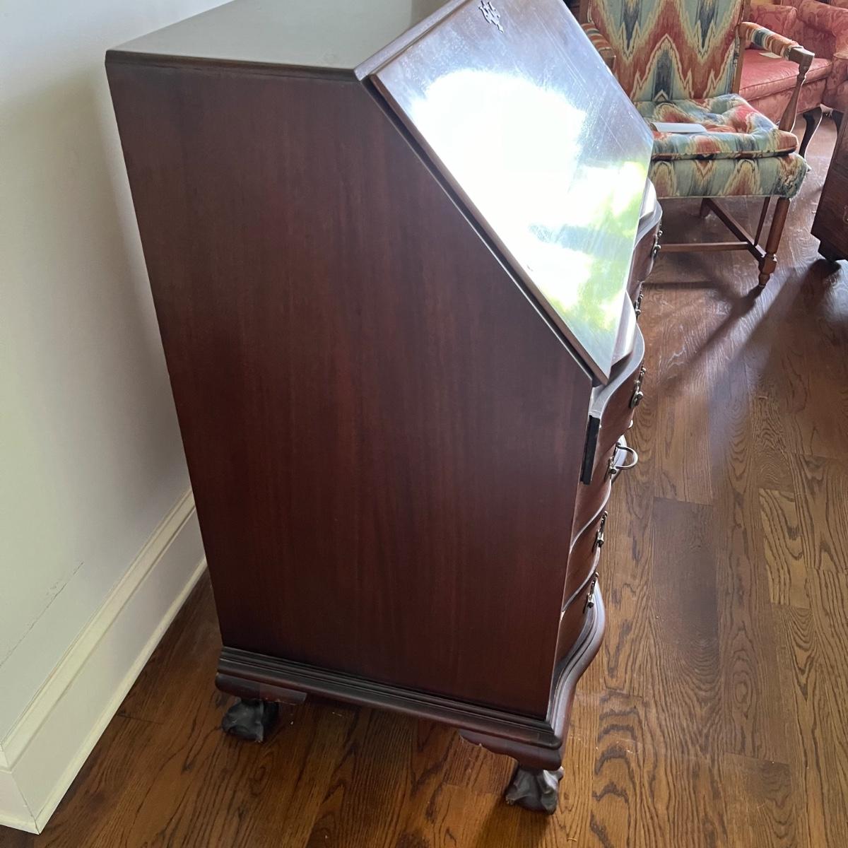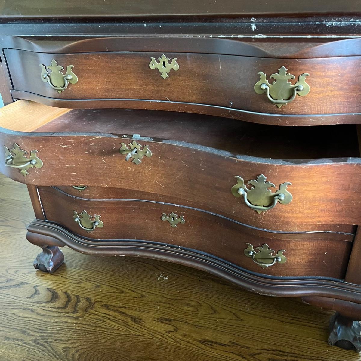 Lovely mahogany secretary with three working keys. This piece has four lockable doors and claw feet. It measures 36” x 20” x 42”H.