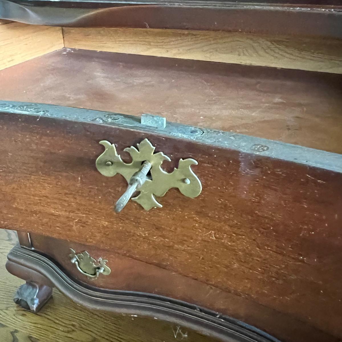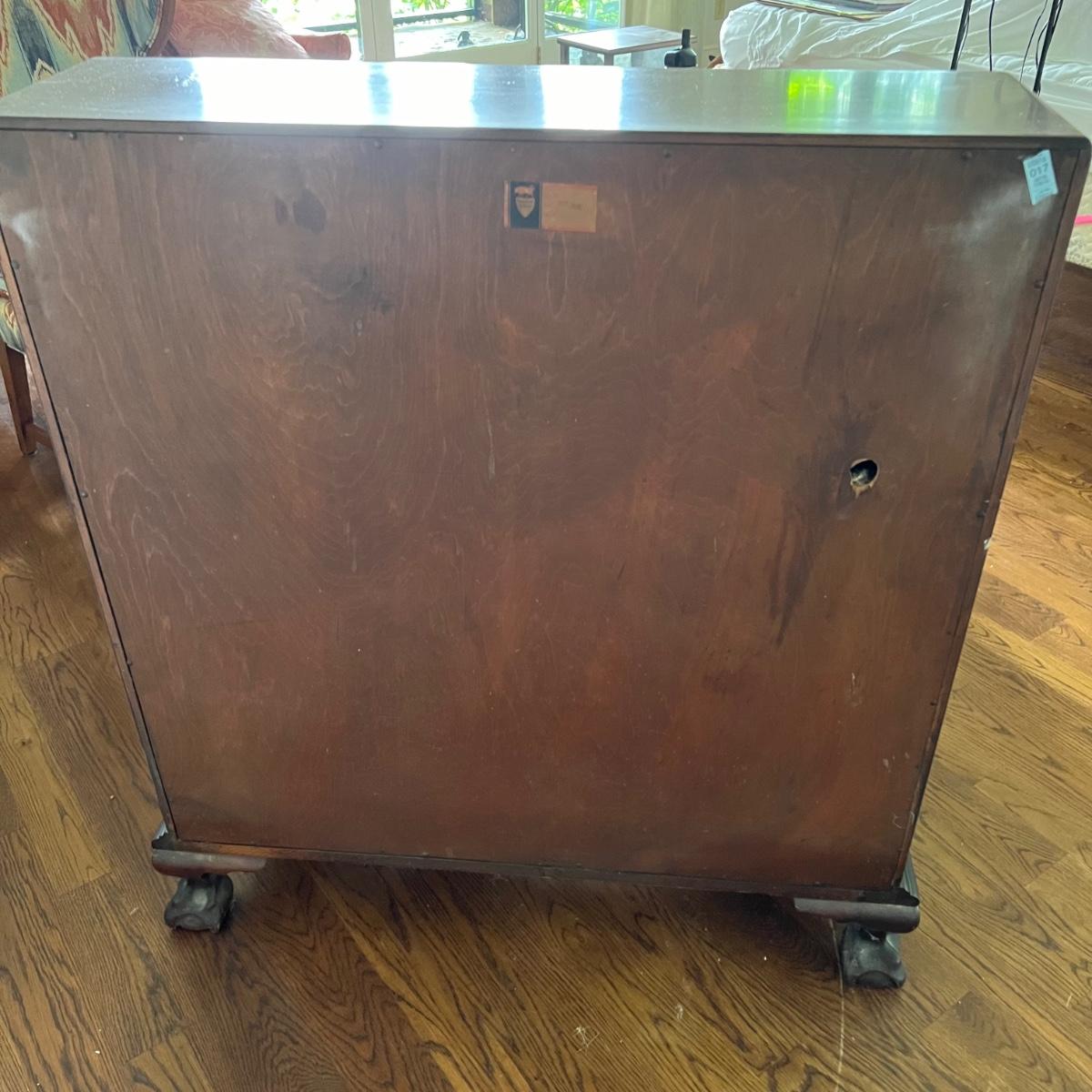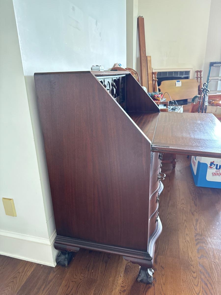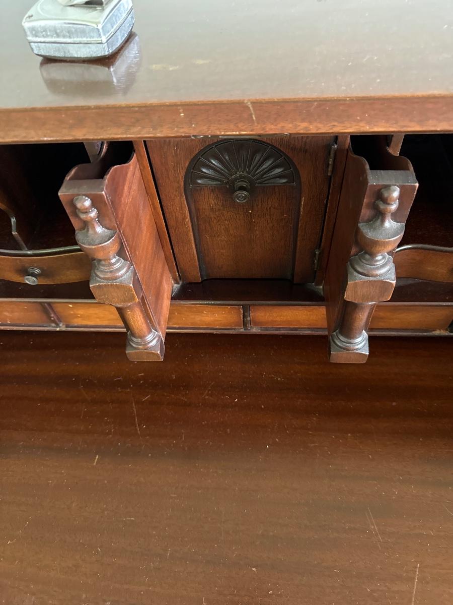 Lovely mahogany secretary with three working keys. This piece has four lockable doors and claw feet. It measures 36” x 20” x 42”H.
