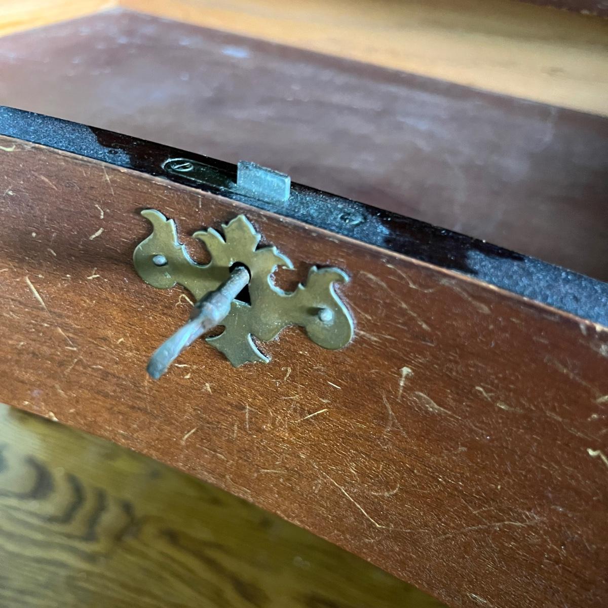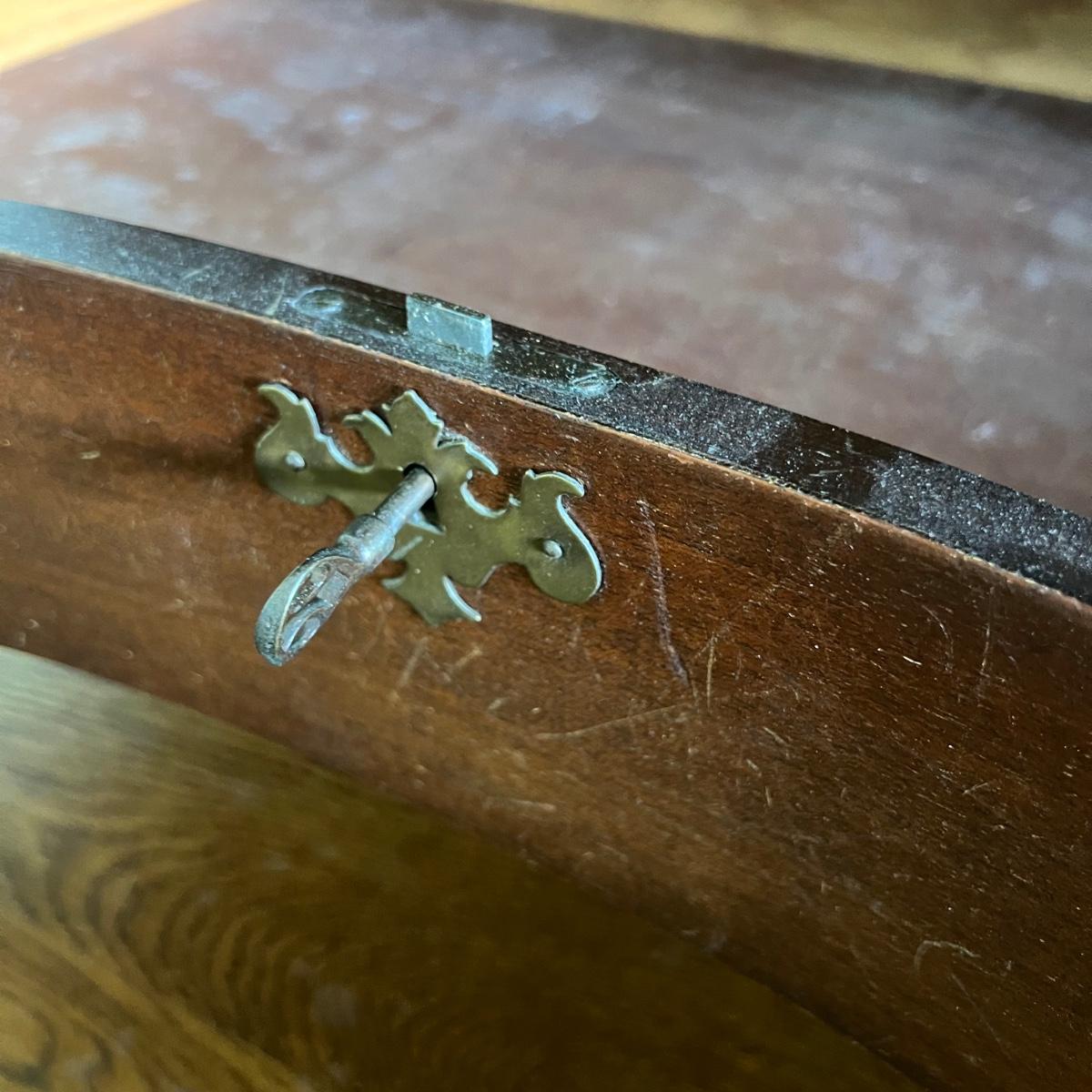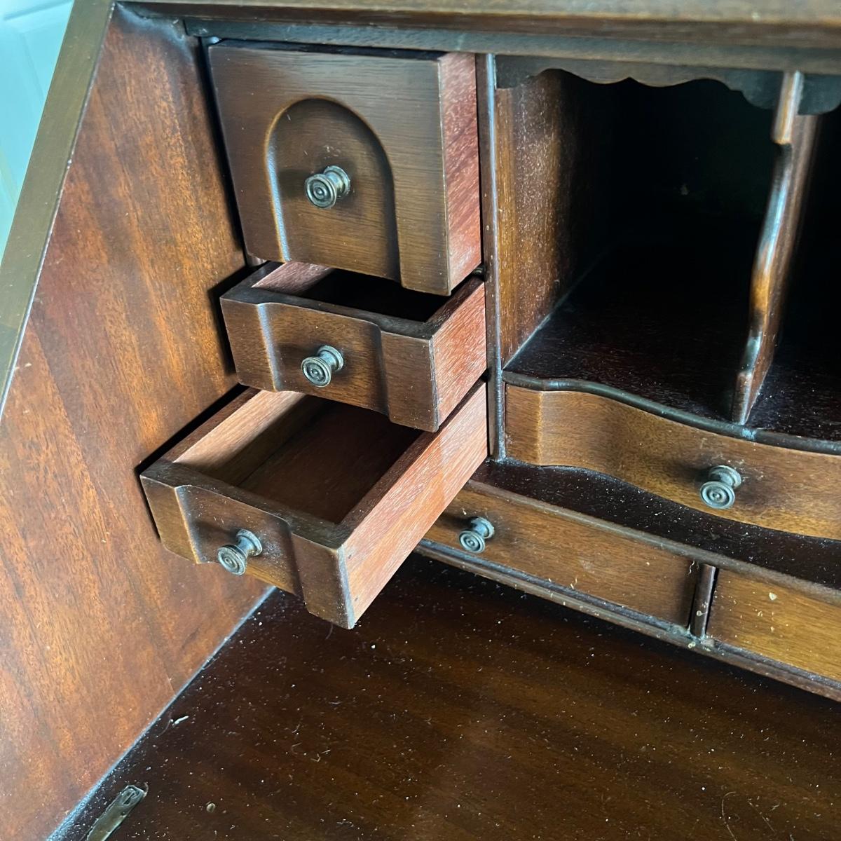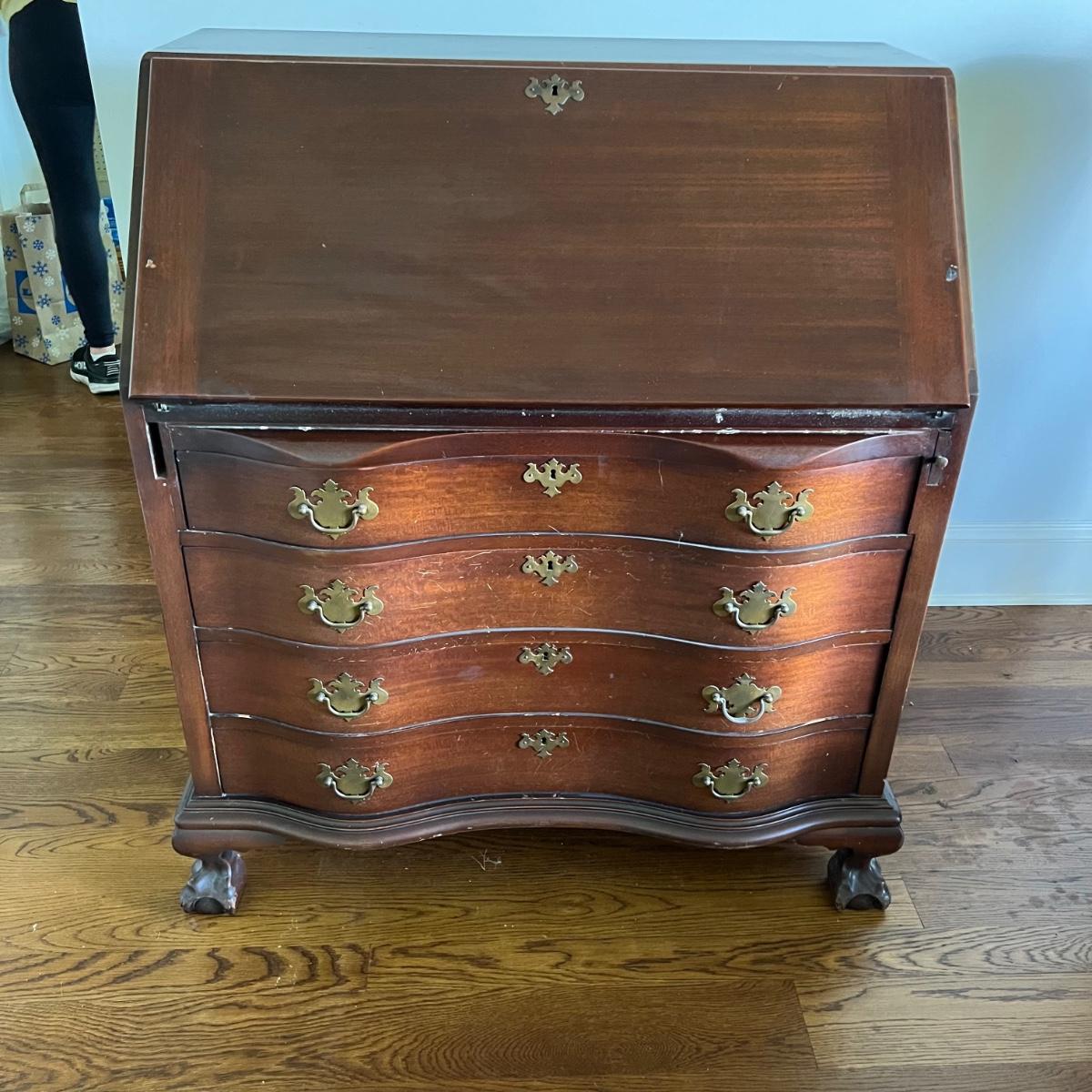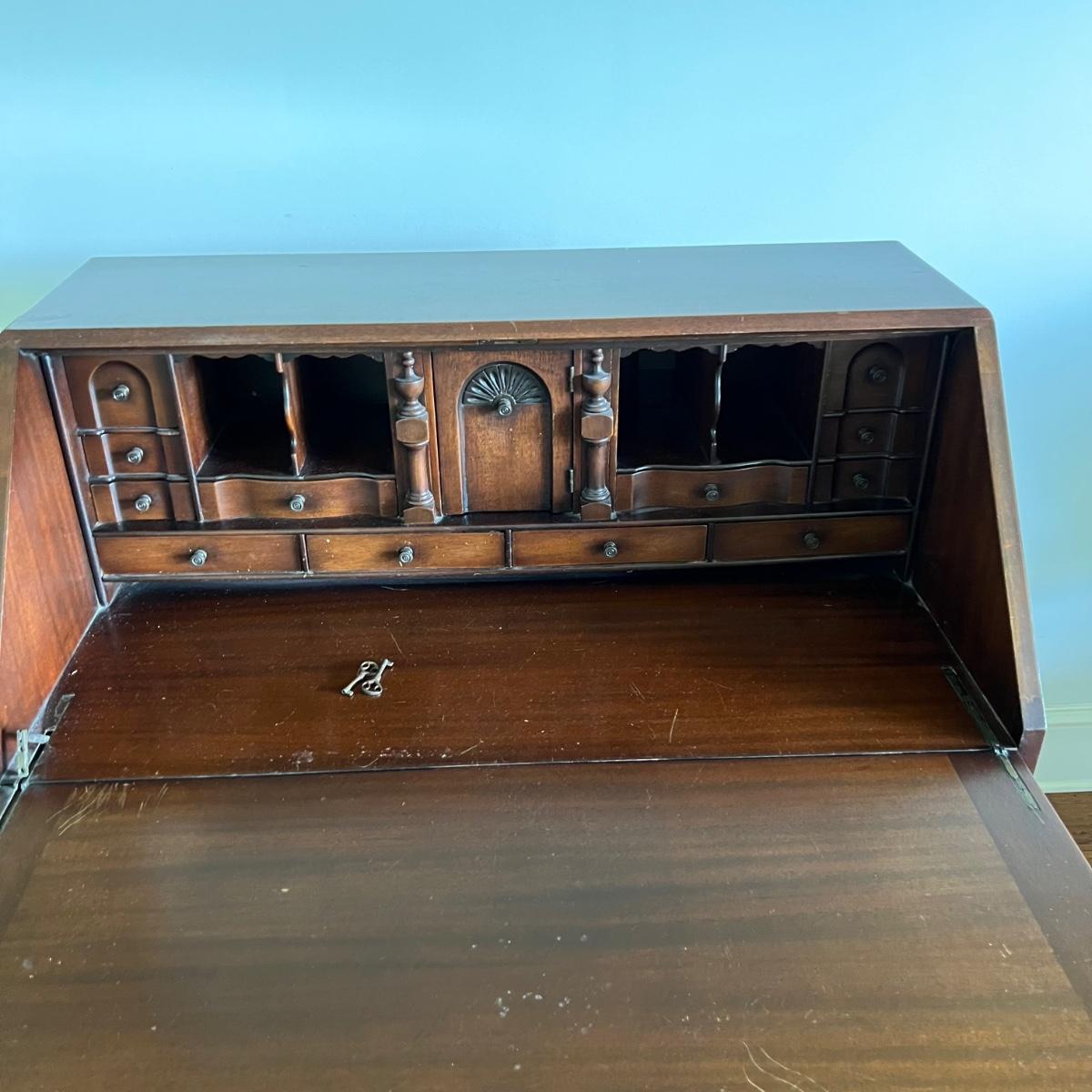 Lovely mahogany secretary with three working keys. This piece has four lockable doors and claw feet. It measures 36” x 20” x 42”H.